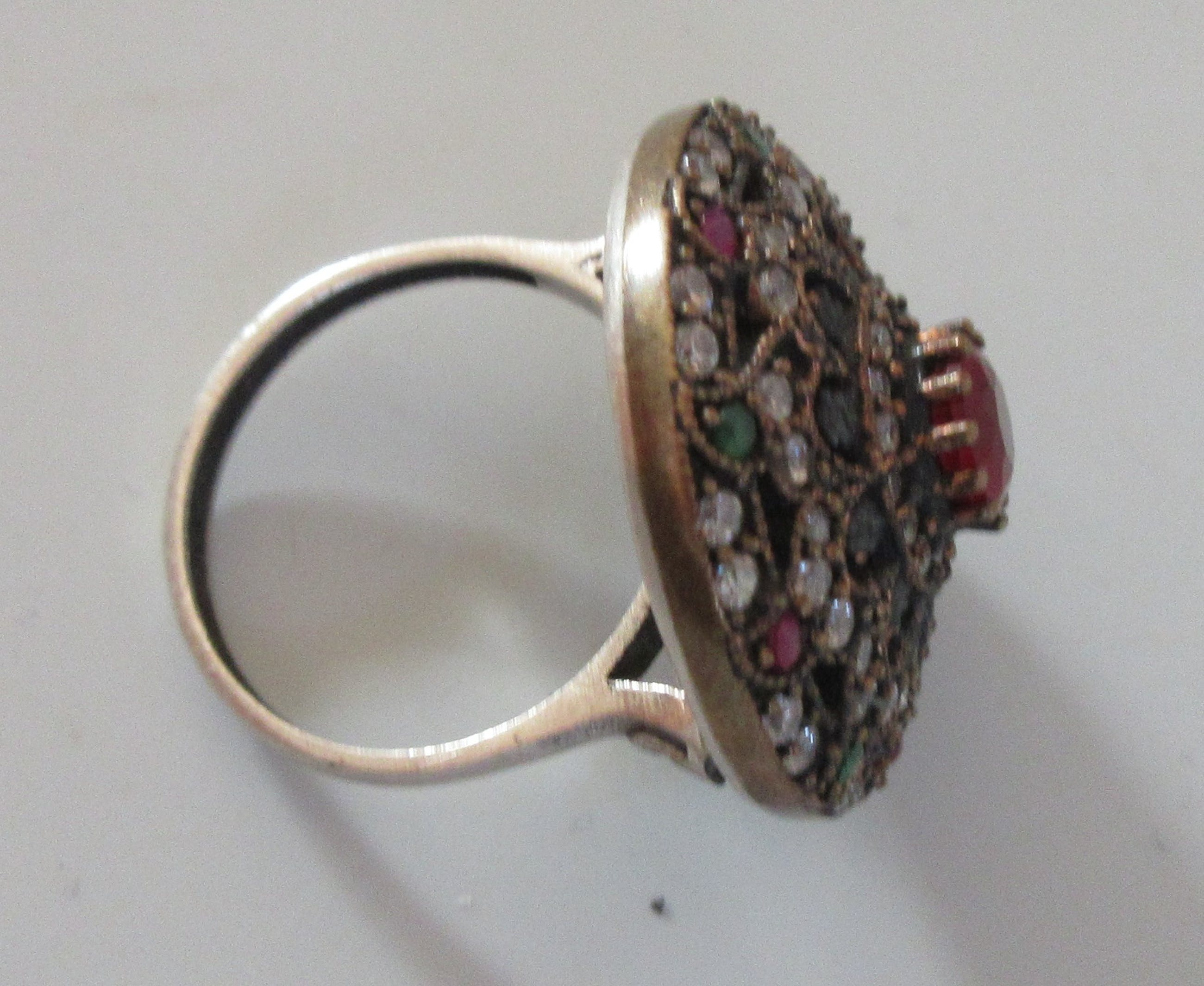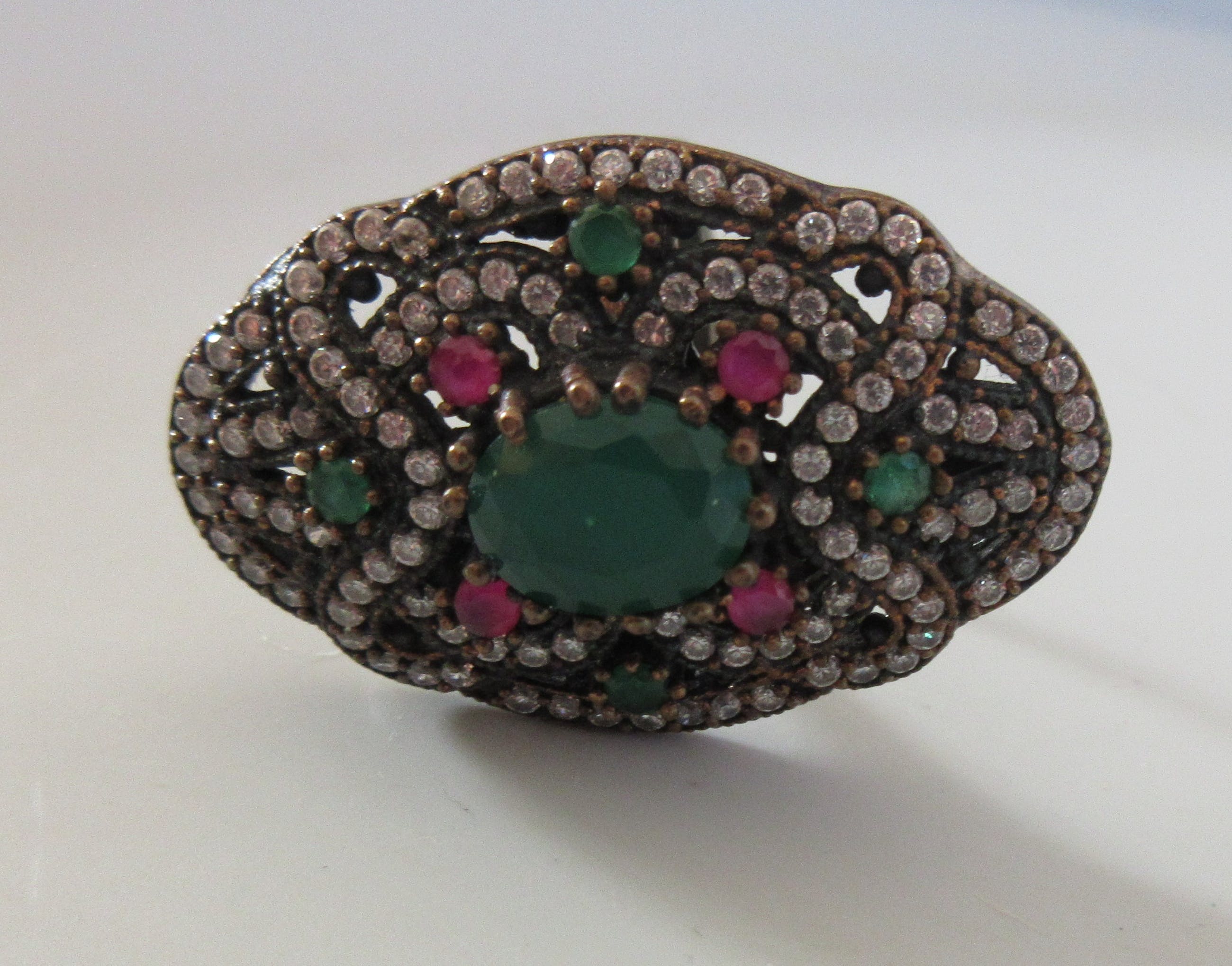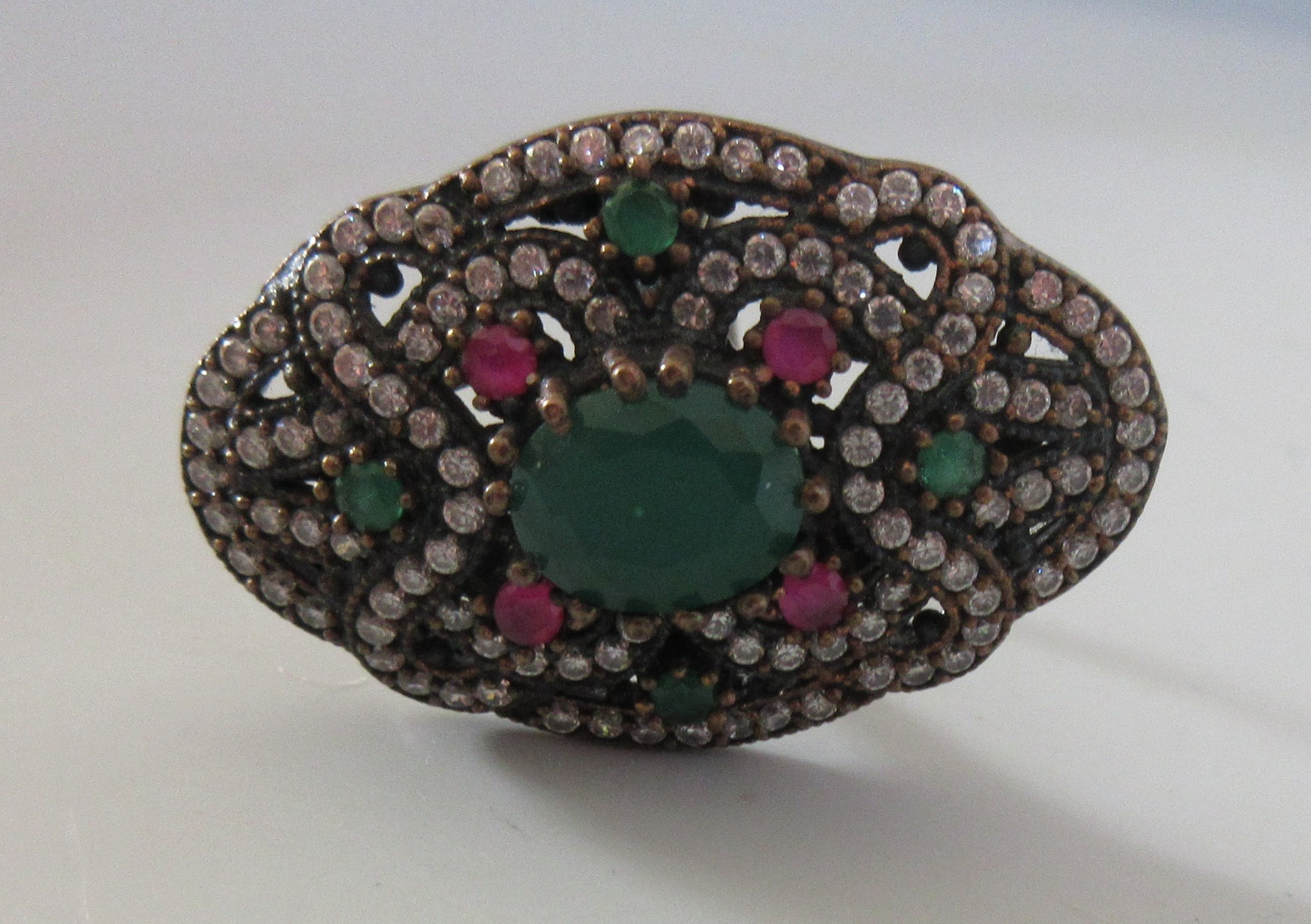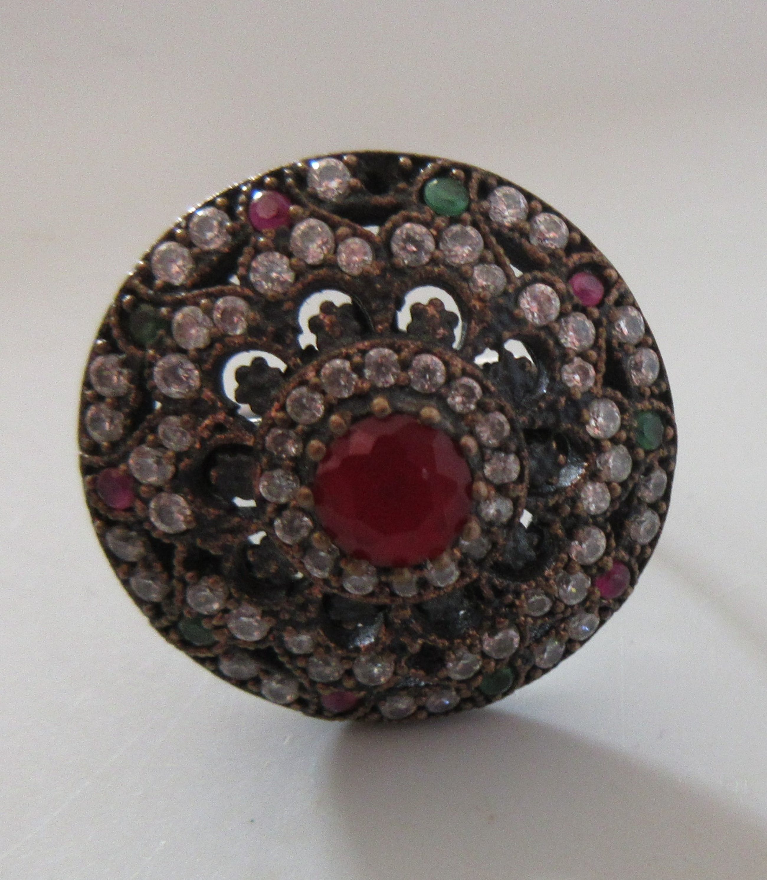 Antieke zilveren Afghaanse Kuchi Halsketting met hanger en twee ringen. In zeer goede gebruikte conditie, de ronde ring mist drie steentjes. De halsketting is van eerste gehalte .925 zilver en de de hangers zijn bezet met witte diamantvormige en roze steentjes. Er is een ovale ring en een ronde ring beide hebben ringmaat 56 = 55,9 - 56,9 omtrek in mm. De ronde ring heeft als hoofdsteen een rode steen op de vier hoeken vier groene en roze steentjes en verder voorzien diamantvormige steentjes. De ovale ring heeft als hoofdsteen een groene steen en is daaromheen ook voorzien van vier groene en vier roze steentjes en is voor de rest ook bezet met diamantvormige steentjes. De ringen zijn van eerste gehalte zilver en voorzien van ingedrukte keur .925.
