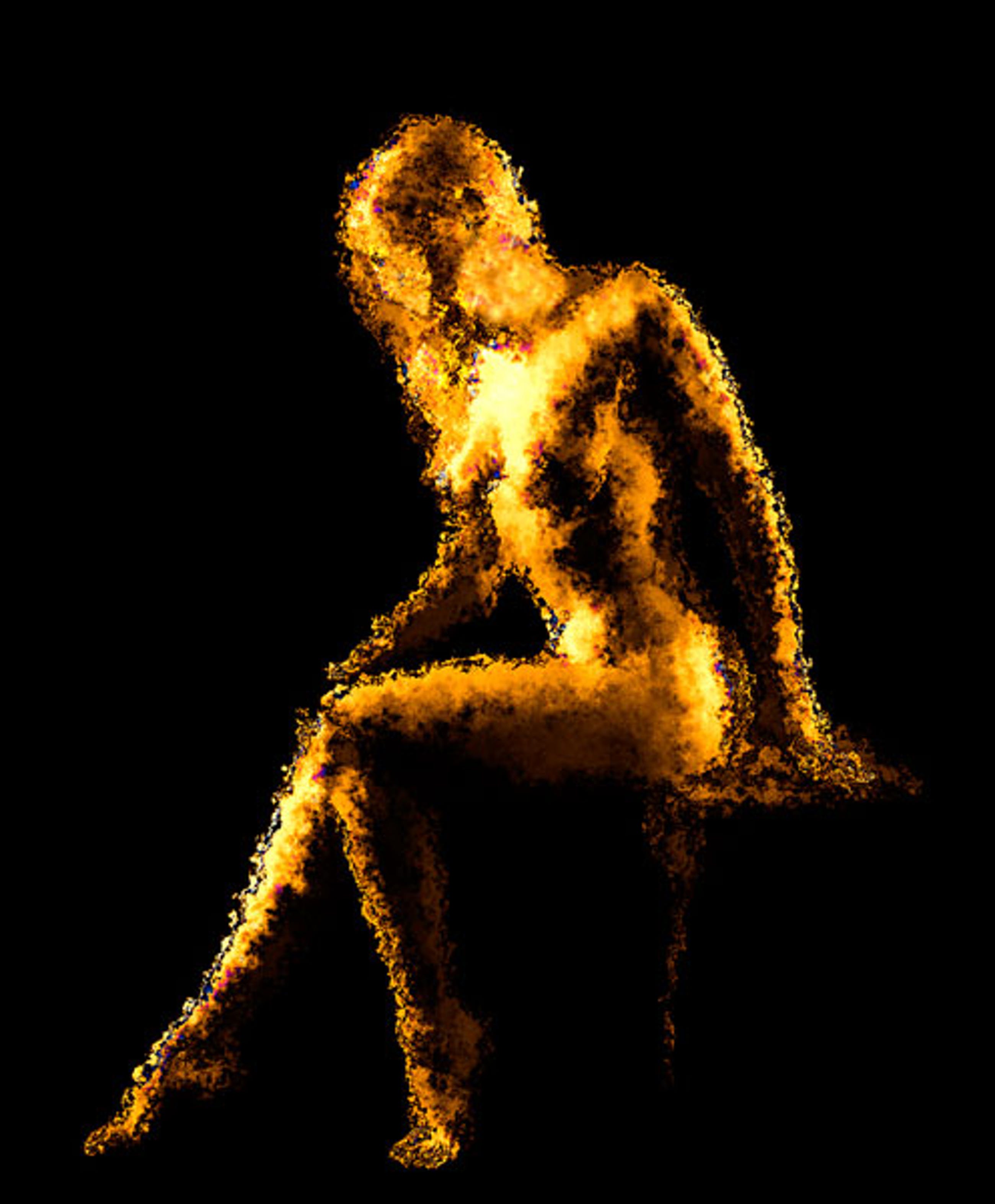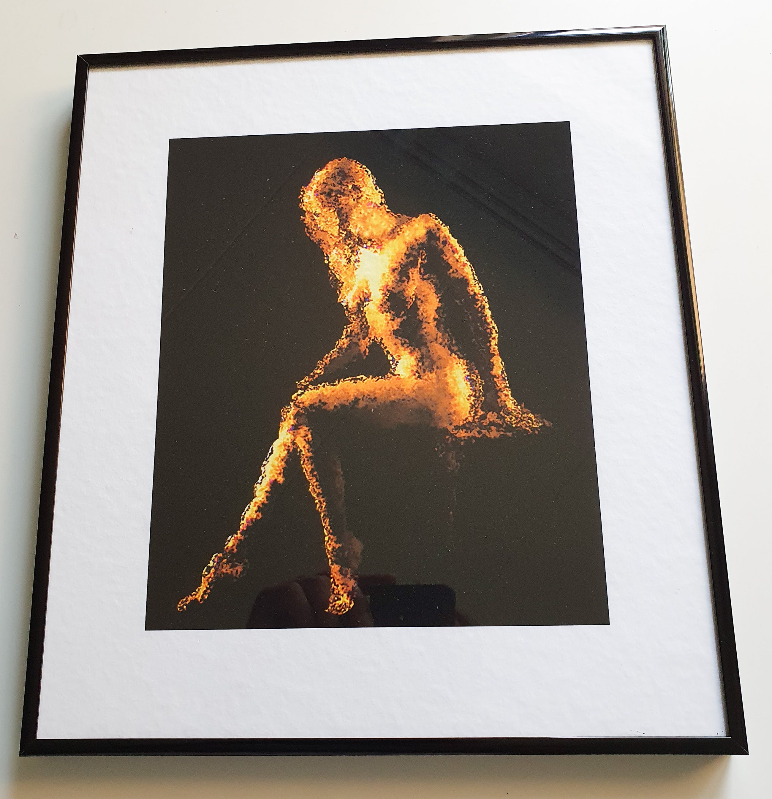 Zeer fraaie, suggestieve en ja, toch wel erotisch getinte digitale print van een naaktmodel teruggebracht tot geelgouden pixels (met schaduw/contrast) tegen een zwarte achtergrond. Deze digitale print is uitgevoerd op 285 grams Torchon papier (handgeschept). Fraai doch eenvoudig gelijst in een glanzend zwart metalen lijst.