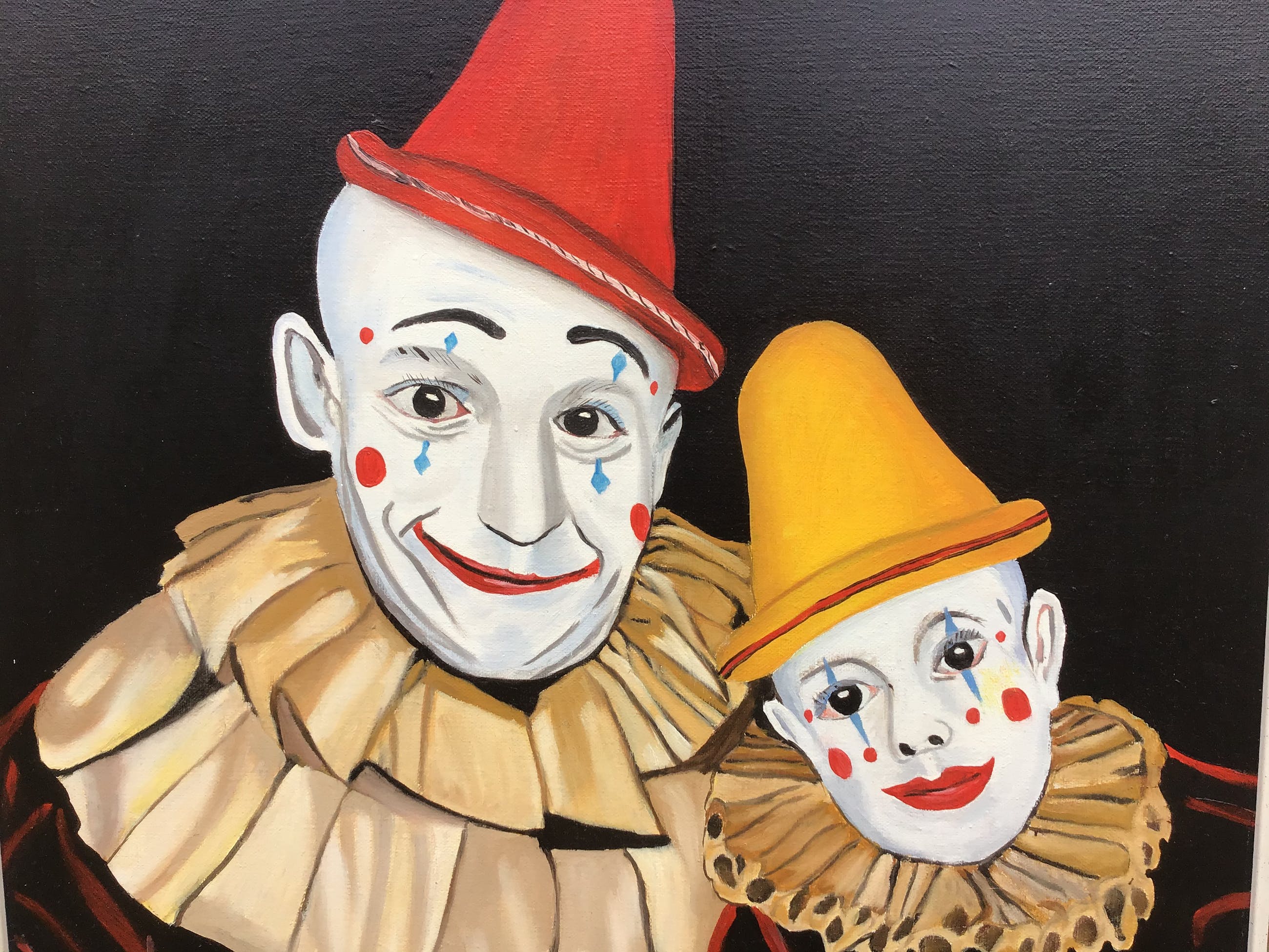 Bijzonder dubbelportret van twee clowns. Vreemd sfeertje. Geen slijtage, keurig ingelijst. Bij evt. koop is bezorgen tegen vergoeding een optie.