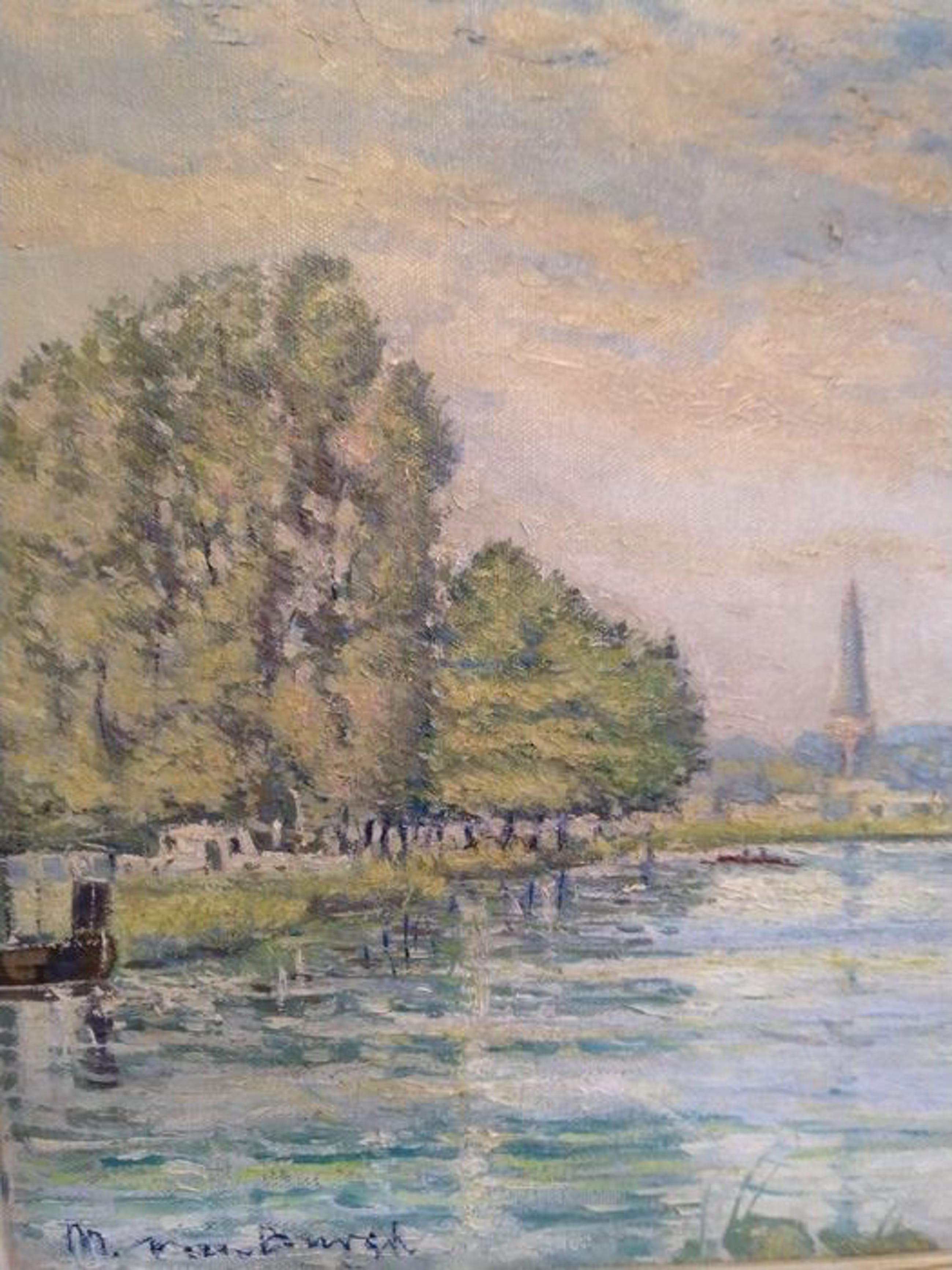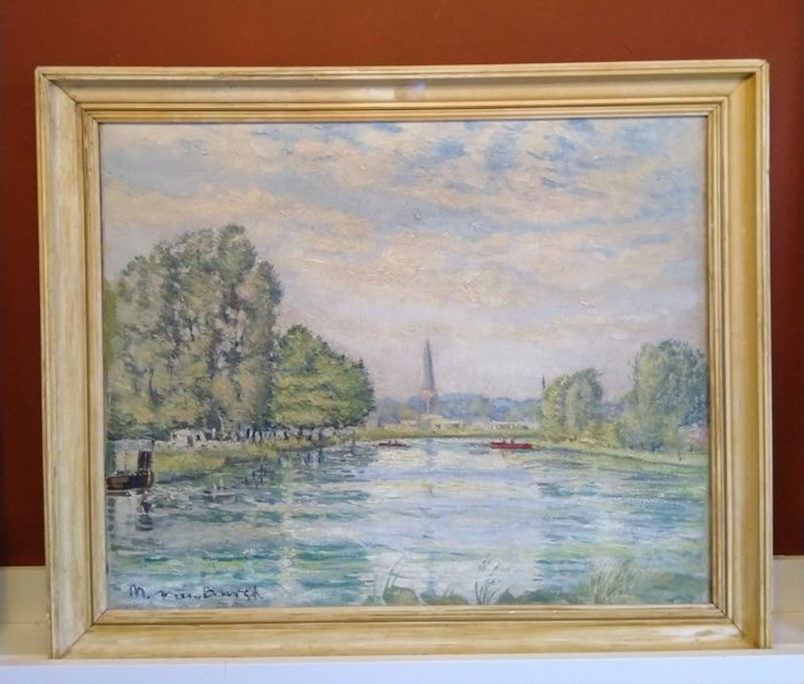 Prachtig impressionistisch werk, "Zomer a/d Vliet, toren van Voorschoten o/d achtergrond" 1958. Ik kan de signatuur niet goed ontcijferen het lijkt op van Burgh, maar dit kan ik niet met zekerheid stellen, Het schilderij is in zeer goede staat zie foto's deze zijn onderdeel van de omschrijving. De lijst is aan vervanging toe.