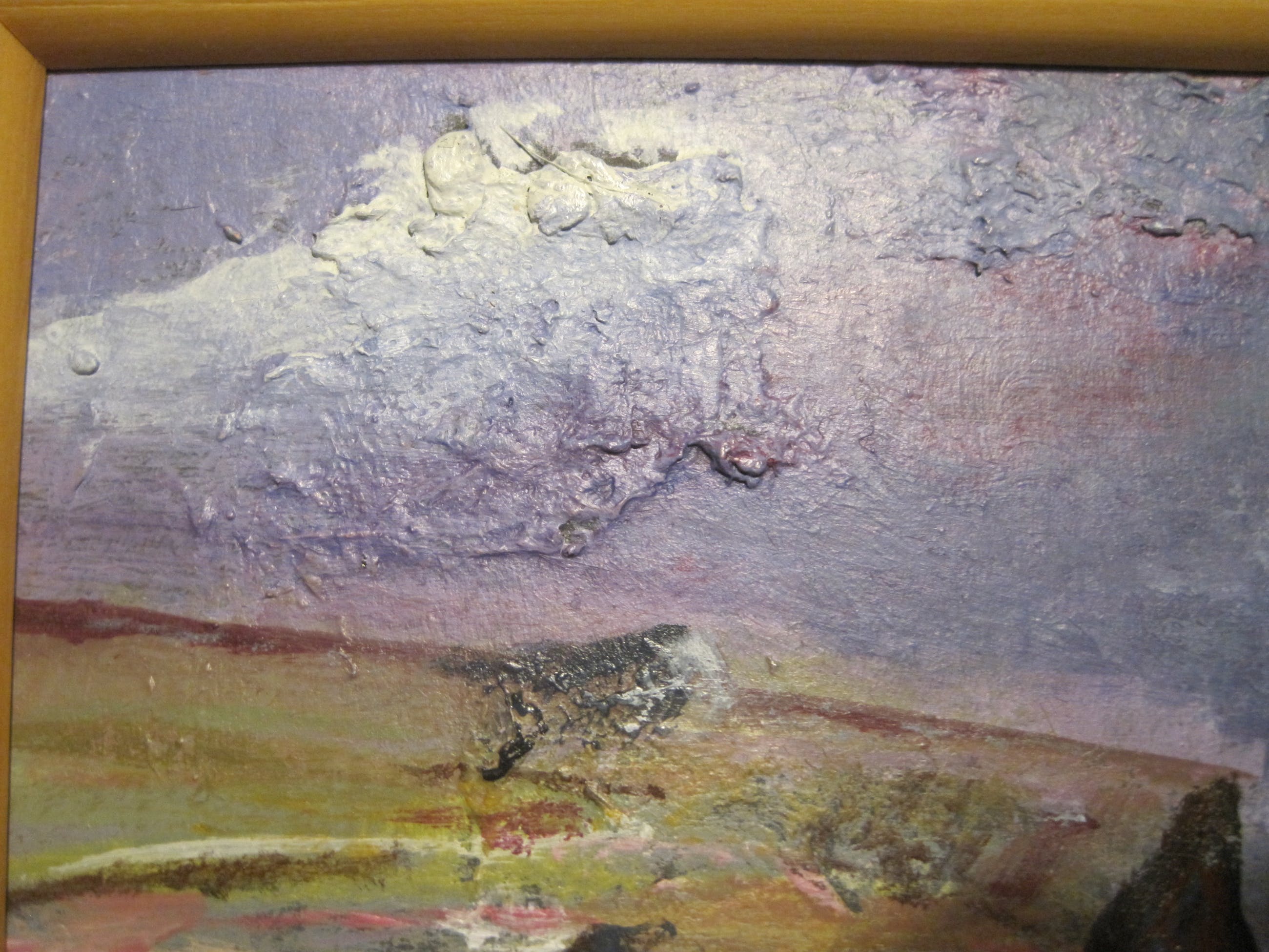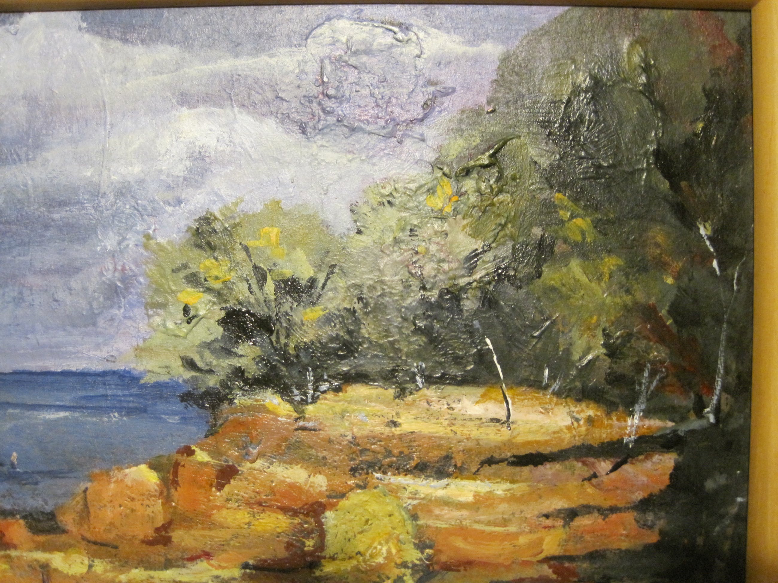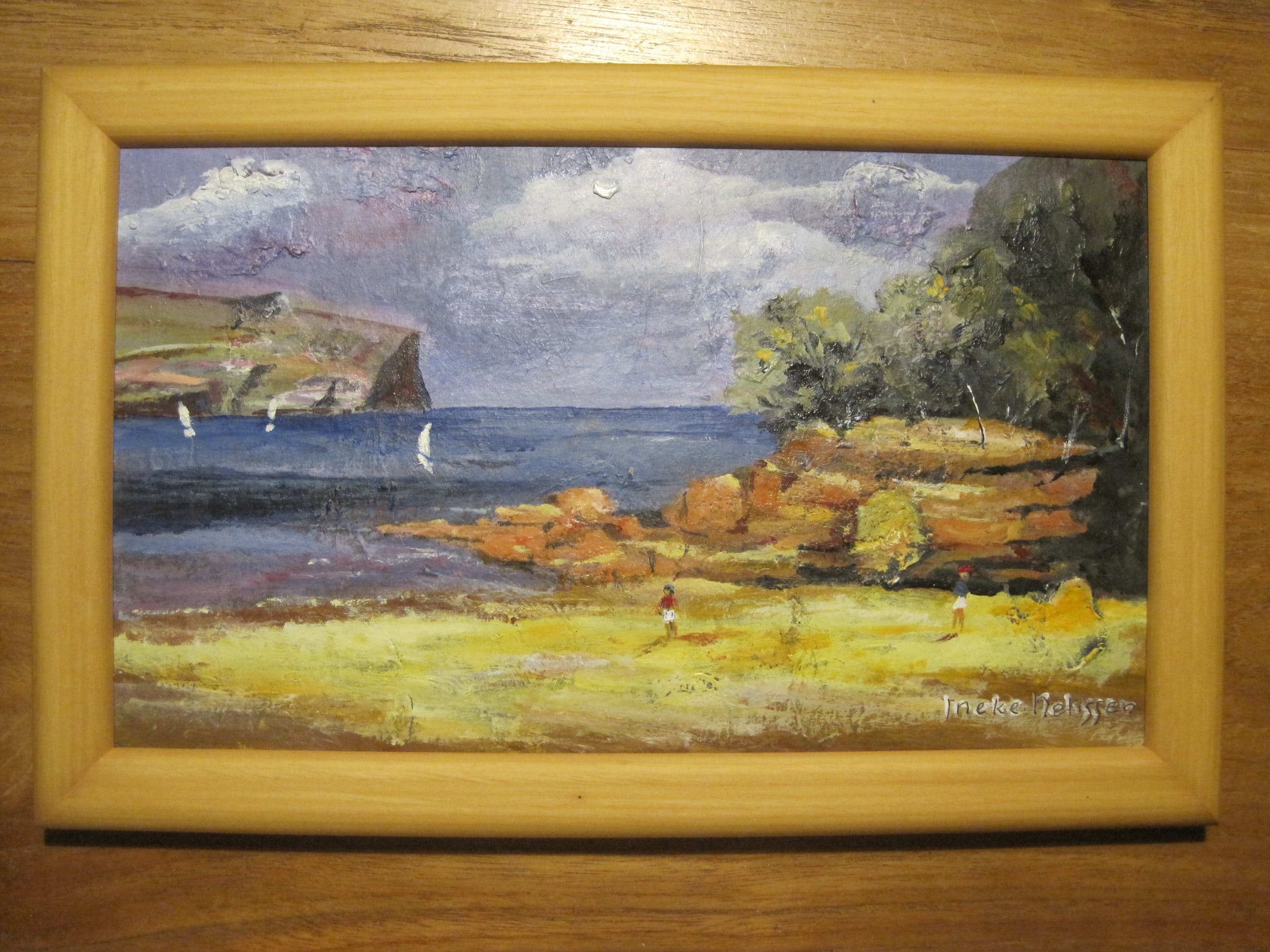 Heel warm, vrolijk, kleurig impressionistisch schilderij van een beschutte baai aan zee. De verf is lekker dik opgezet. Gesigneerd rechtsonder