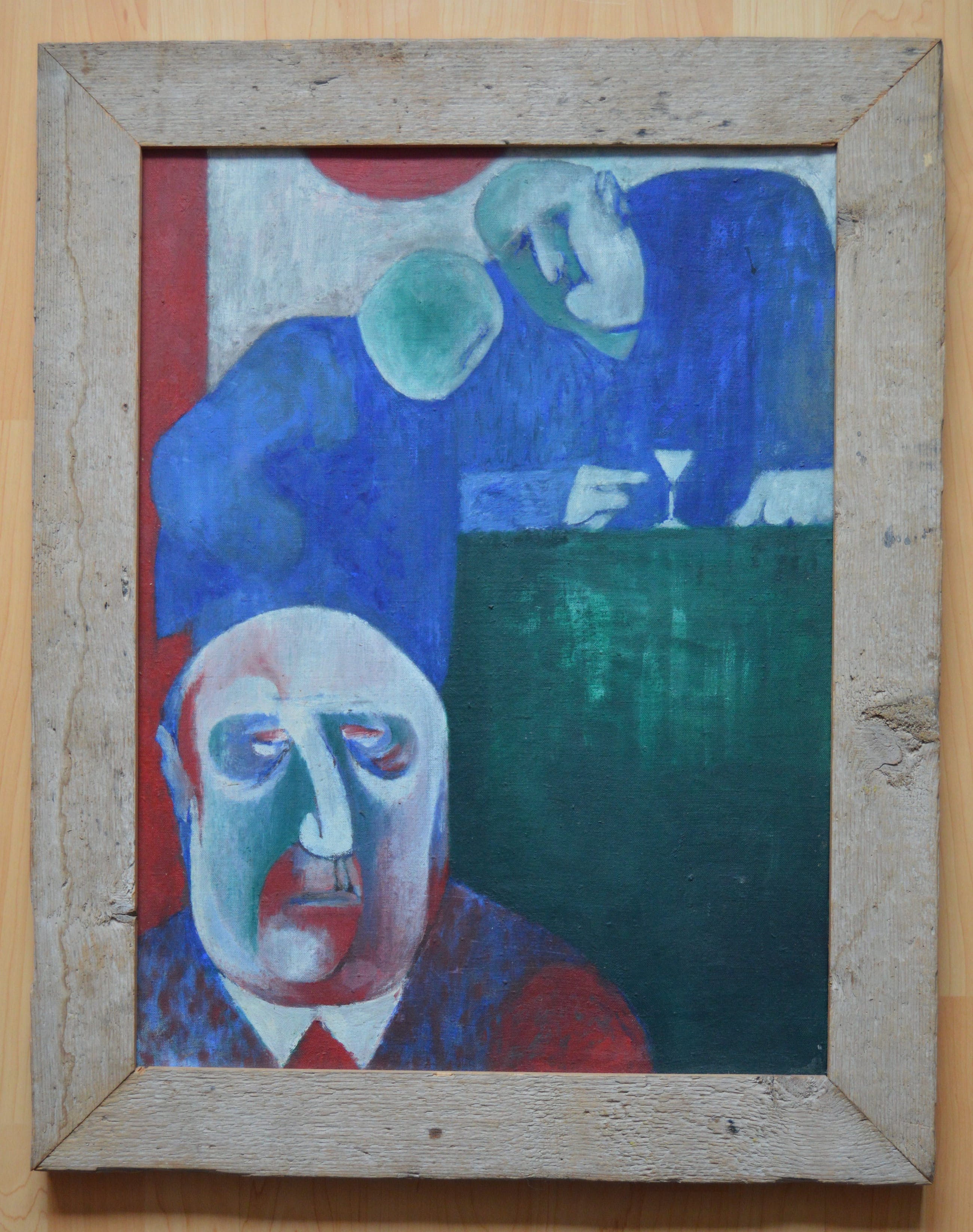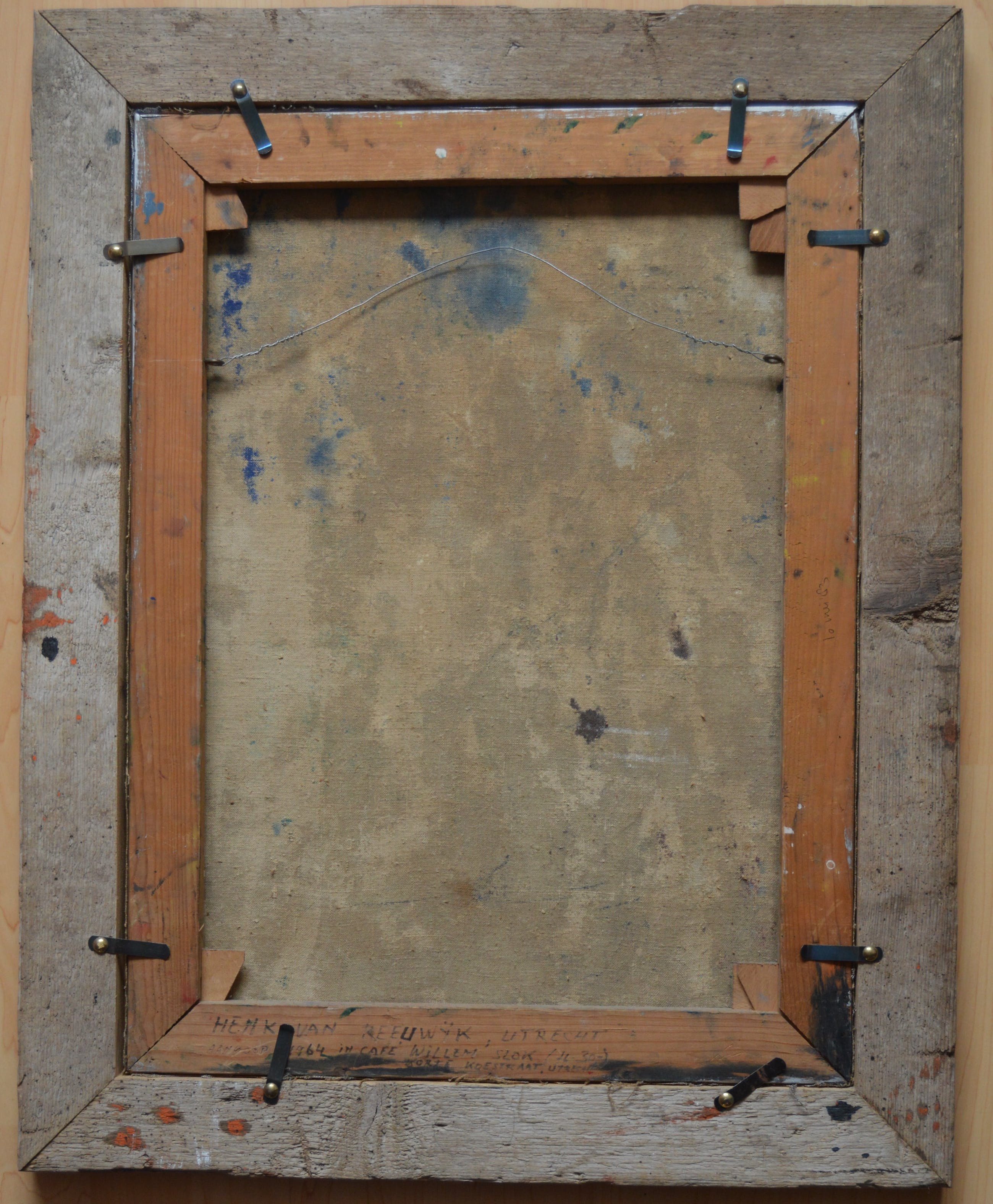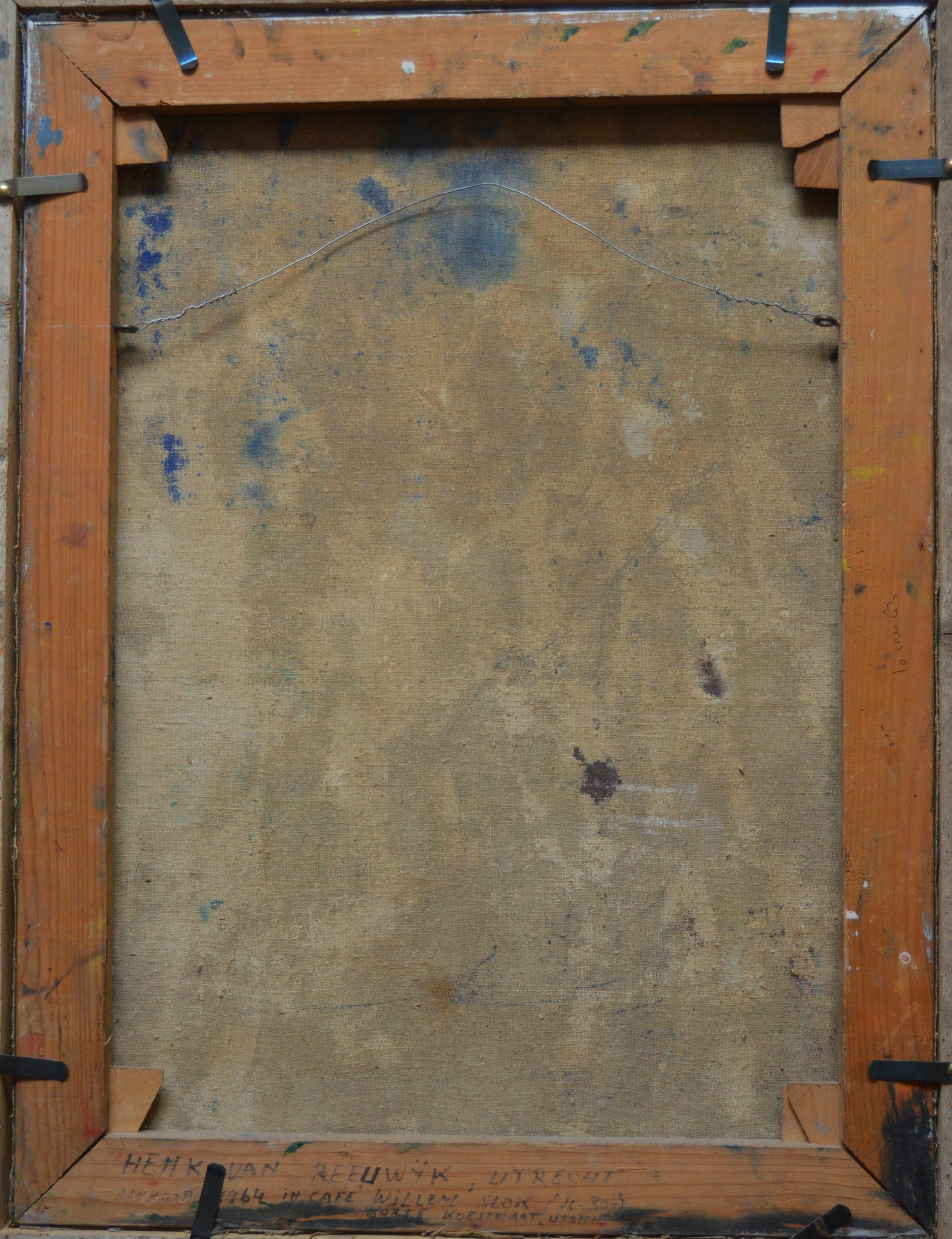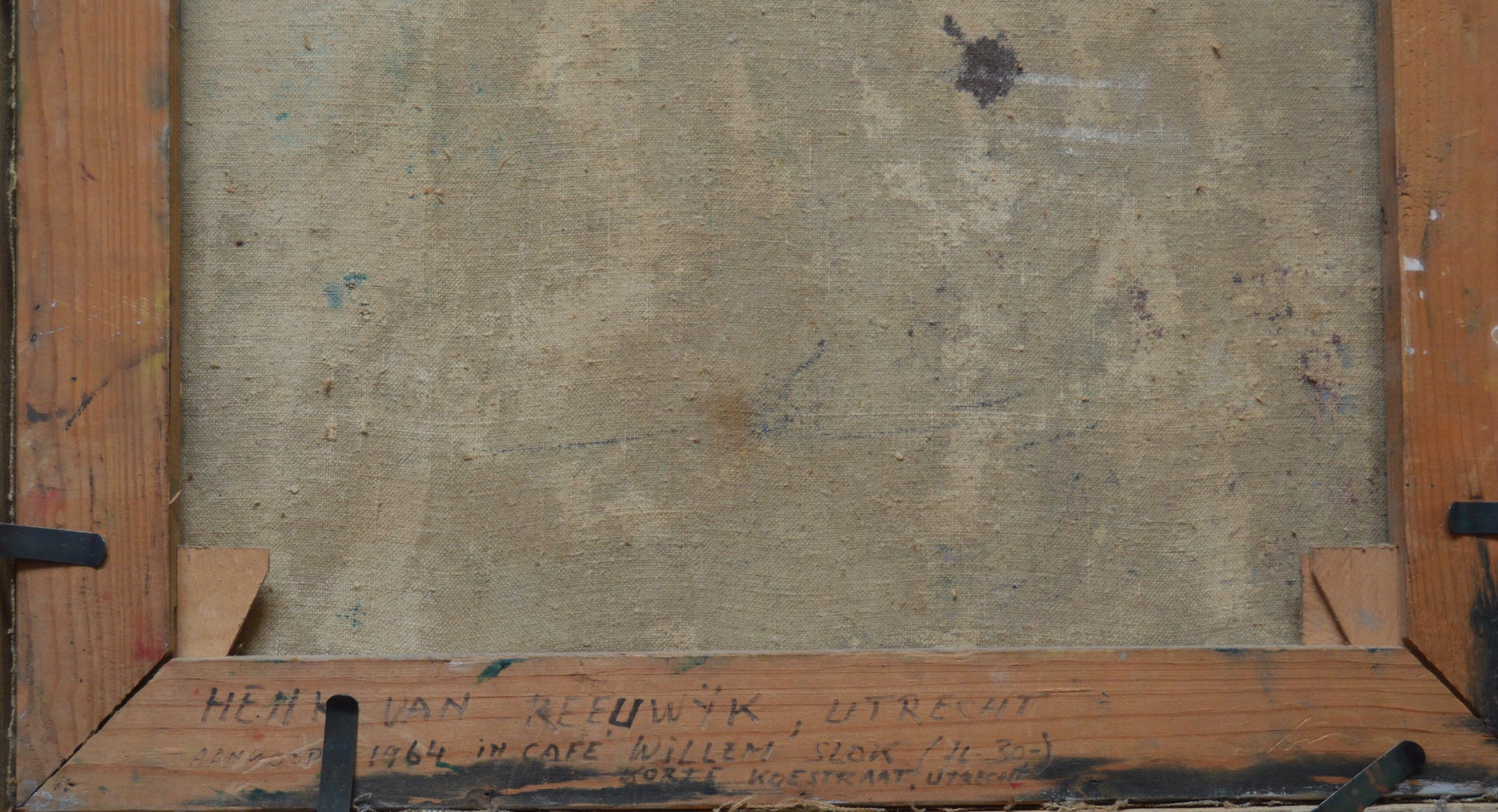 Prachtig 'café-tafereel' Lijkt op de stijl van Rein Dool. Mooi kleurrijk werk; mensen aan de borrel. Aangekocht in café Willem Slok te Utrecht in 1964. Ingelijst in lijst van oud steigerhout!