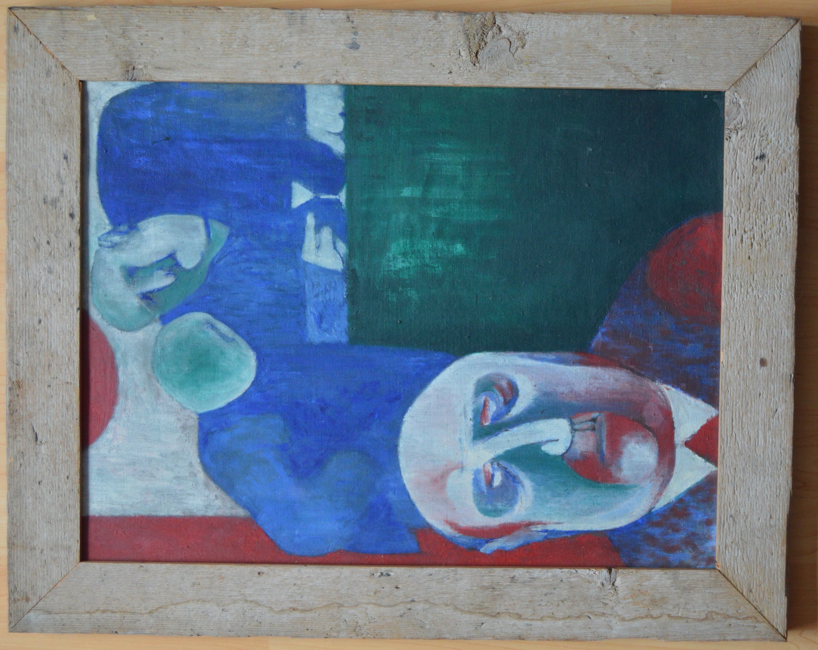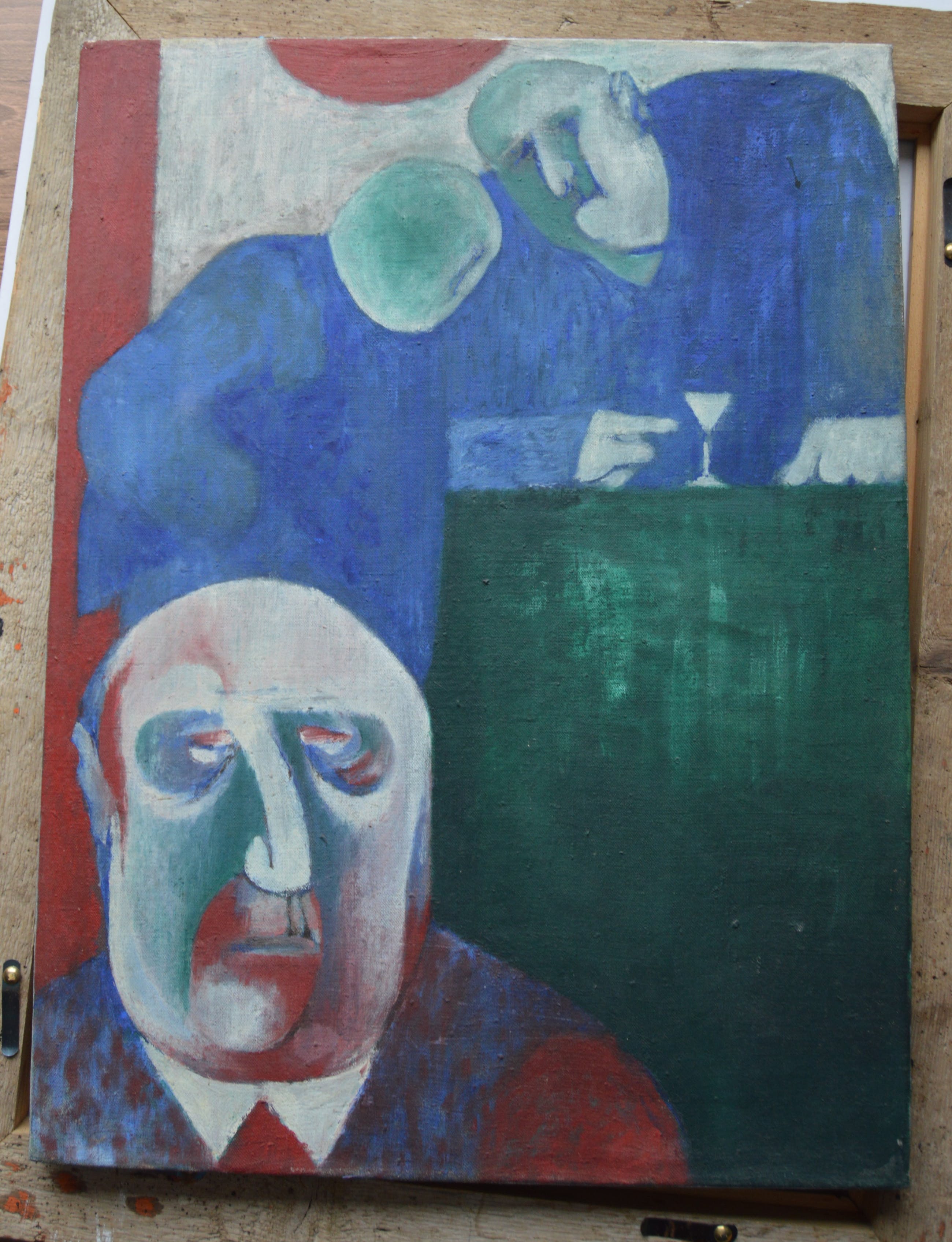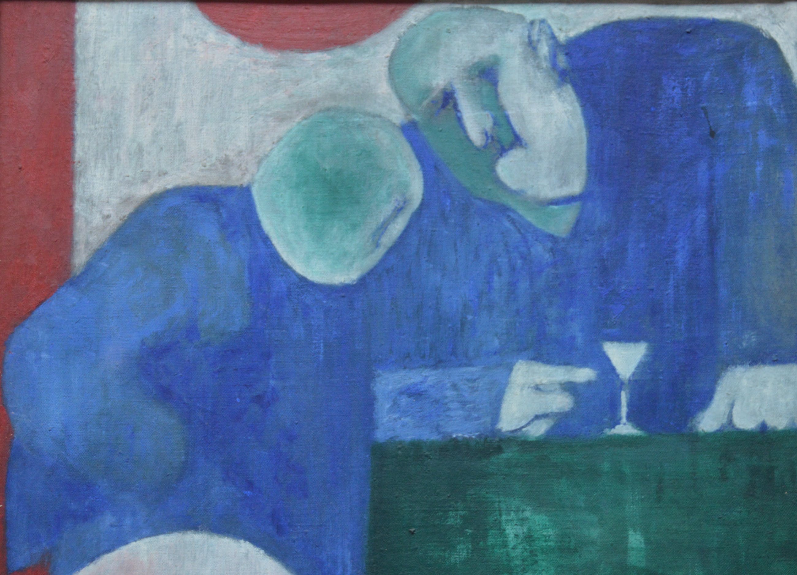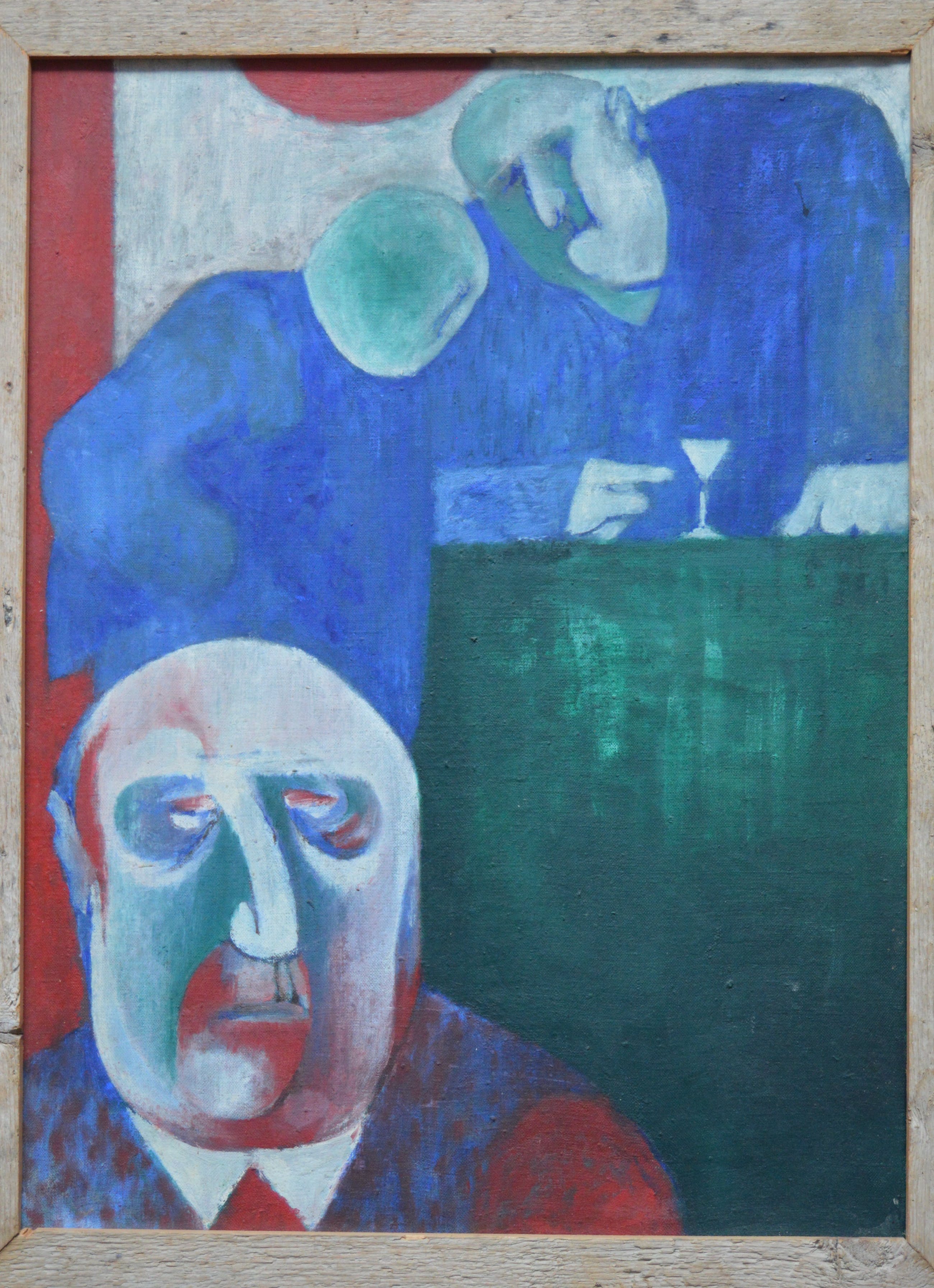 Prachtig 'café-tafereel' Lijkt op de stijl van Rein Dool. Mooi kleurrijk werk; mensen aan de borrel. Aangekocht in café Willem Slok te Utrecht in 1964. Ingelijst in lijst van oud steigerhout!