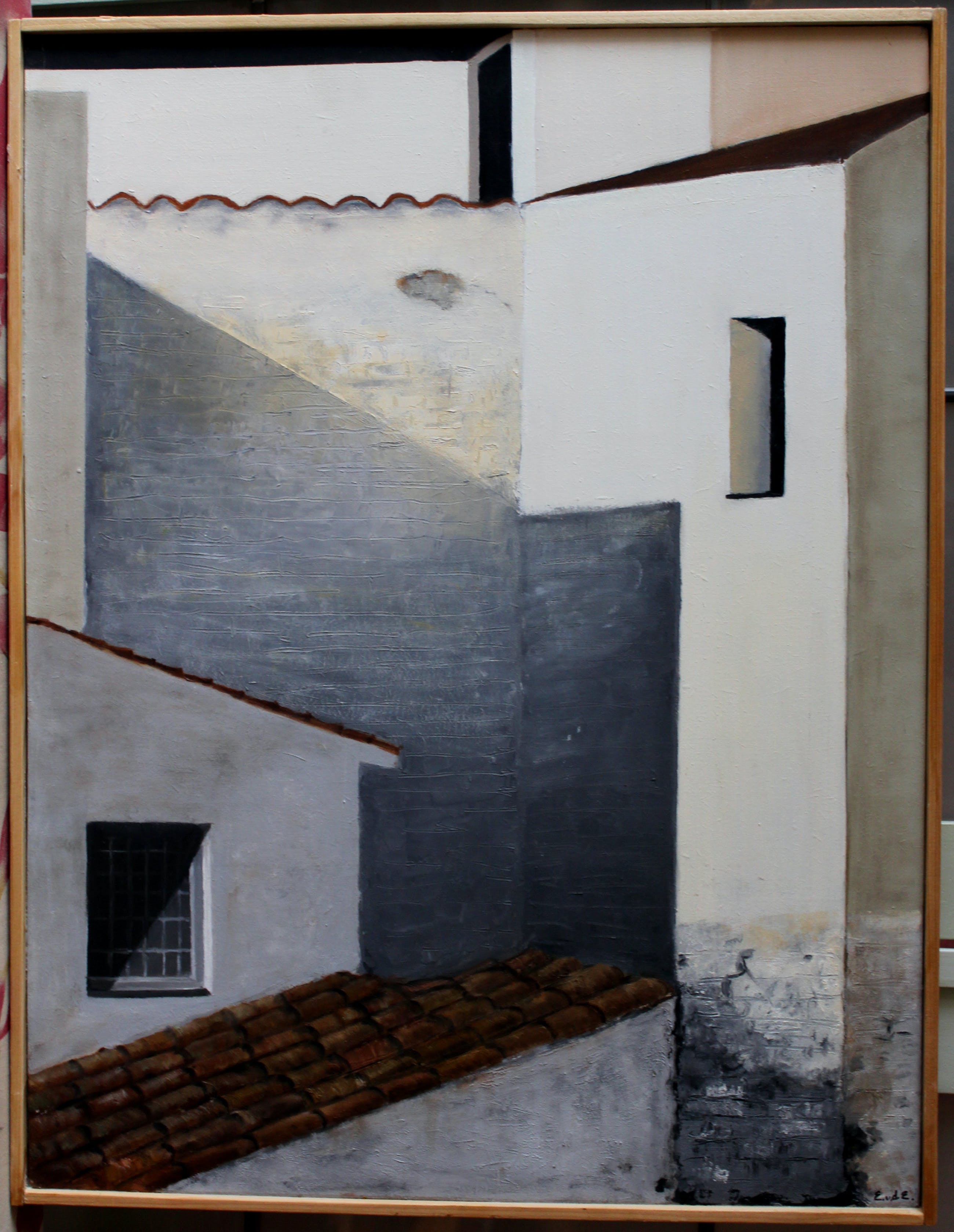 Acryl op paneel met omslaglijst. Onbekende maker. Gesigneerd E. v/d E. Onbekende herkomst. Ophangklaar.