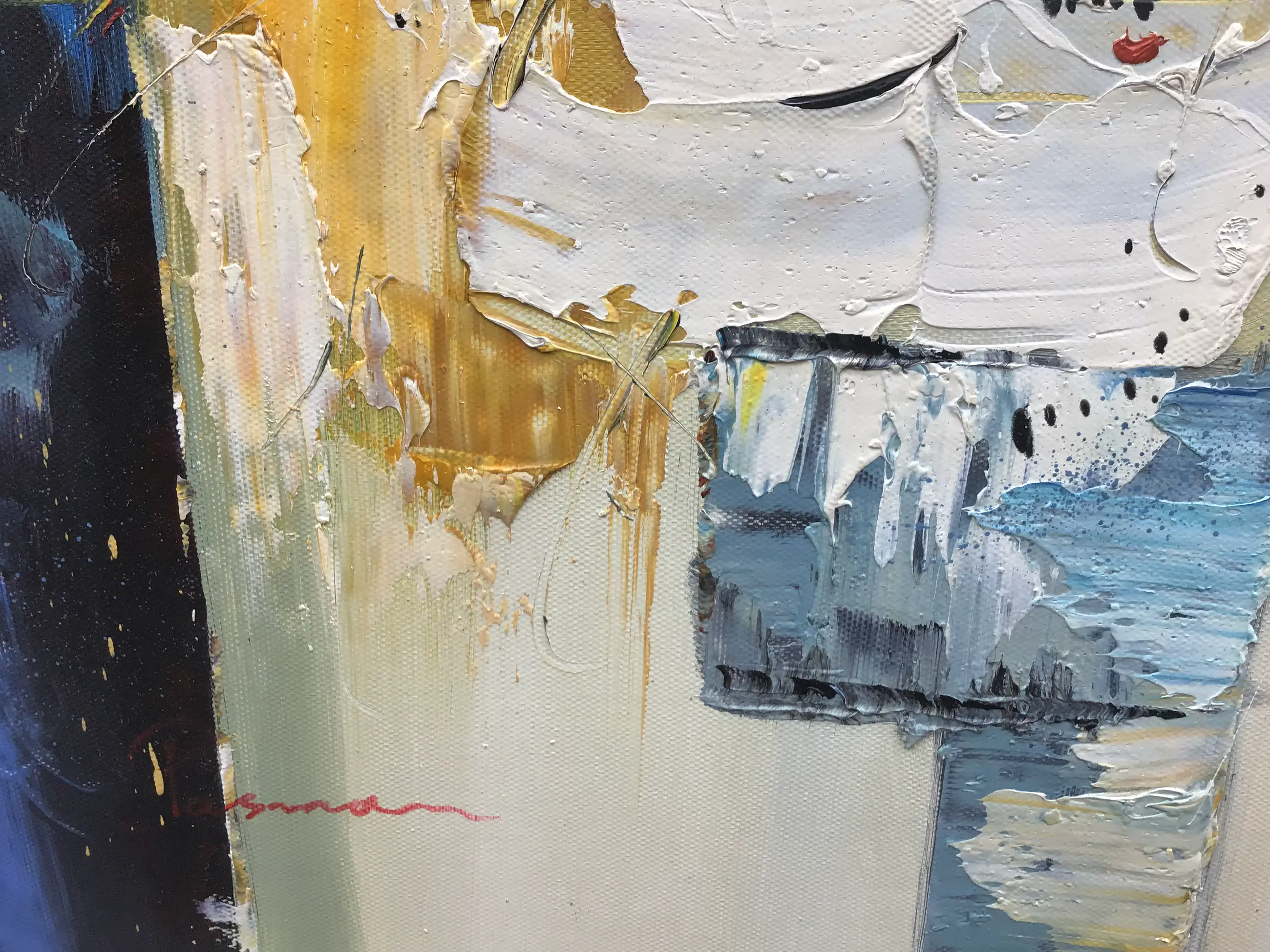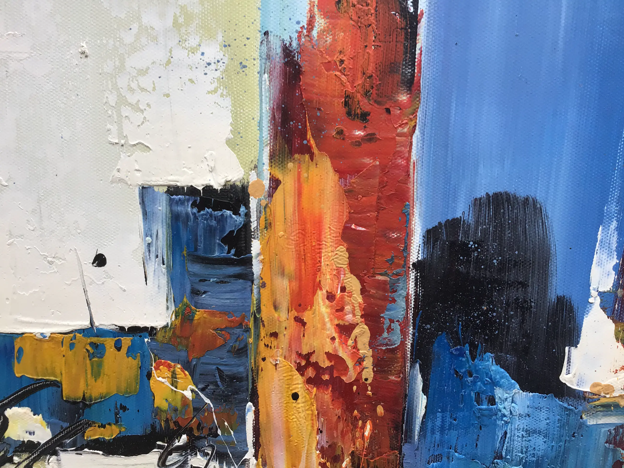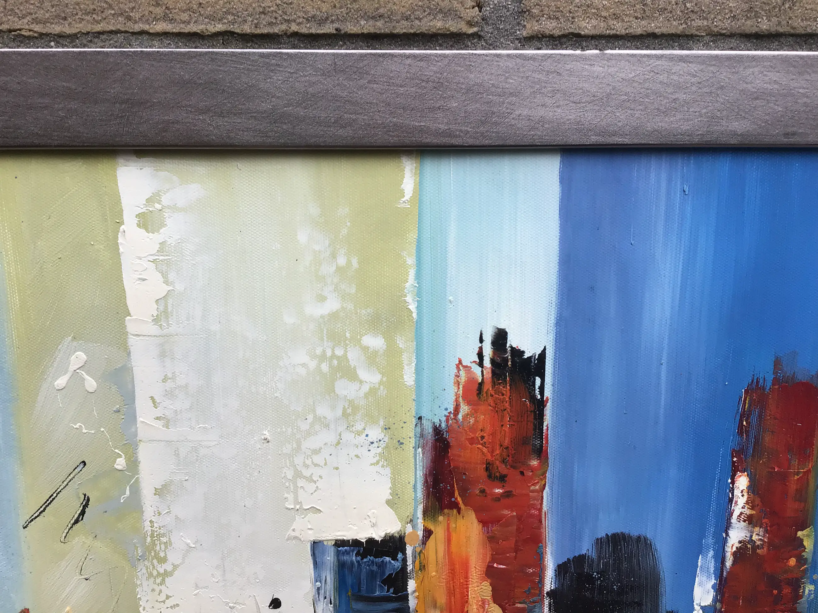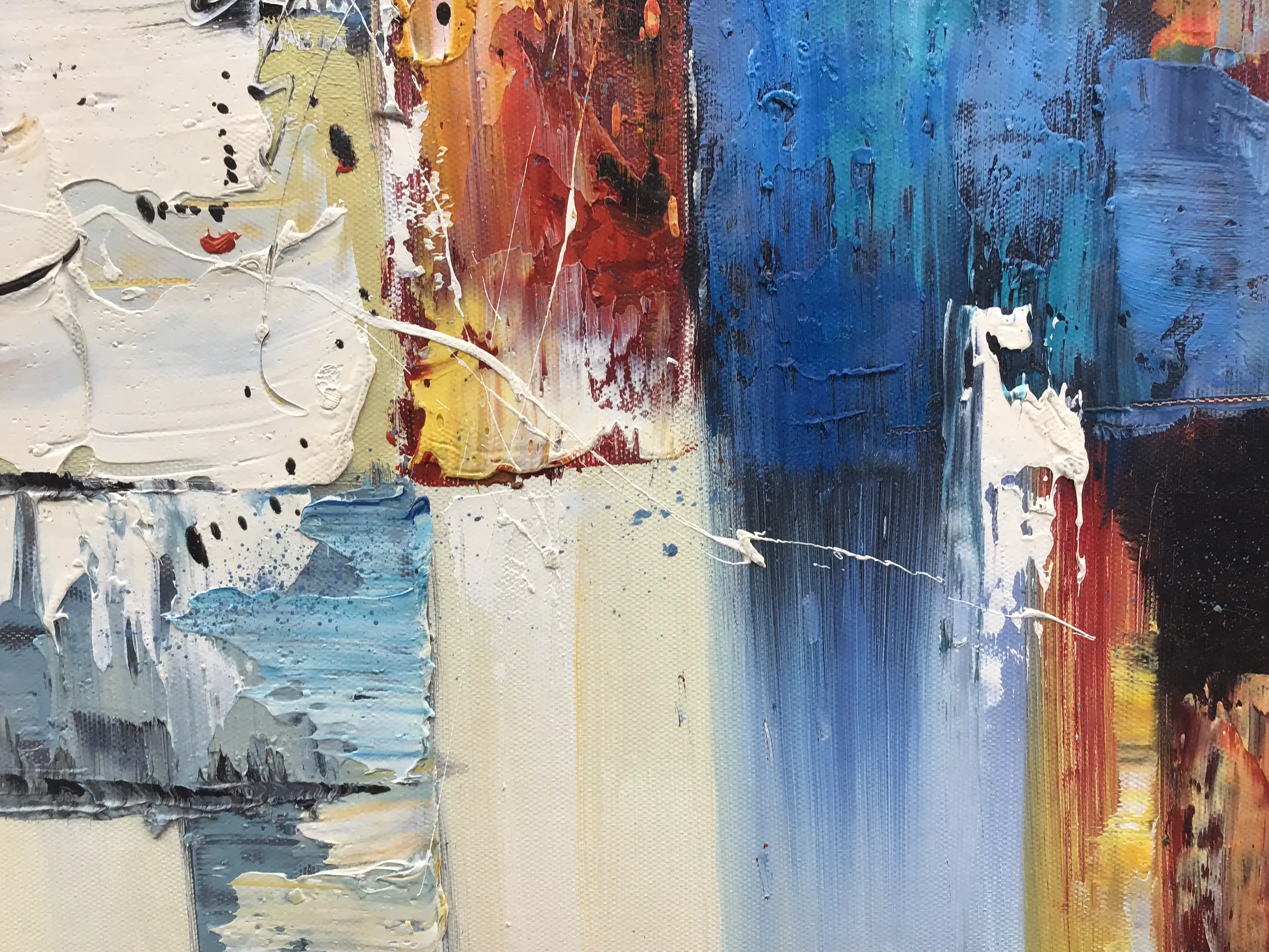Abstract werk. Pasteus opgezet. Gemengde techiek, kwast en paletmes. Goed passend ingelijst.