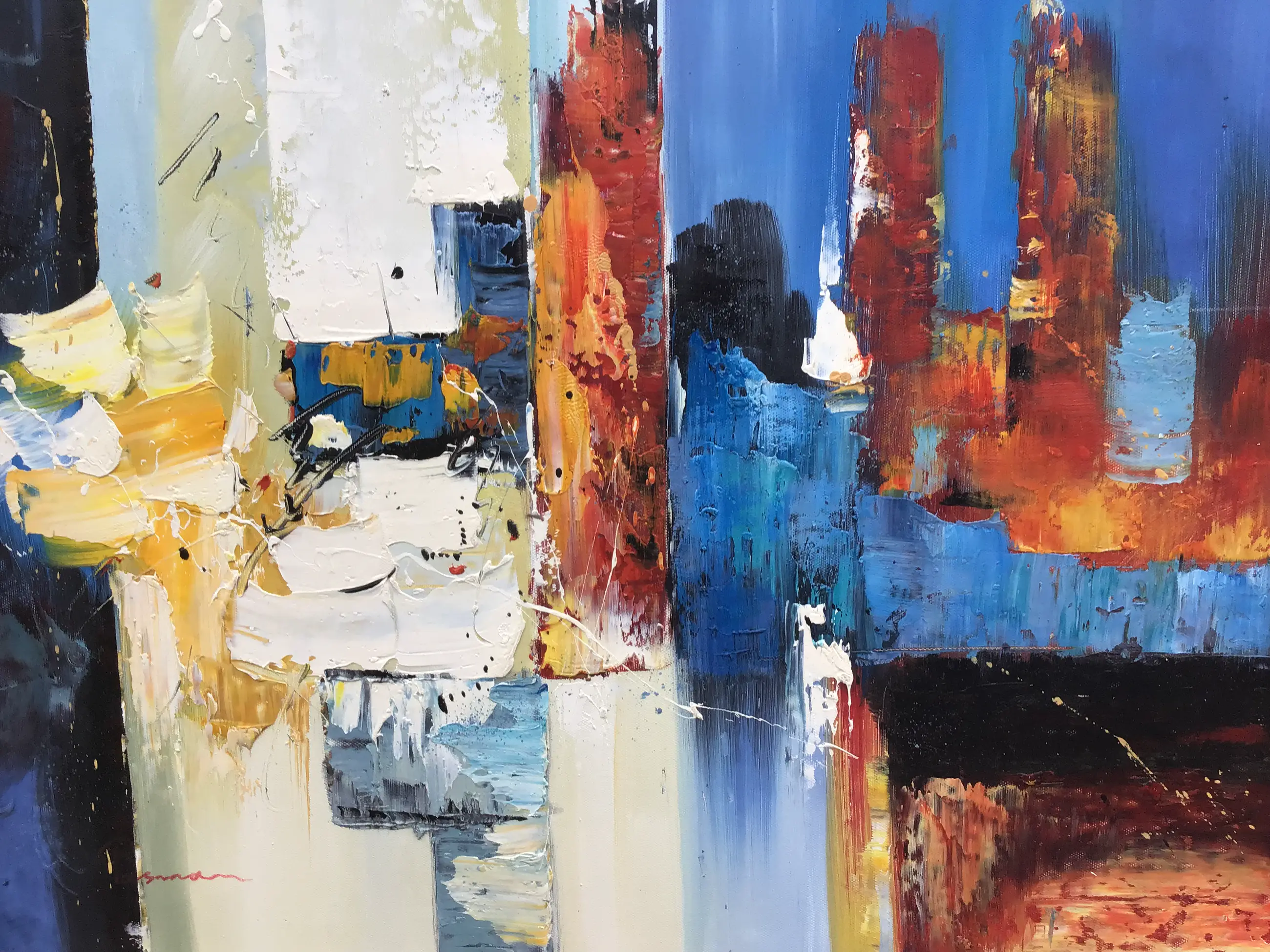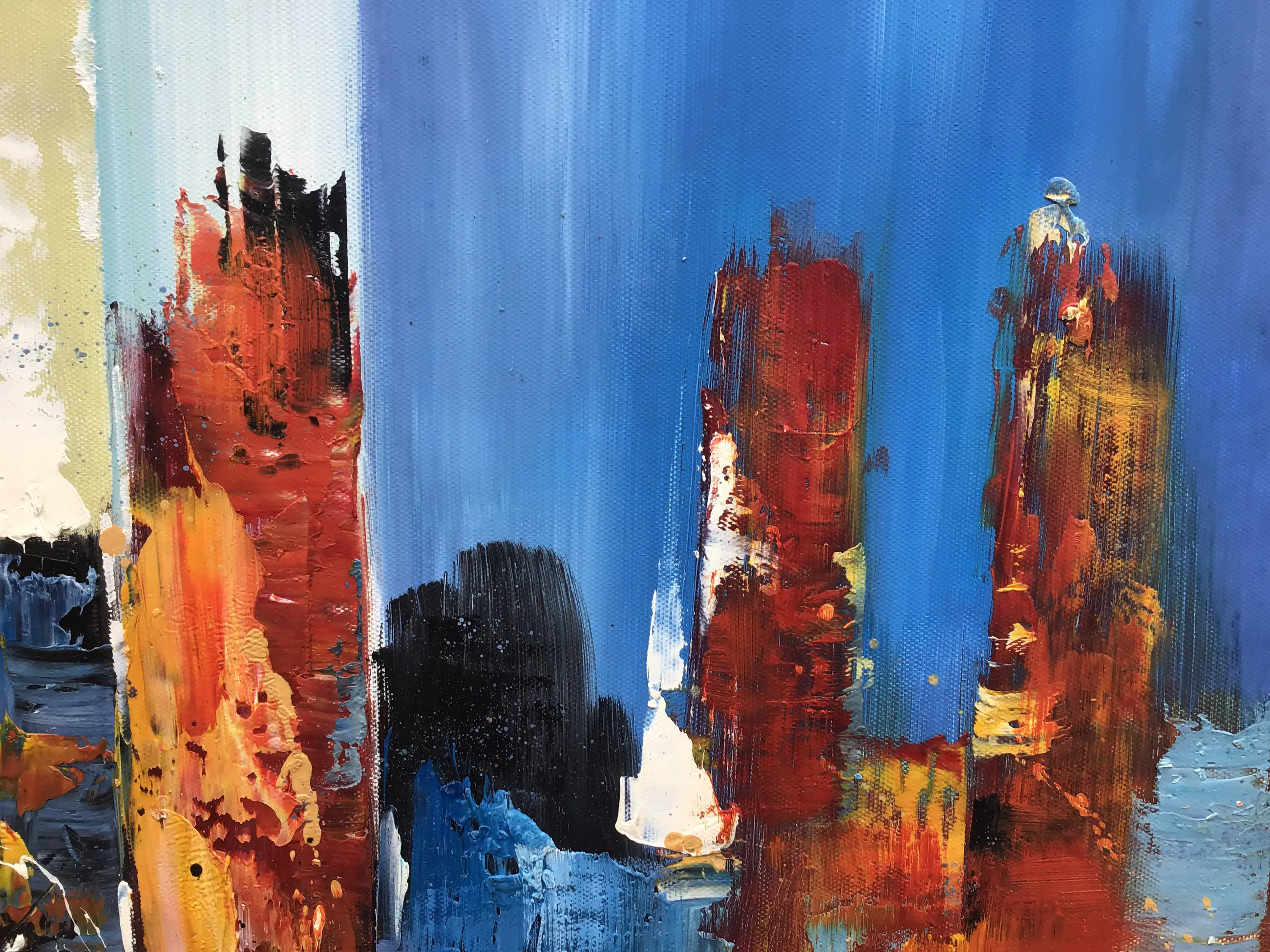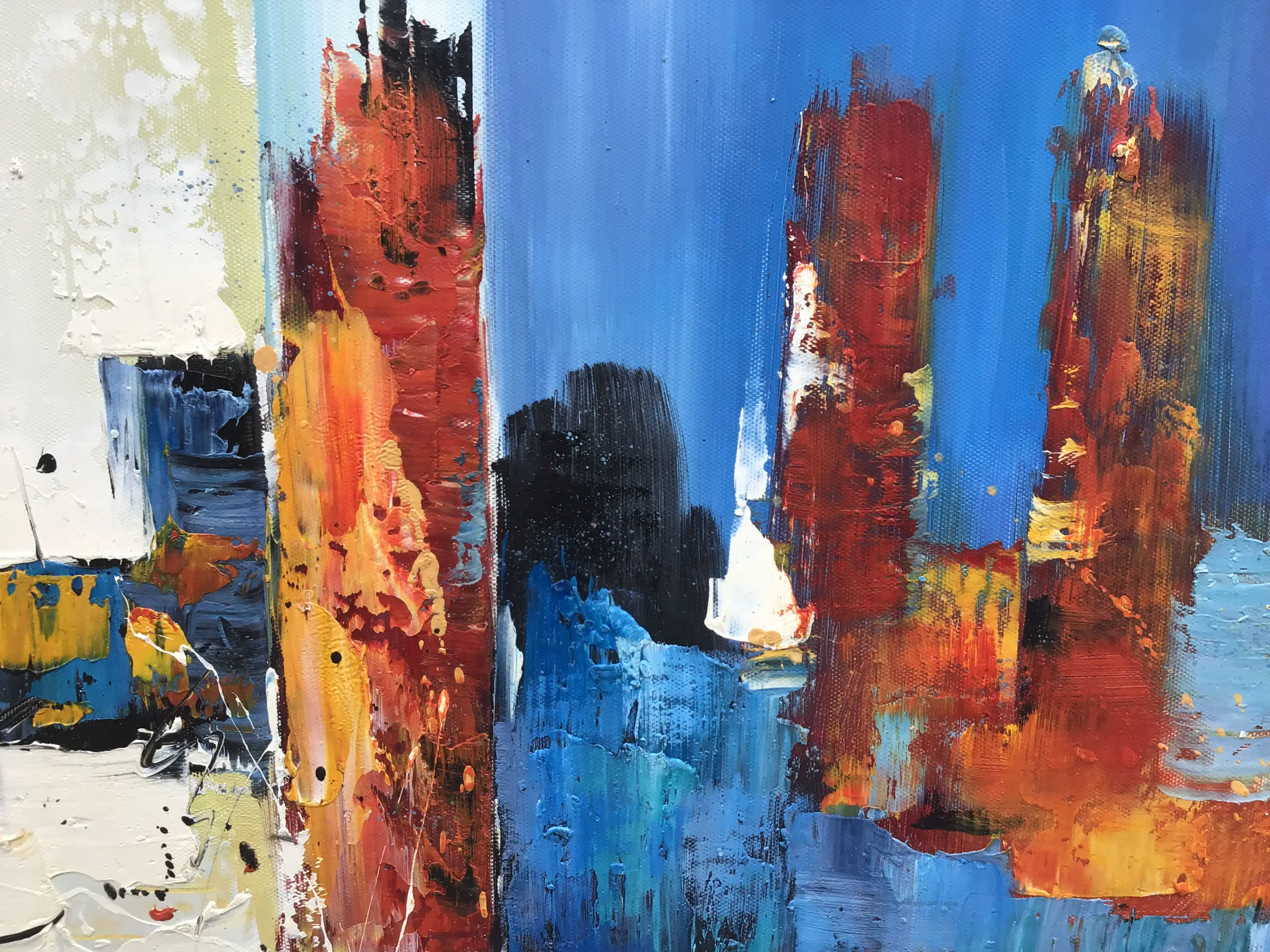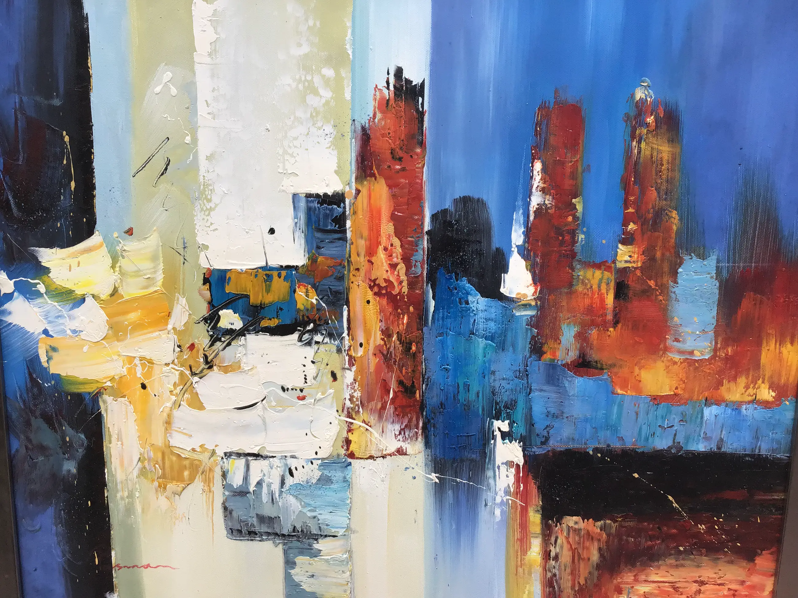 Abstract werk. Pasteus opgezet. Gemengde techiek, kwast en paletmes. Goed passend ingelijst.