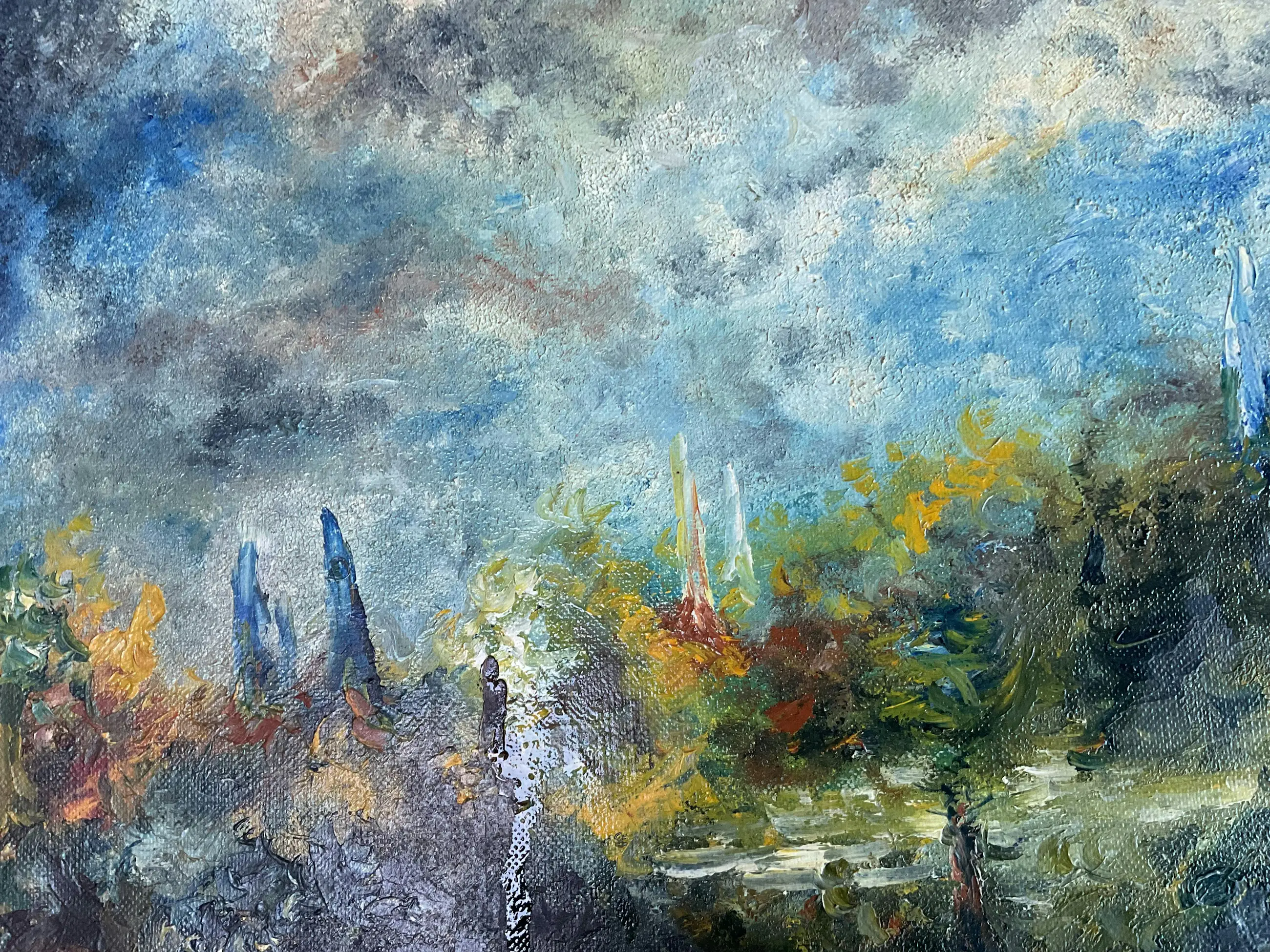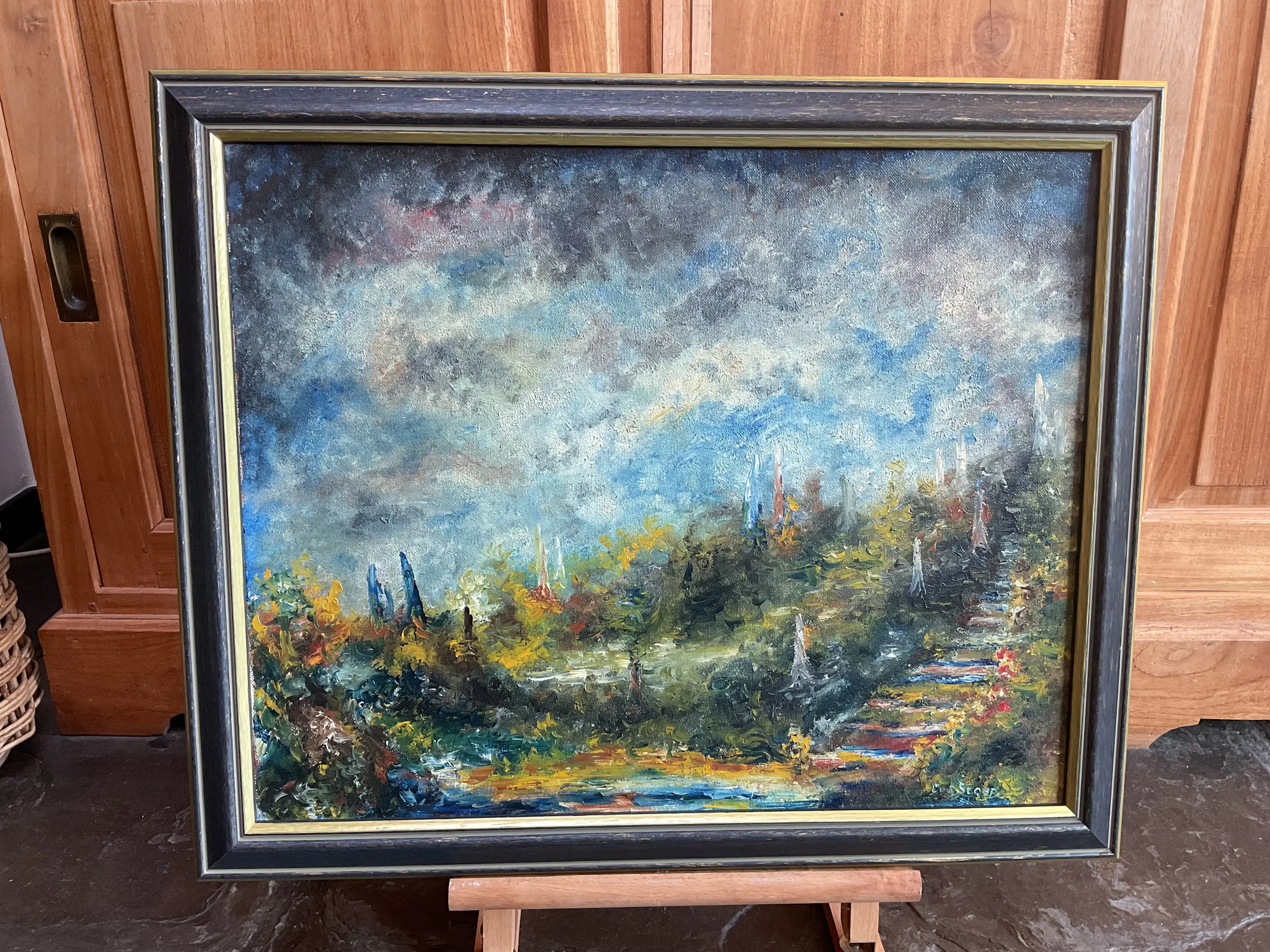 Zeer expressief werk met veel verf en veel kleur. Rechterkant beeld zeker wel een trap naar boven uit. Signering lijkt op ‘stoep’ of ‘stoop’.