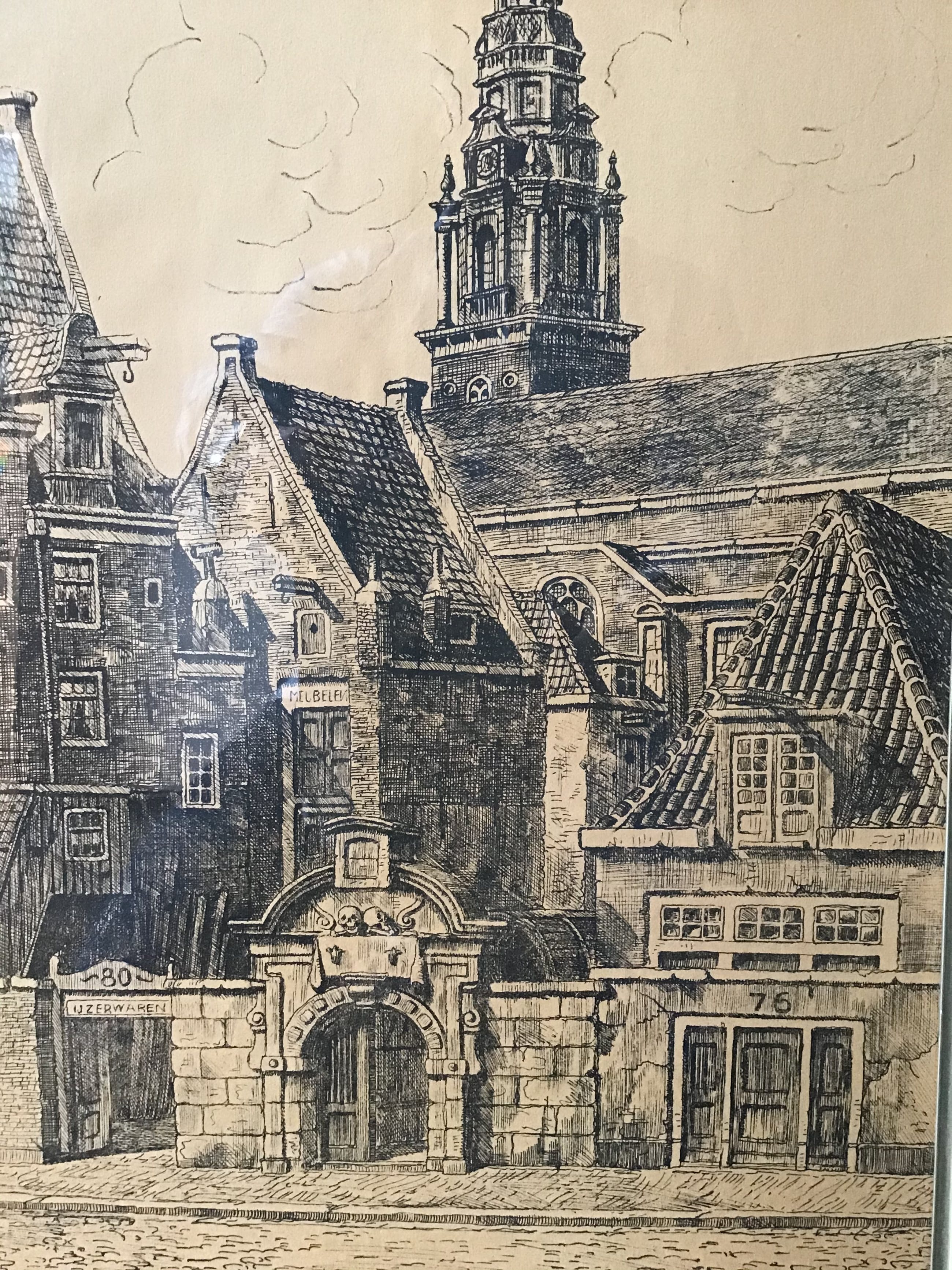 Pentekening van een niet meer bestaand deel van Amsterdam. Het Zuiderkerkhofpoortje is te zien en op de achtergrond de toren van de Zuiderkerk. Het kerkhof heeft plaats gemaakt voor nieuwbouw. Het poortje uit 1610 is gerestaureerd en verplaatst i.v.m. de aanleg van de metro.