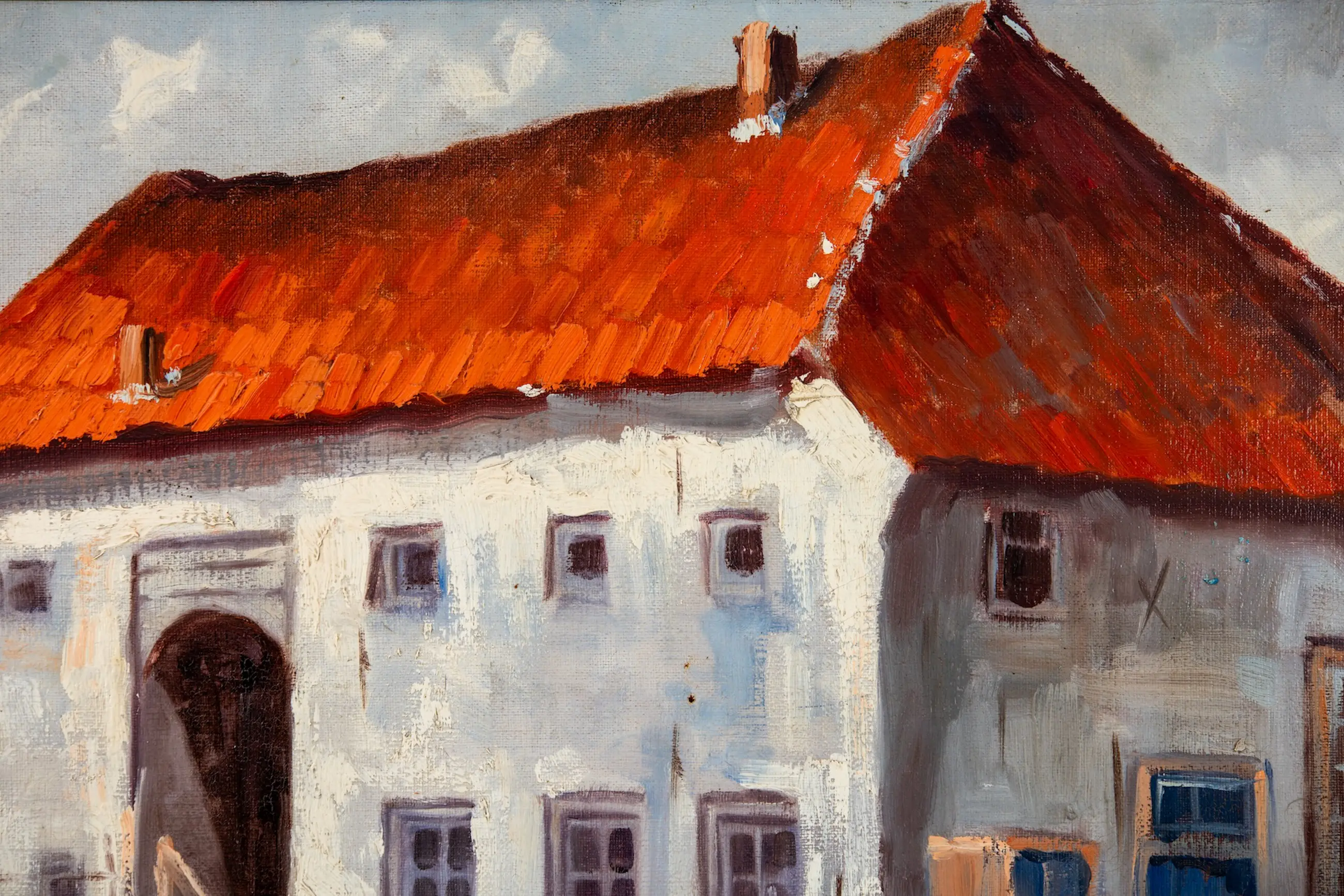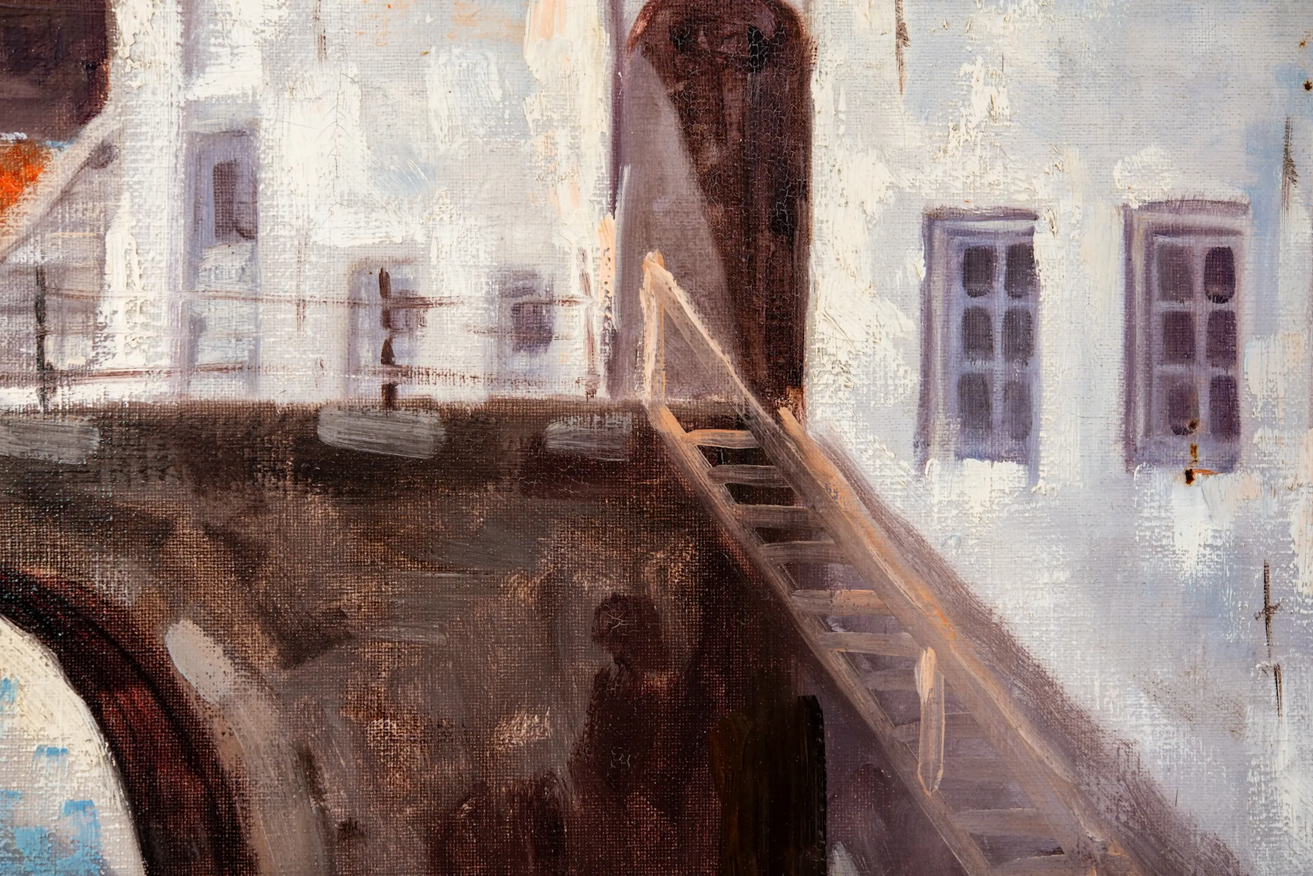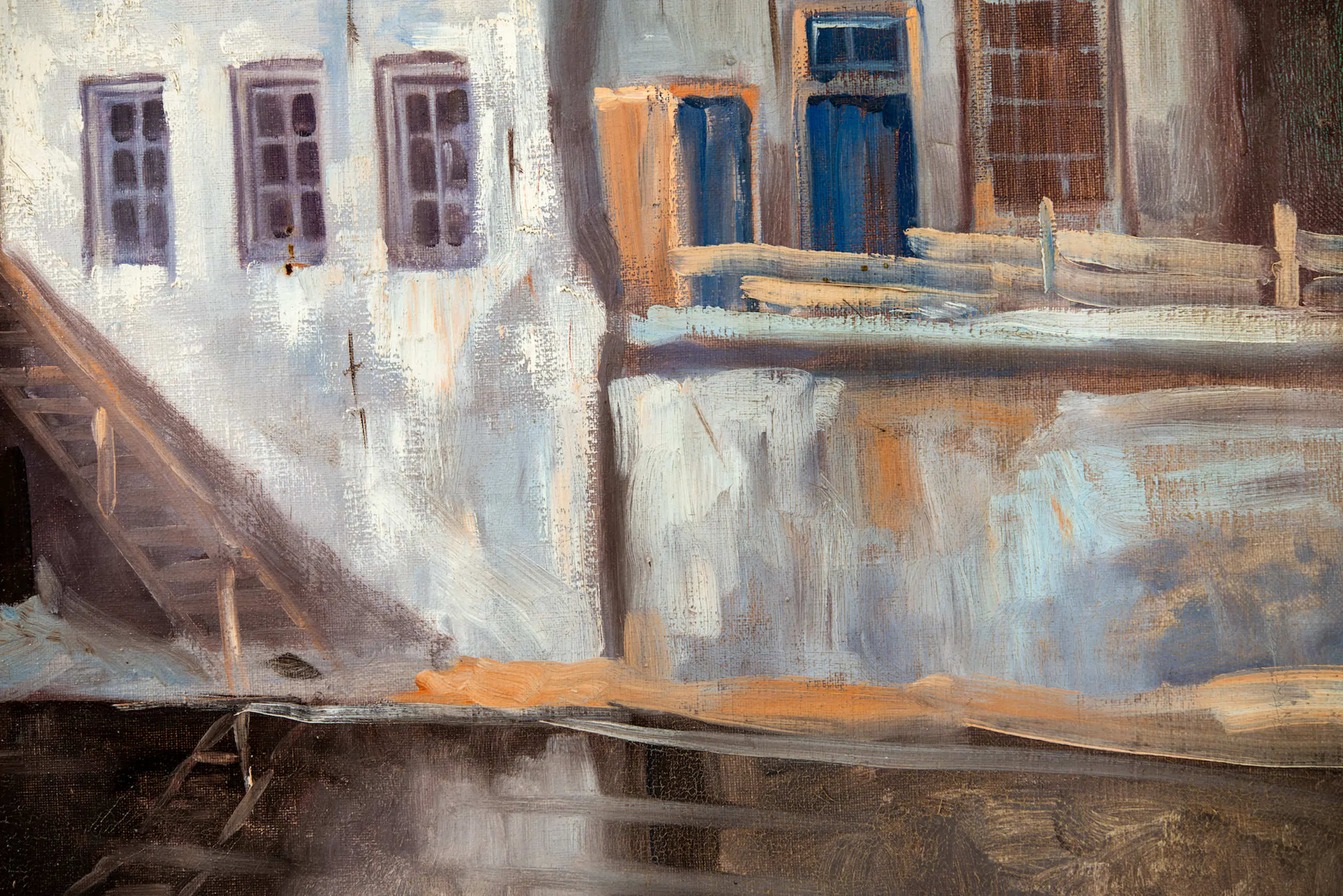 De kunstenaar heeft met een fijngevoelig oog voor detail de architecturale elementen vastgelegd - de bakstenen, de dakpannen en de weerspiegeling in het water zijn met zorg en nauwkeurigheid weergegeven. De lichtval op de voorgevel van de gebouwen suggereert een bepaald tijdstip van de dag, waarschijnlijk de late namiddag, waarbij de schaduwen langzaam langer worden en een gevoel van rust over de scène leggen.