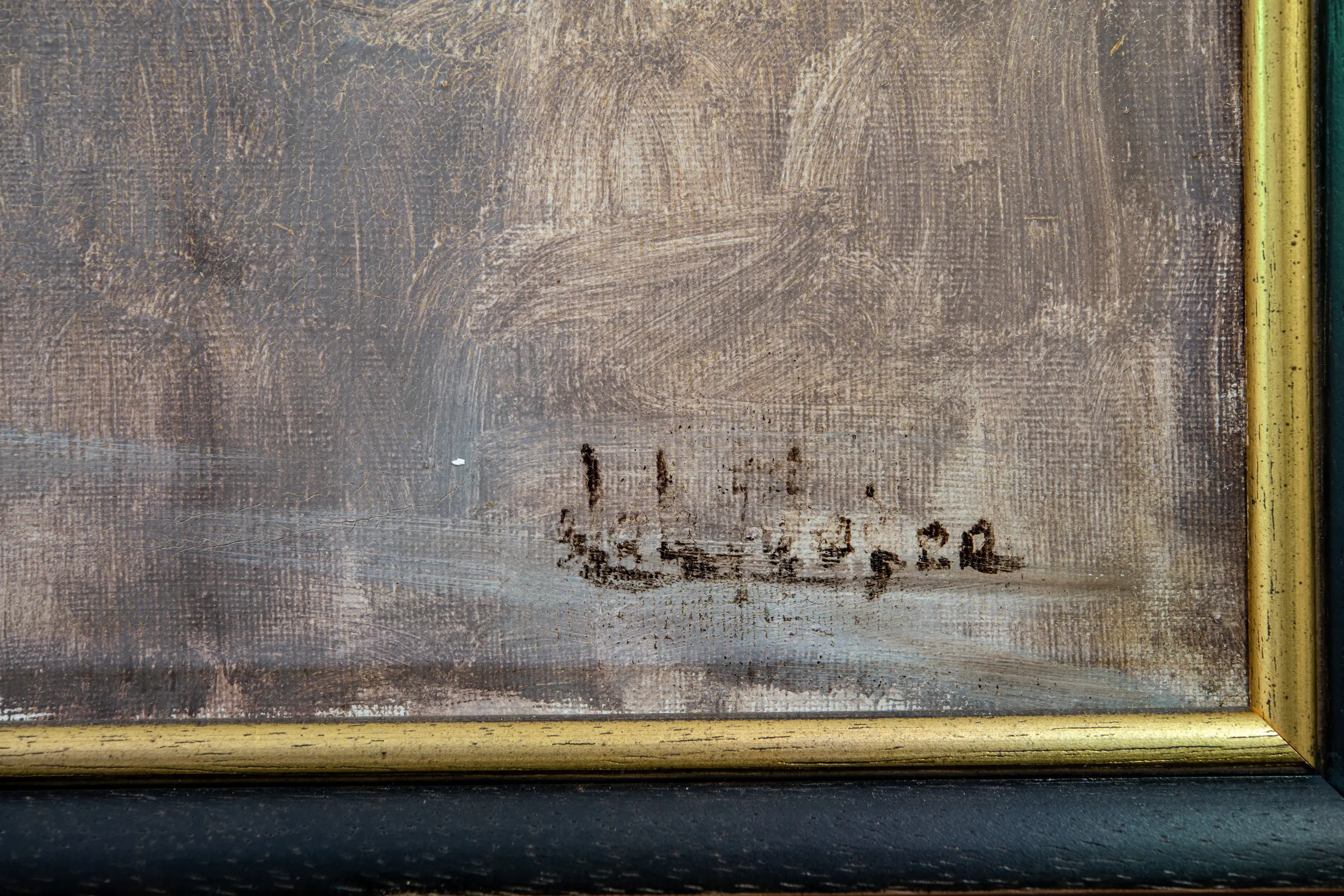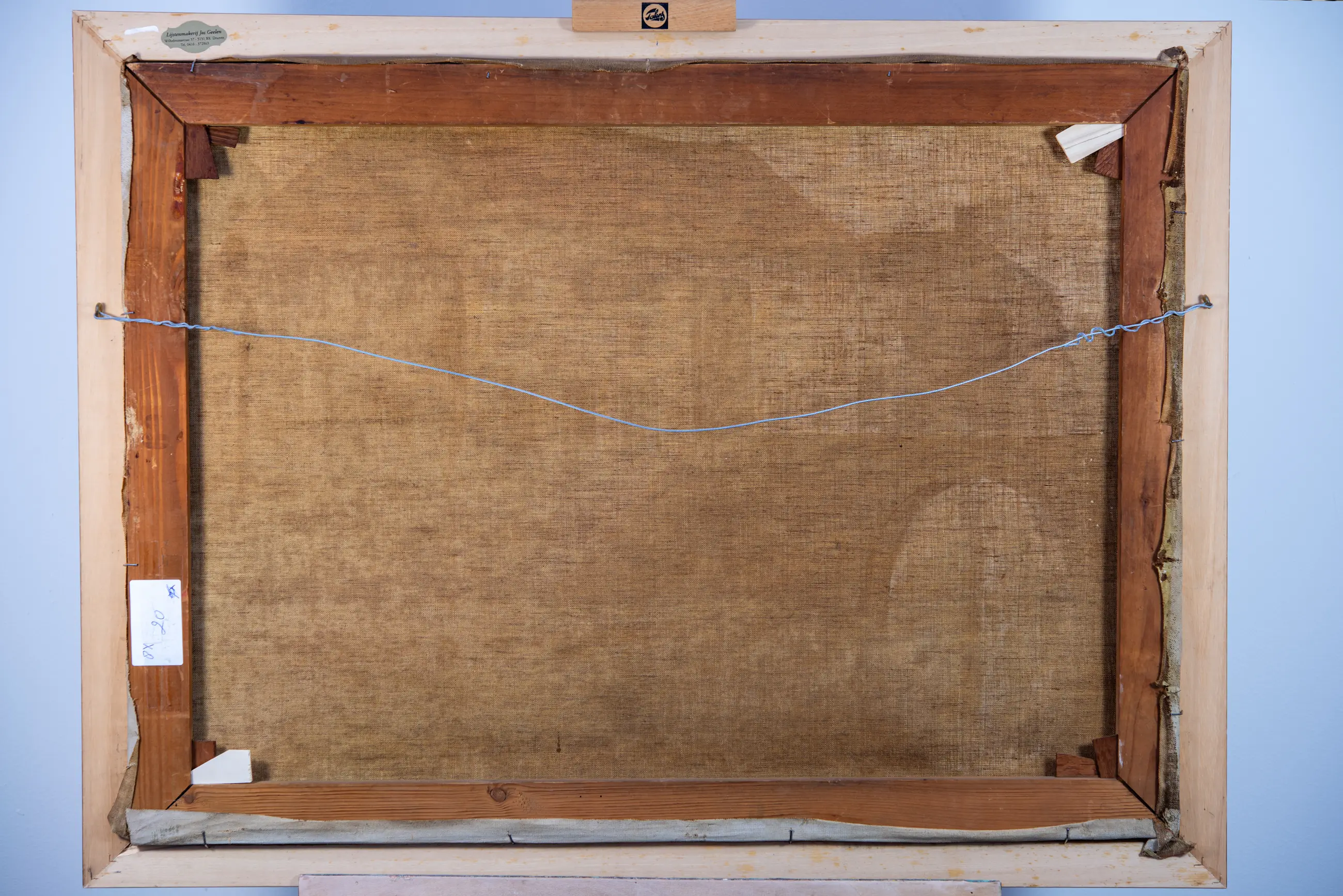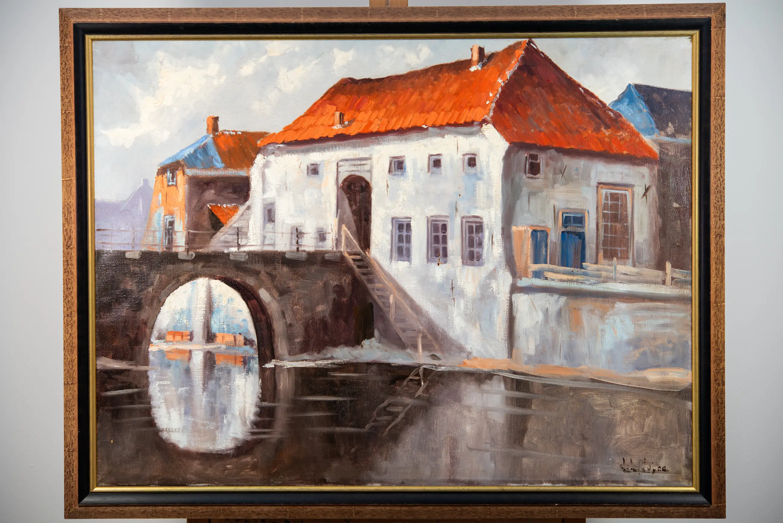 Dit schilderij, getiteld "Zusters van Orthenpoort te Den Bosch", is een karakteristiek werk van de Hollandse School, gedateerd uit een periode waarin de Nederlandse schilderkunst een hoogtepunt bereikte in zijn weergave van licht, schaduw en alledaagse taferelen. De compositie toont een schilderachtig aanzicht van de Zusters van Orthenpoort, een historisch stukje 's-Hertogenbosch, dat bekend staat om zijn oude gebouwen en waterwegen.