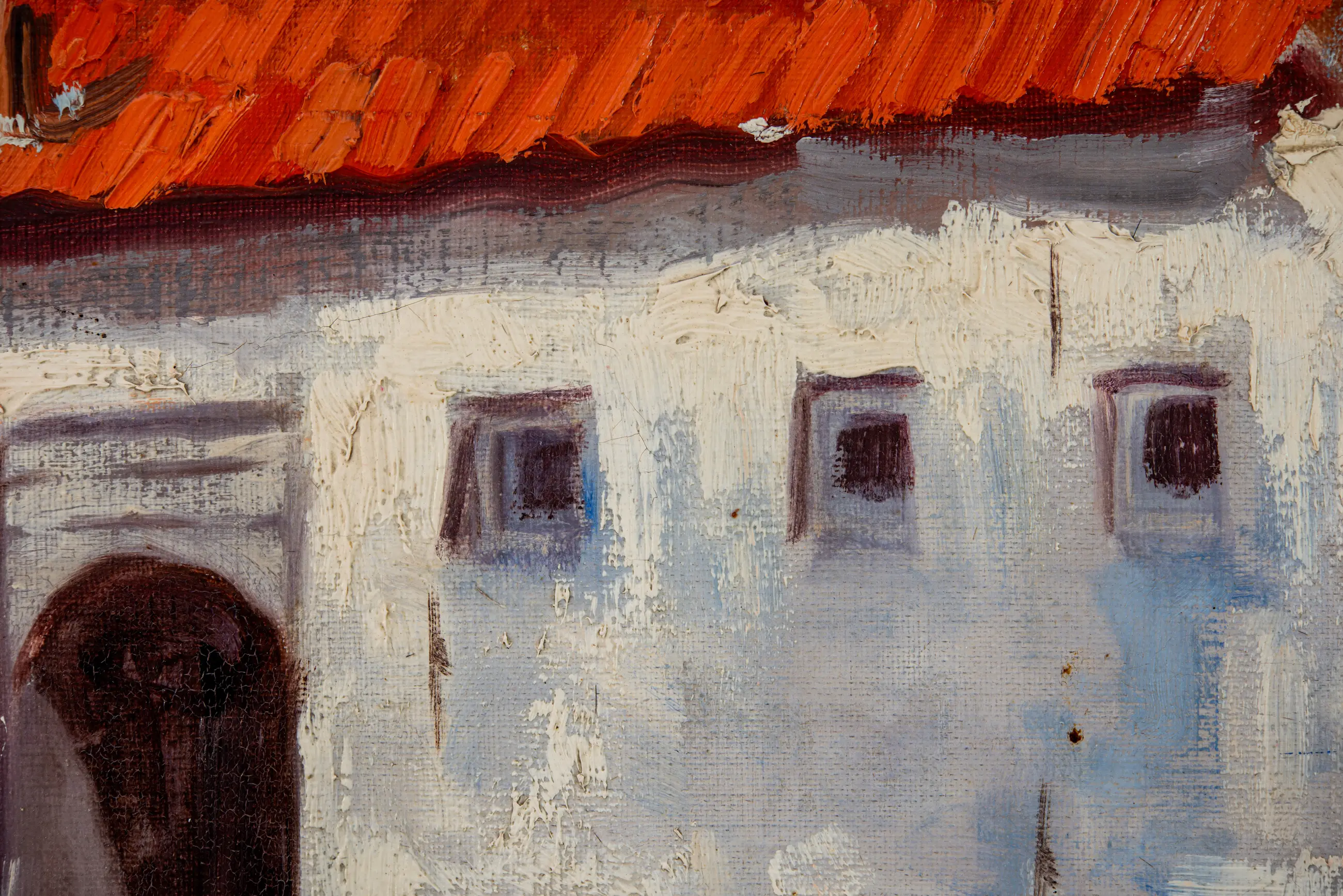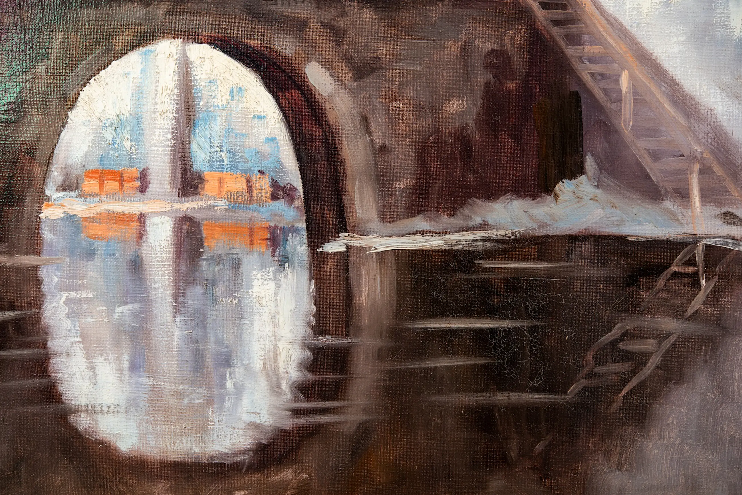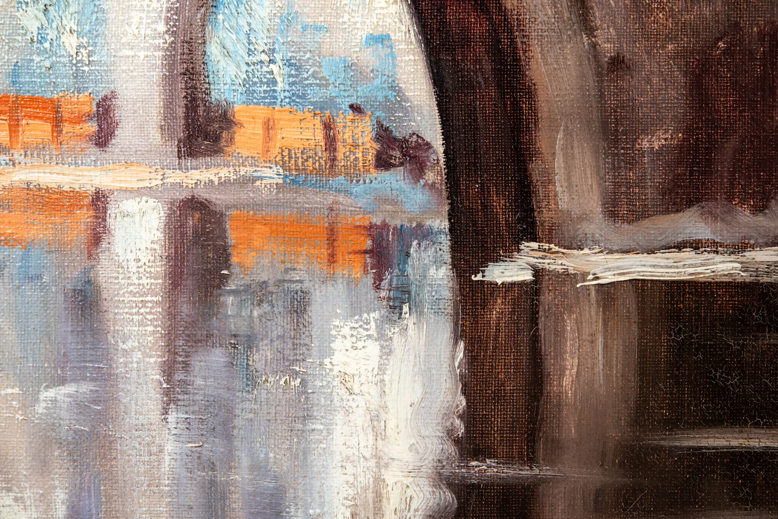 Dit schilderij, getiteld "Zusters van Orthenpoort te Den Bosch", is een karakteristiek werk van de Hollandse School, gedateerd uit een periode waarin de Nederlandse schilderkunst een hoogtepunt bereikte in zijn weergave van licht, schaduw en alledaagse taferelen. De compositie toont een schilderachtig aanzicht van de Zusters van Orthenpoort, een historisch stukje 's-Hertogenbosch, dat bekend staat om zijn oude gebouwen en waterwegen.
