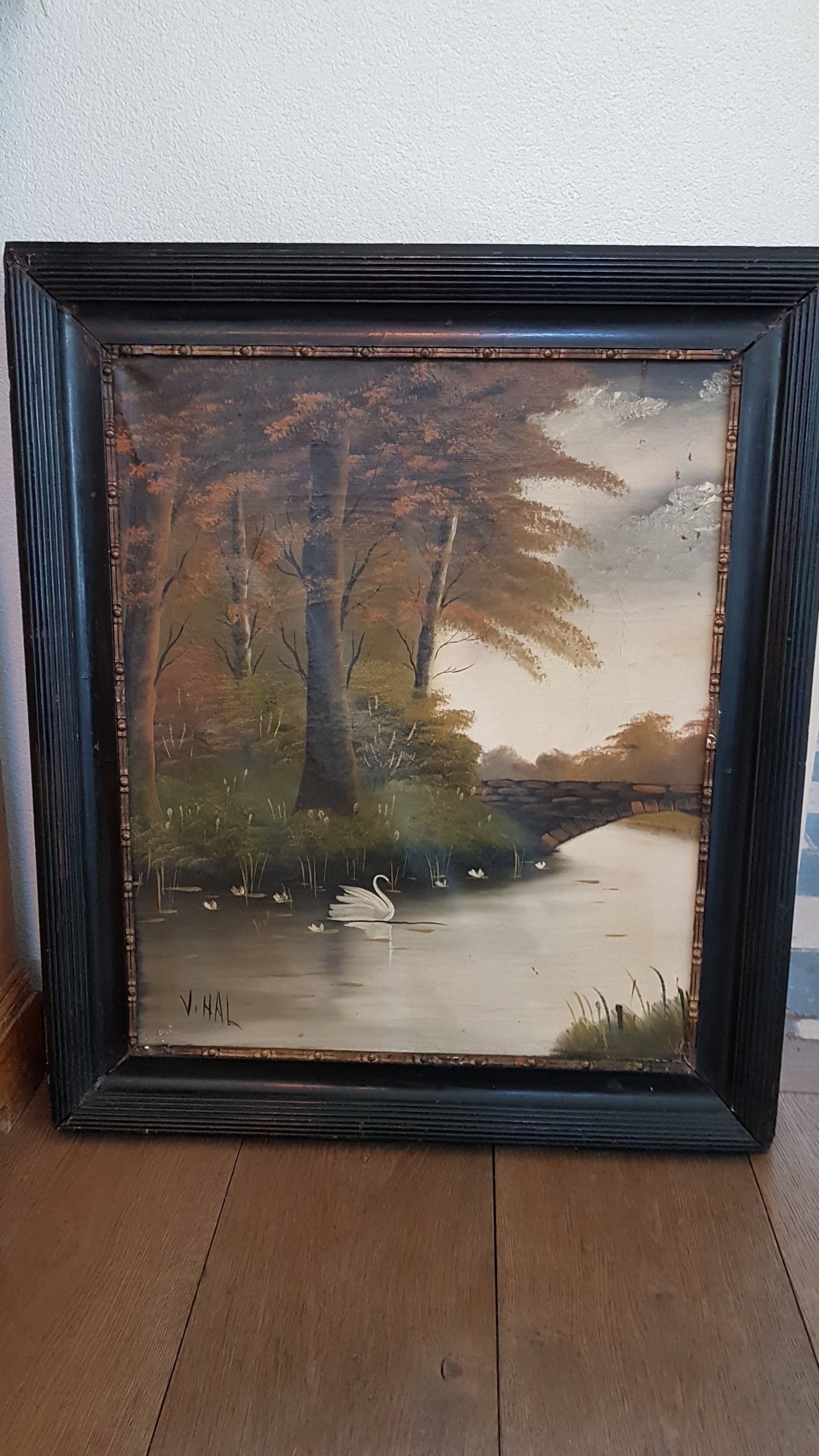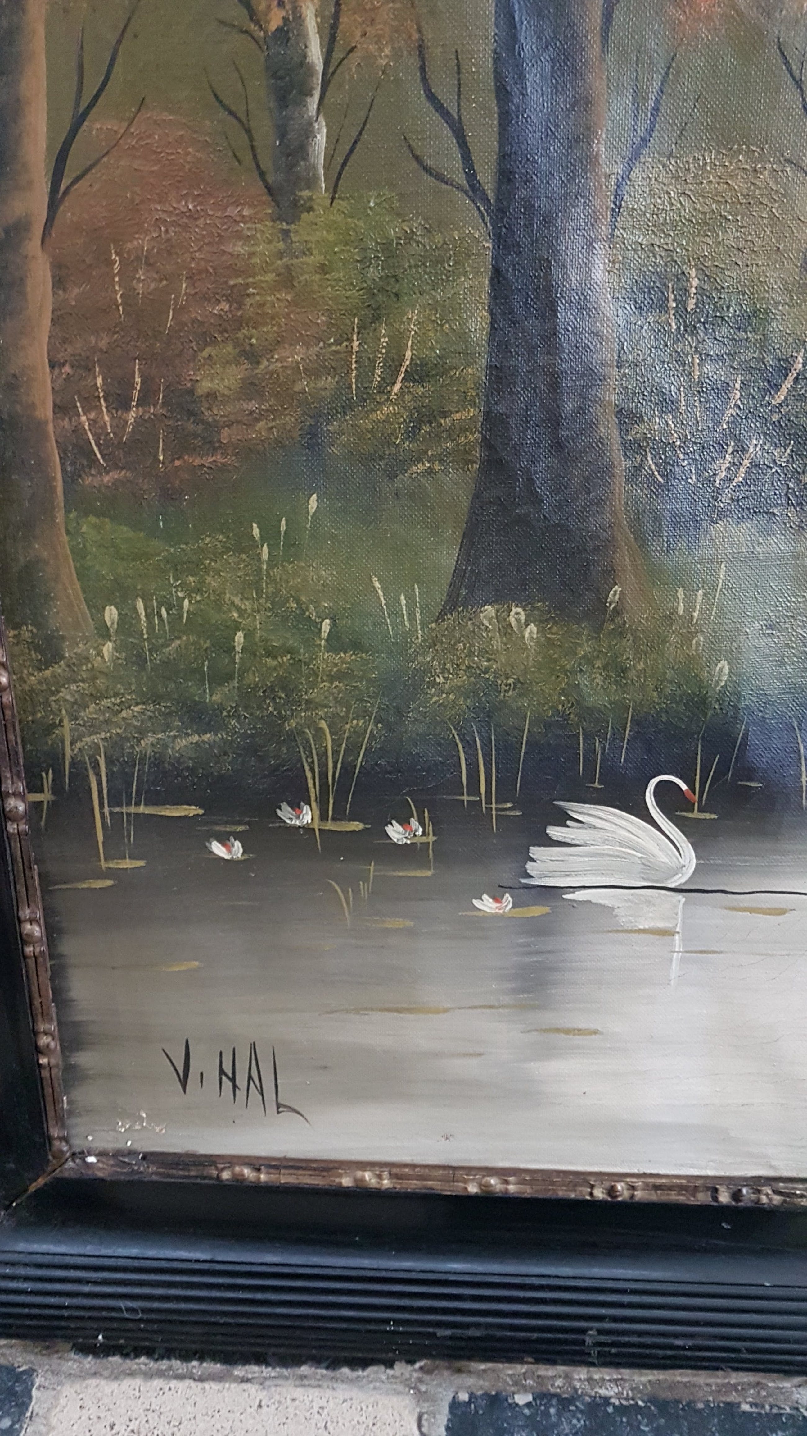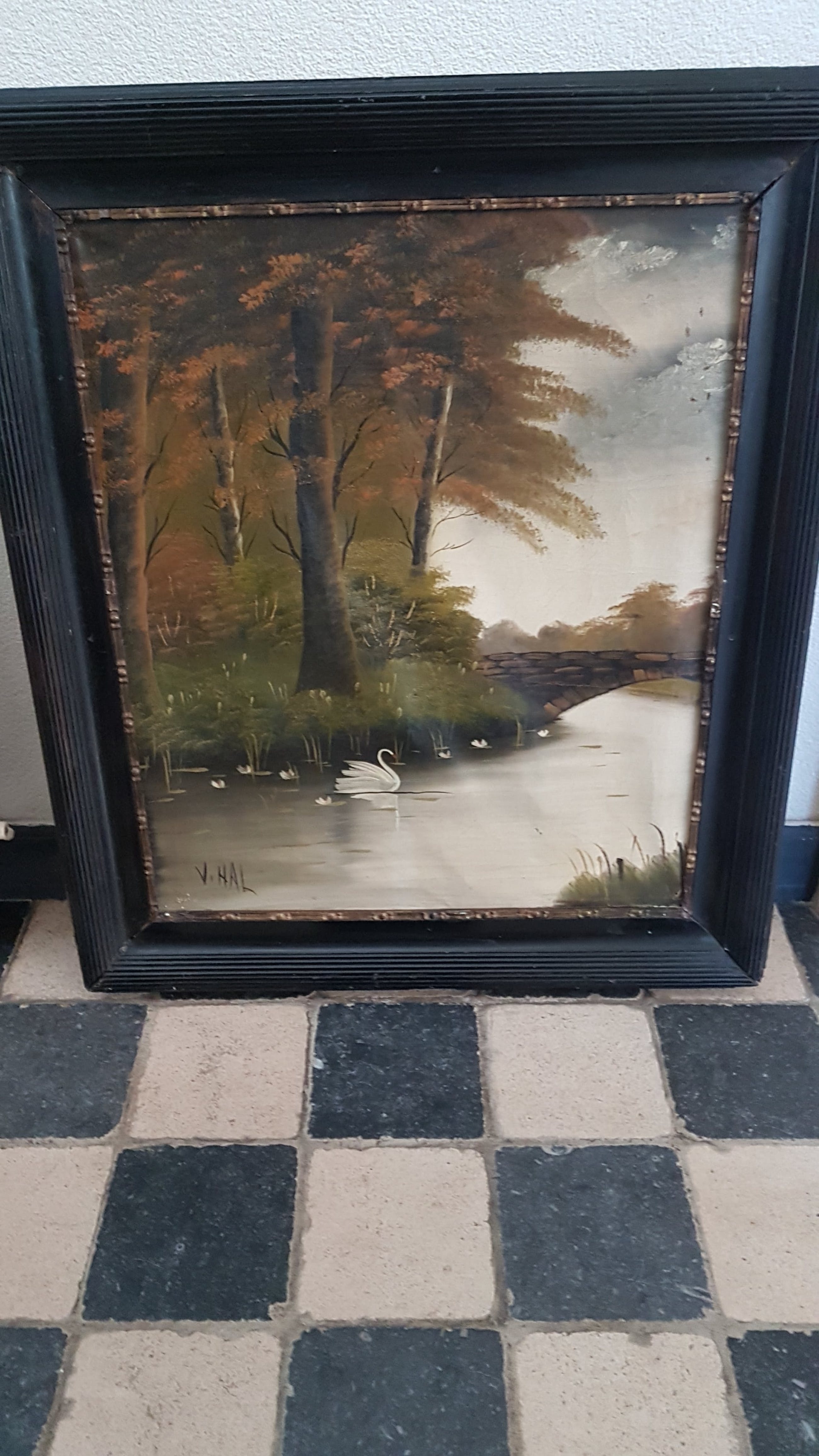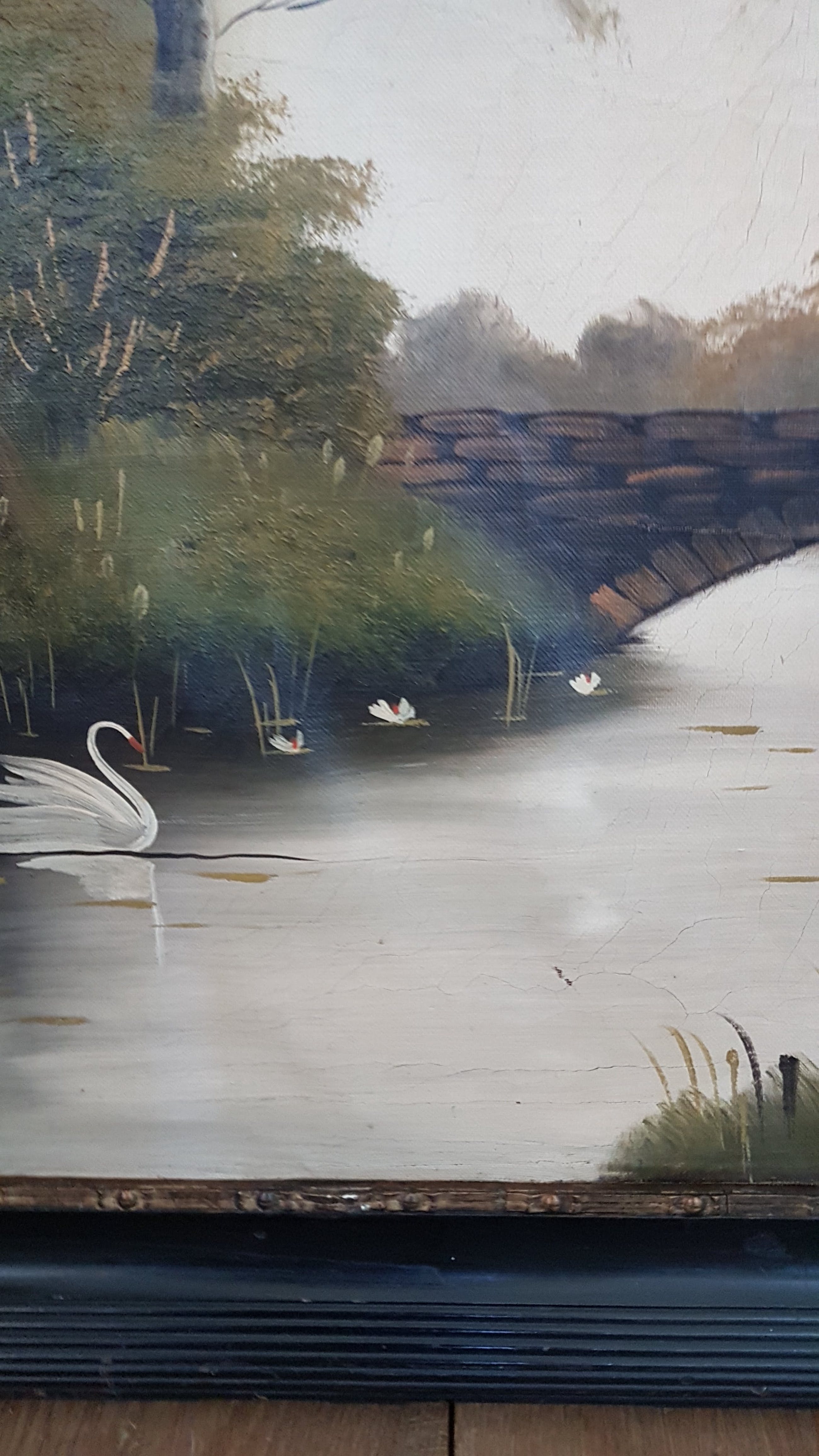 Zeer fraai gesigneerd olieverfschilderij met zwaan en bebossing