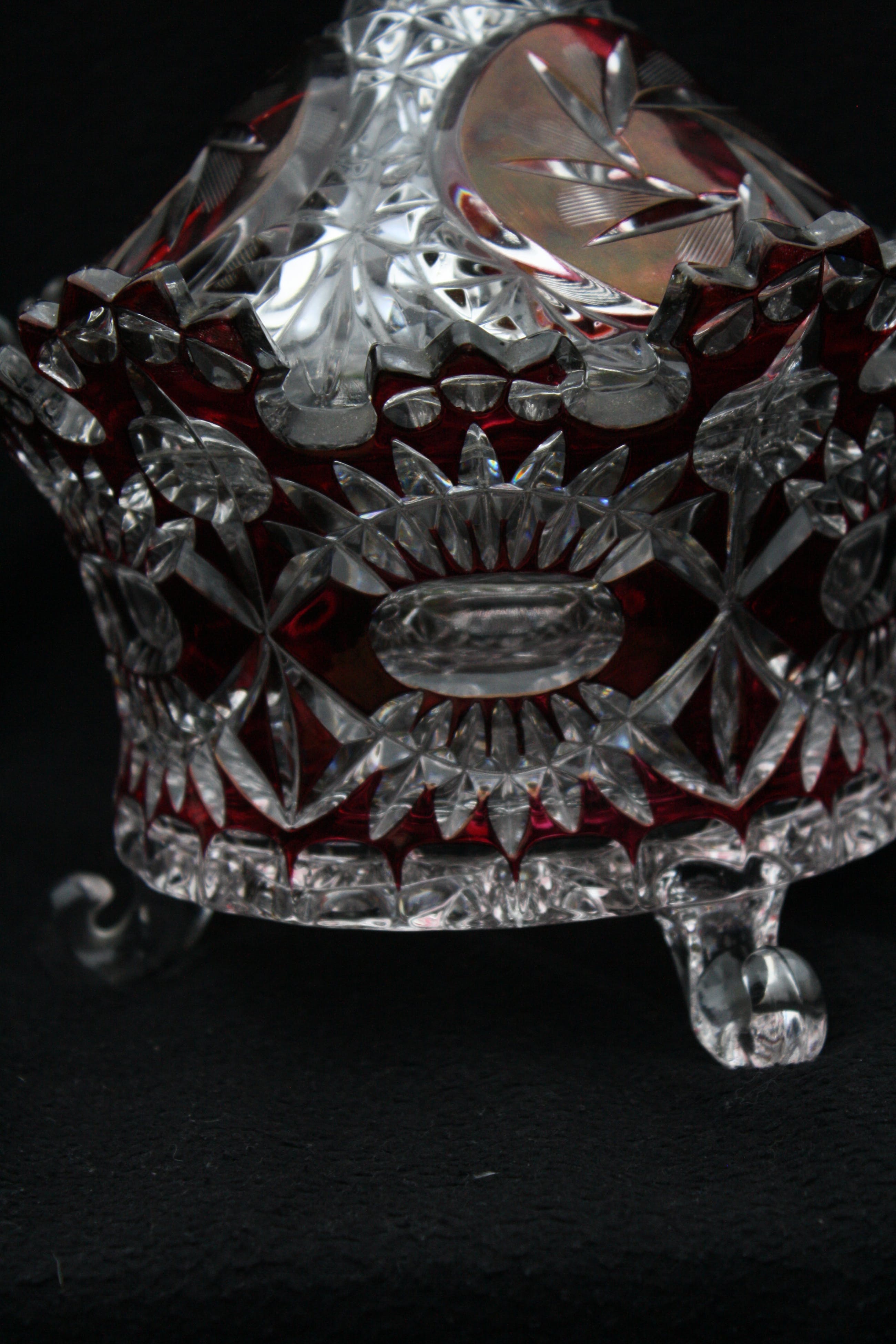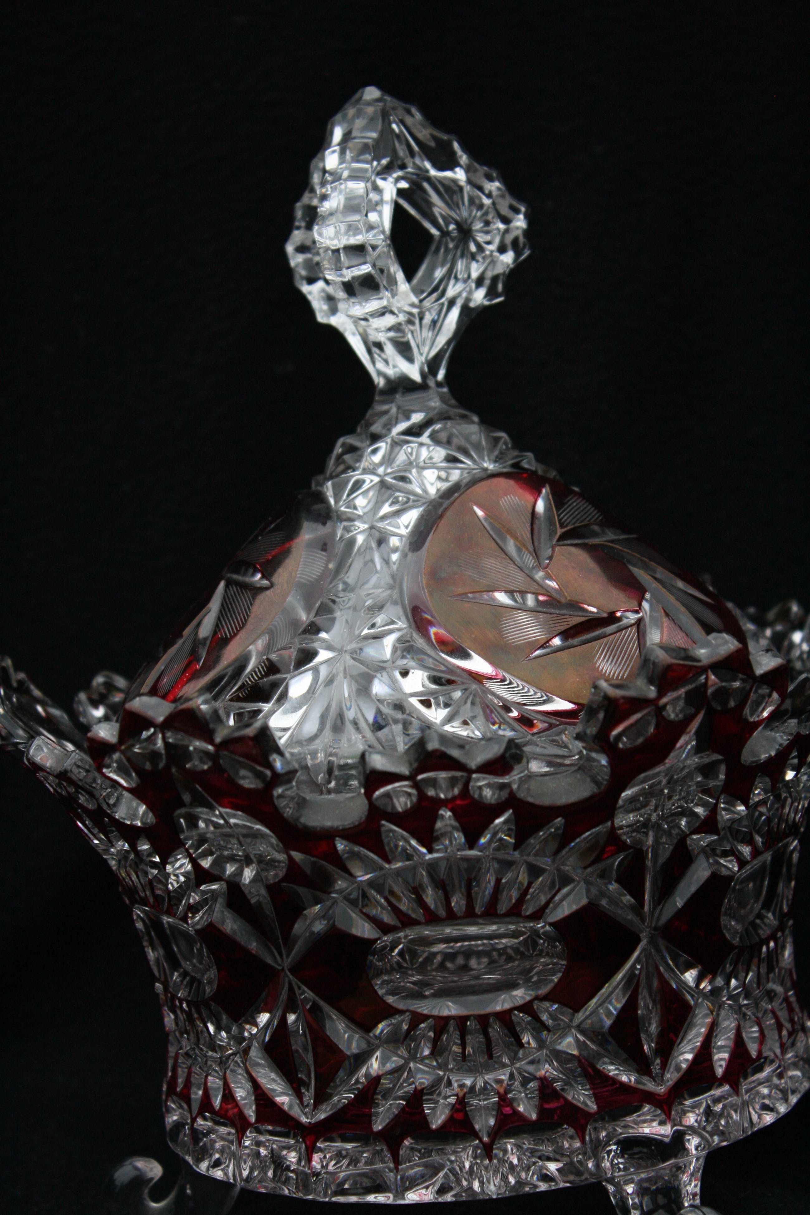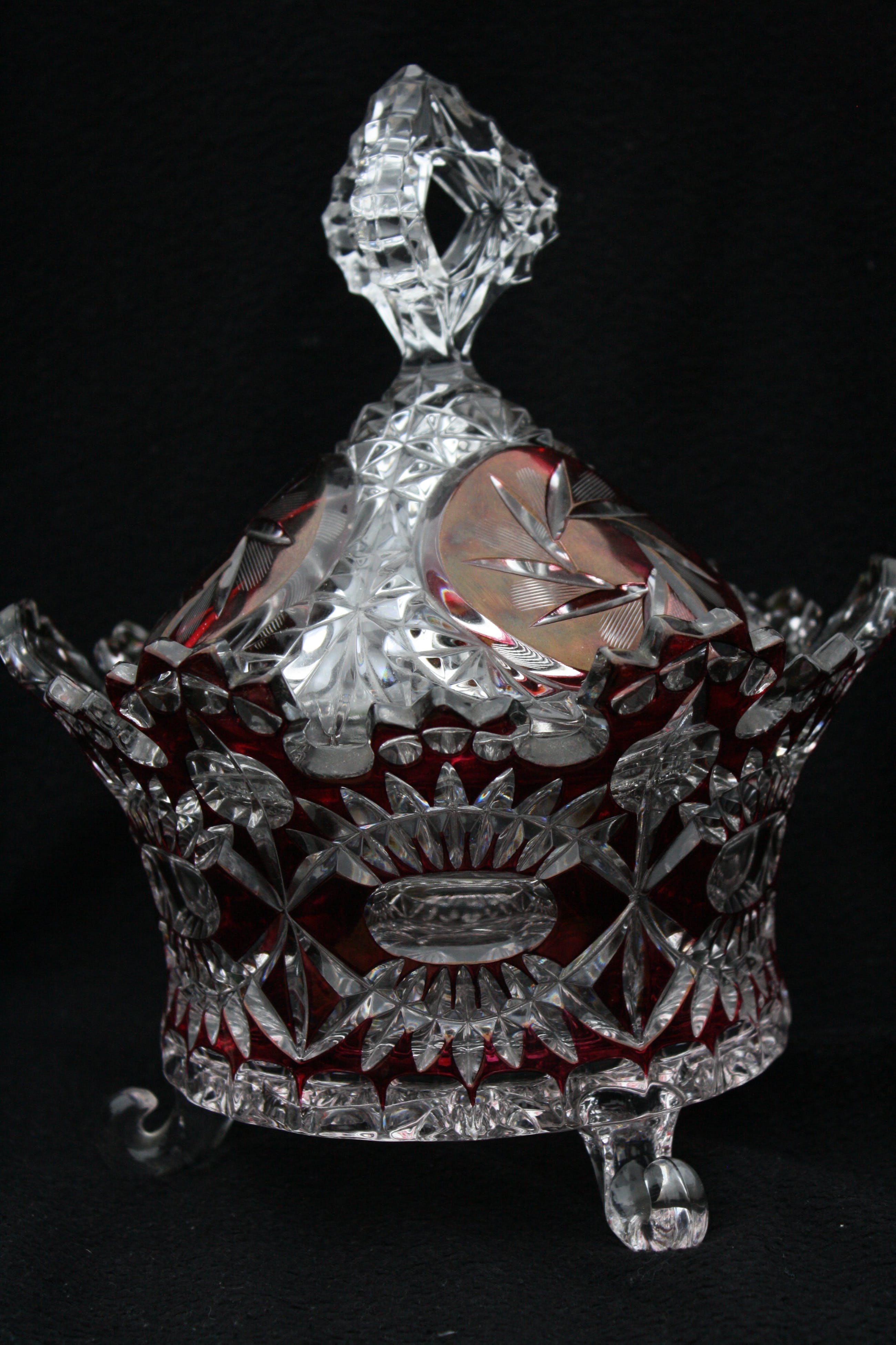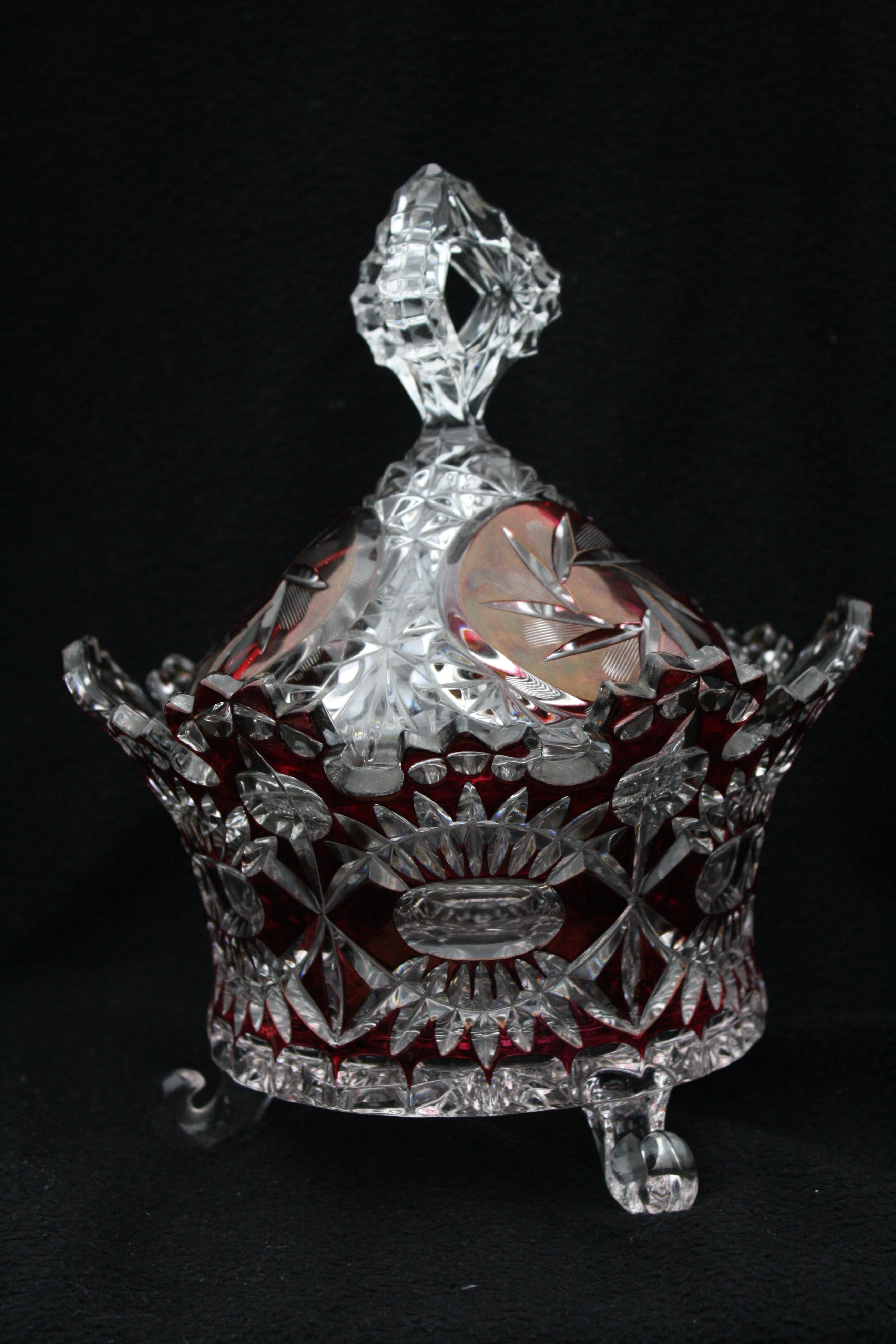 TSJECHISCHE KUNSTGLAS - Een Grote Boheemse Kristalen cranberry gesneden tot doorzichtige Bonbonniere volledig handgeblazen,een pronkstuk,en is al jarenlang in de Familie. (20e eeuw) Verkeerd in perfecte conditie geen scheuren of chips. Bonbonniere Afmeting Hoog 27cm en Breed 23cm. Gewicht is 2400 Gram.