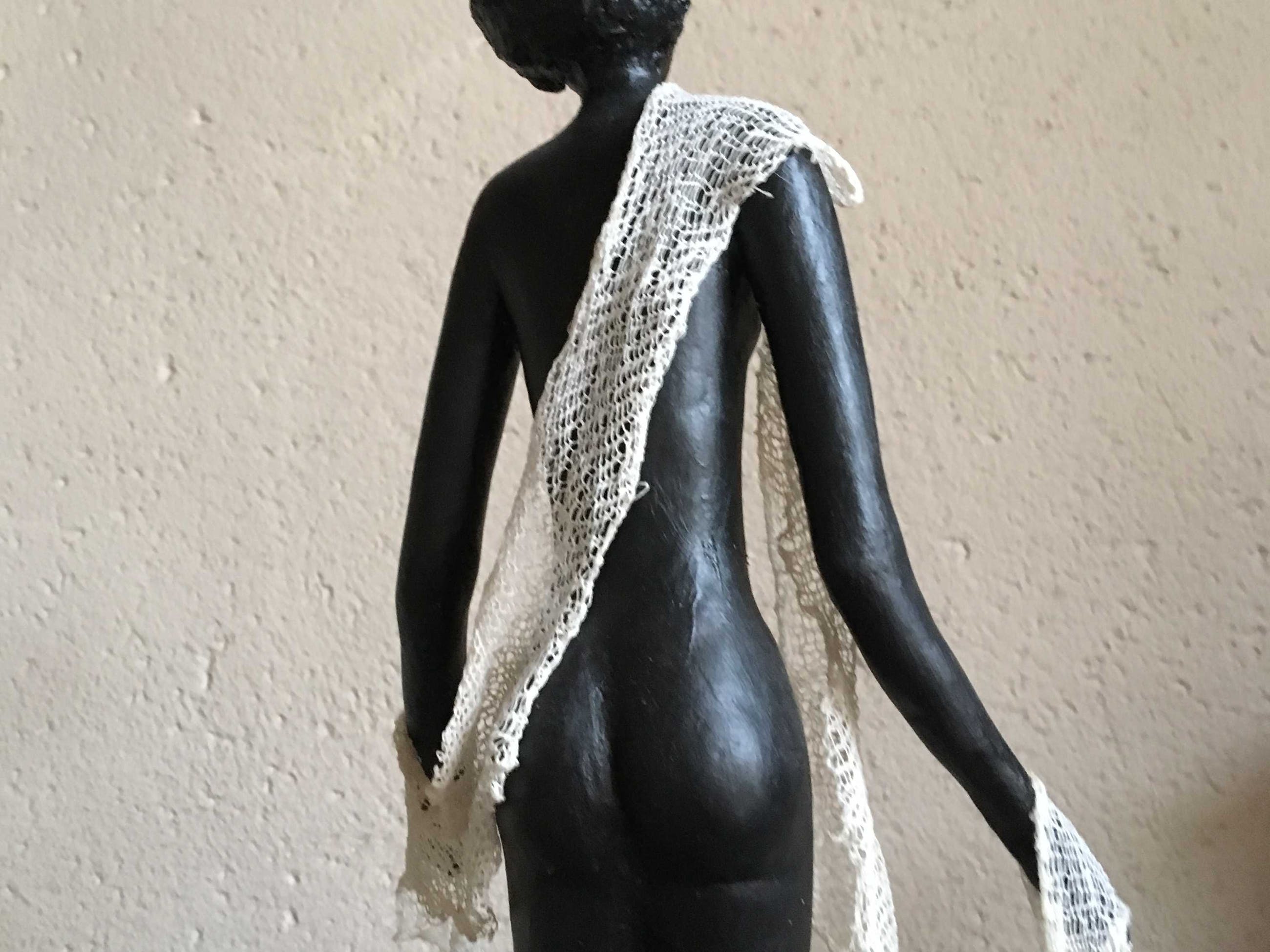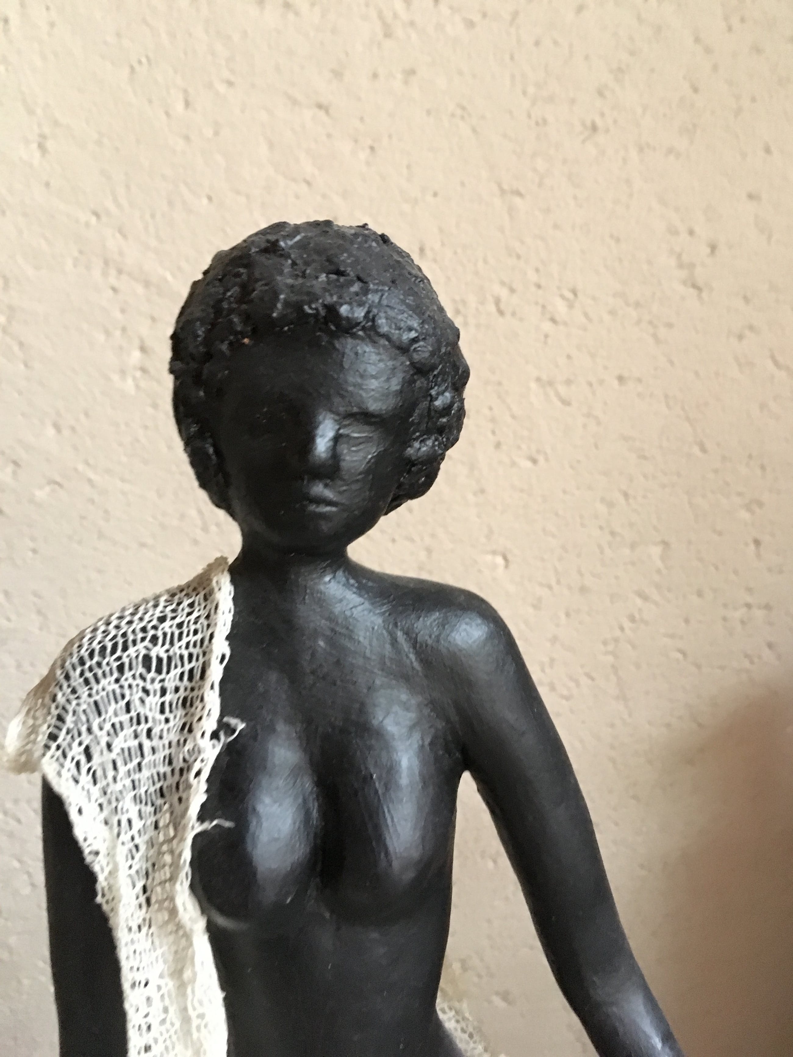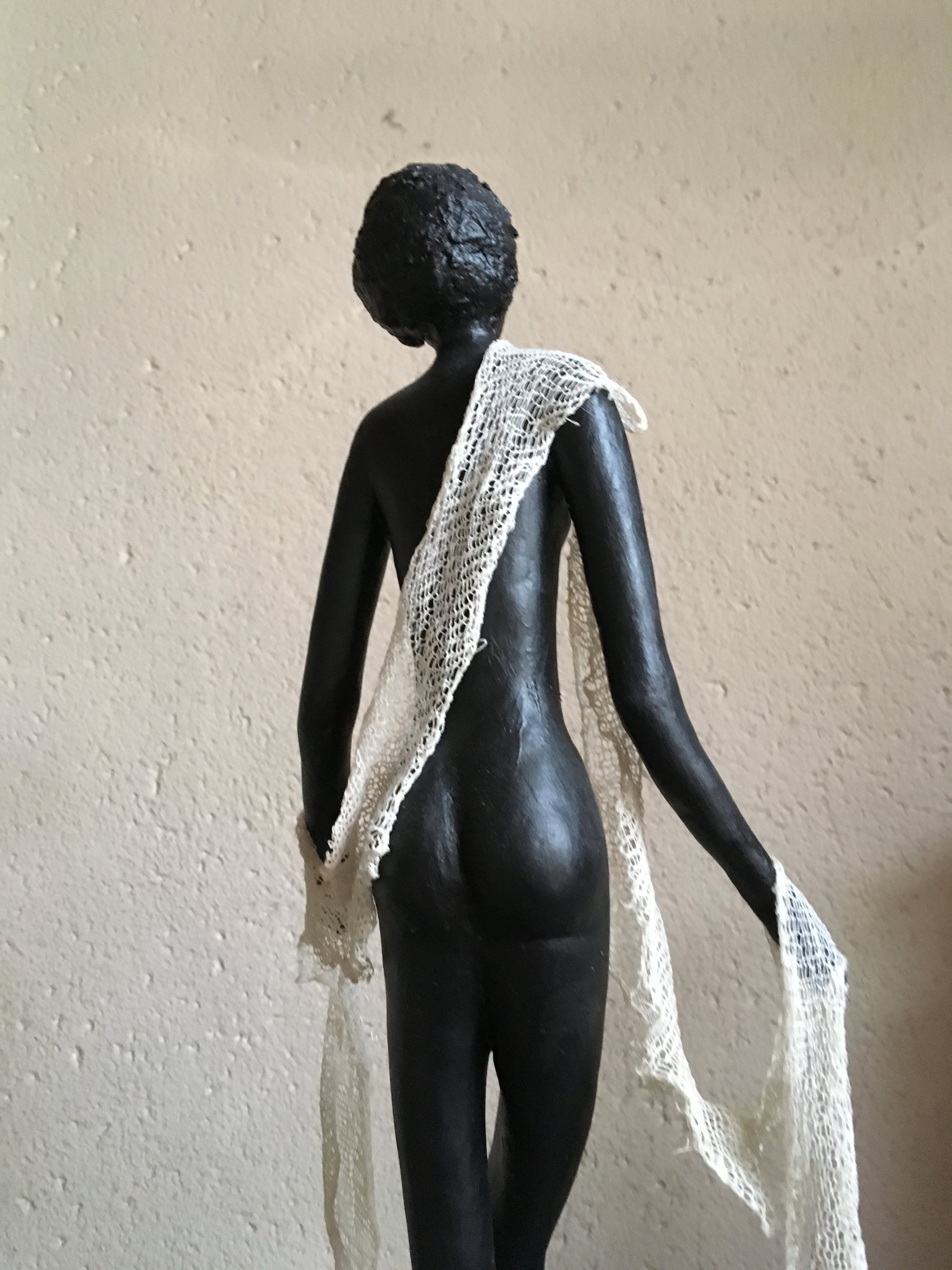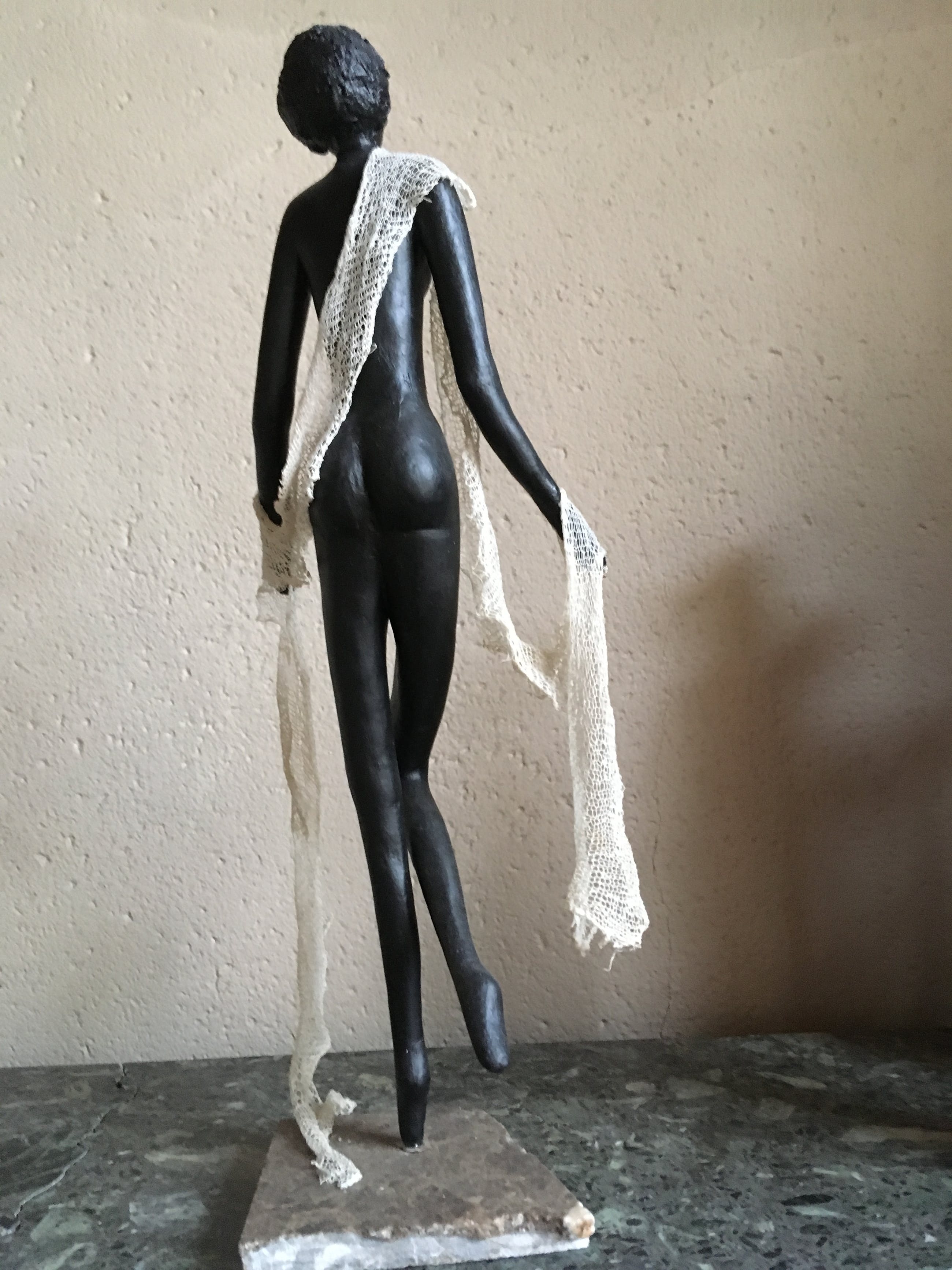 Het beeld is vastgemaakt op een stuk marbranito. De beeldhouwster is Rita Kyndt. Ik ben zeker dat zij dit werk gemaakt heeft, want het komt uit de collectie van mij vader en hij had nog verschillende werken van haar.
