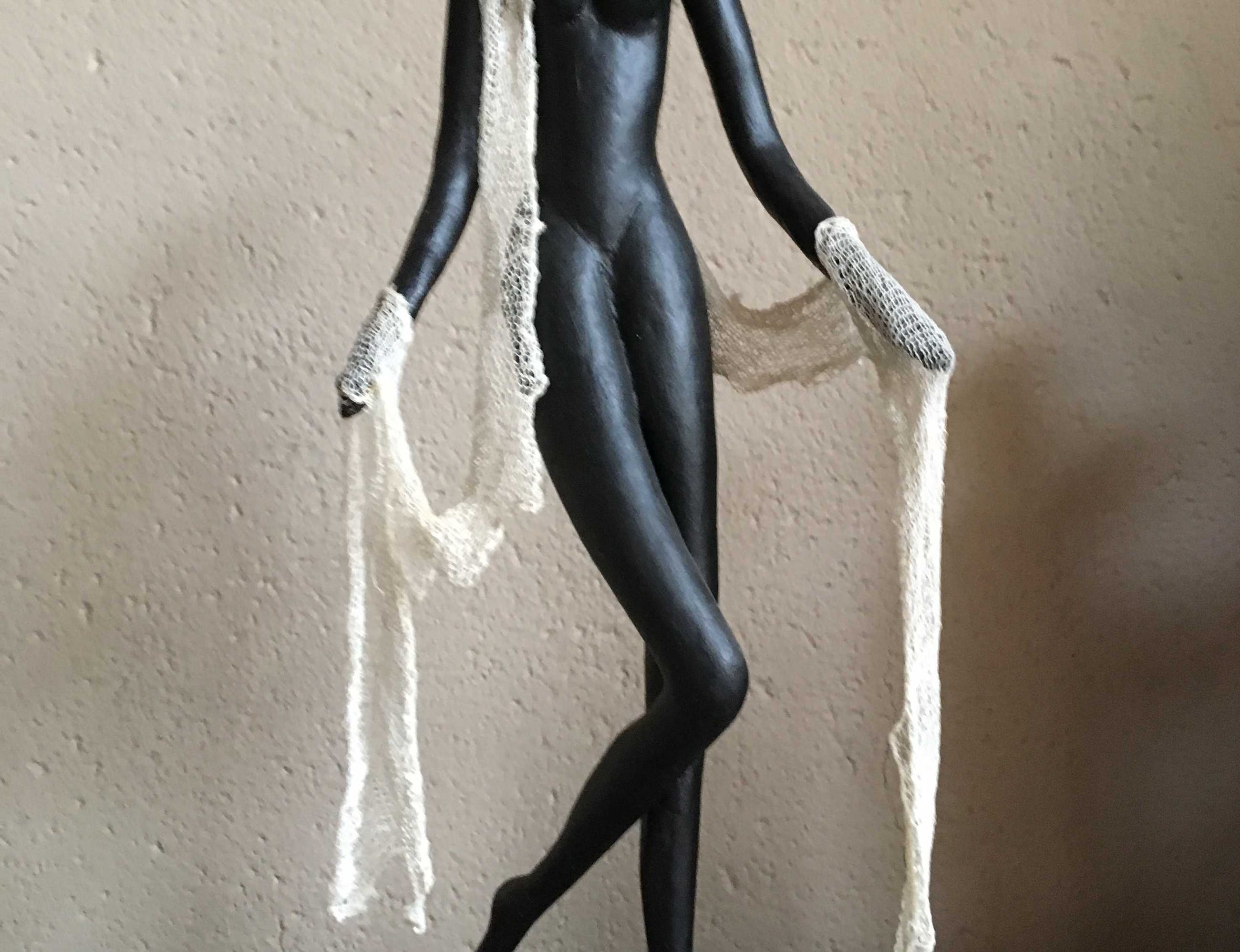 Dit is een afbeelding van een dansende naakte vrouw met een doorzichtige sjaal als enige kledingstuk. Het is een zeer slanke en elegante verschijning, maar met een onbewogen blik.