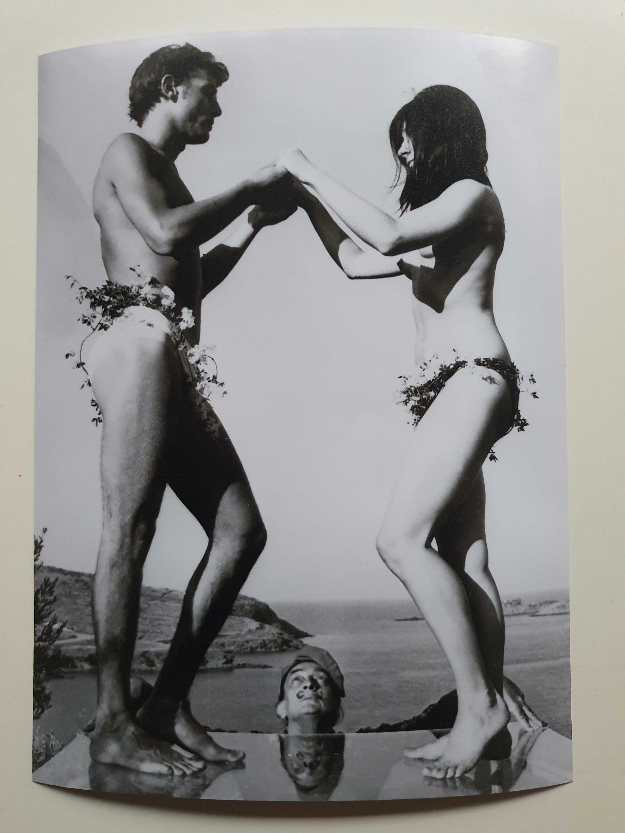 Een fraaie vintage zw/w-foto met Salvador Dalí die opkijkt naar een schaars gekleed aantrekkelijk stel.  Een soort Adam en Eva op een glasplaat ergens voor de (vermoedelijk) Spaanse kust. Het gaat om een latere afdruk.