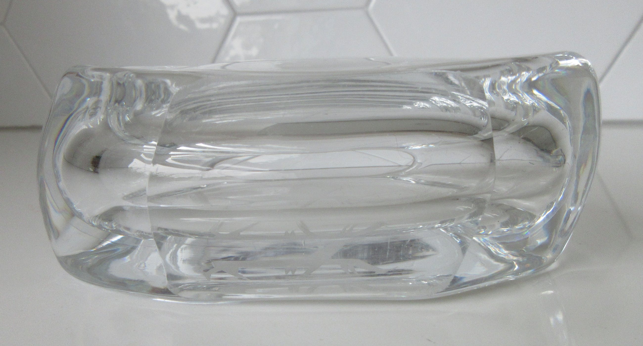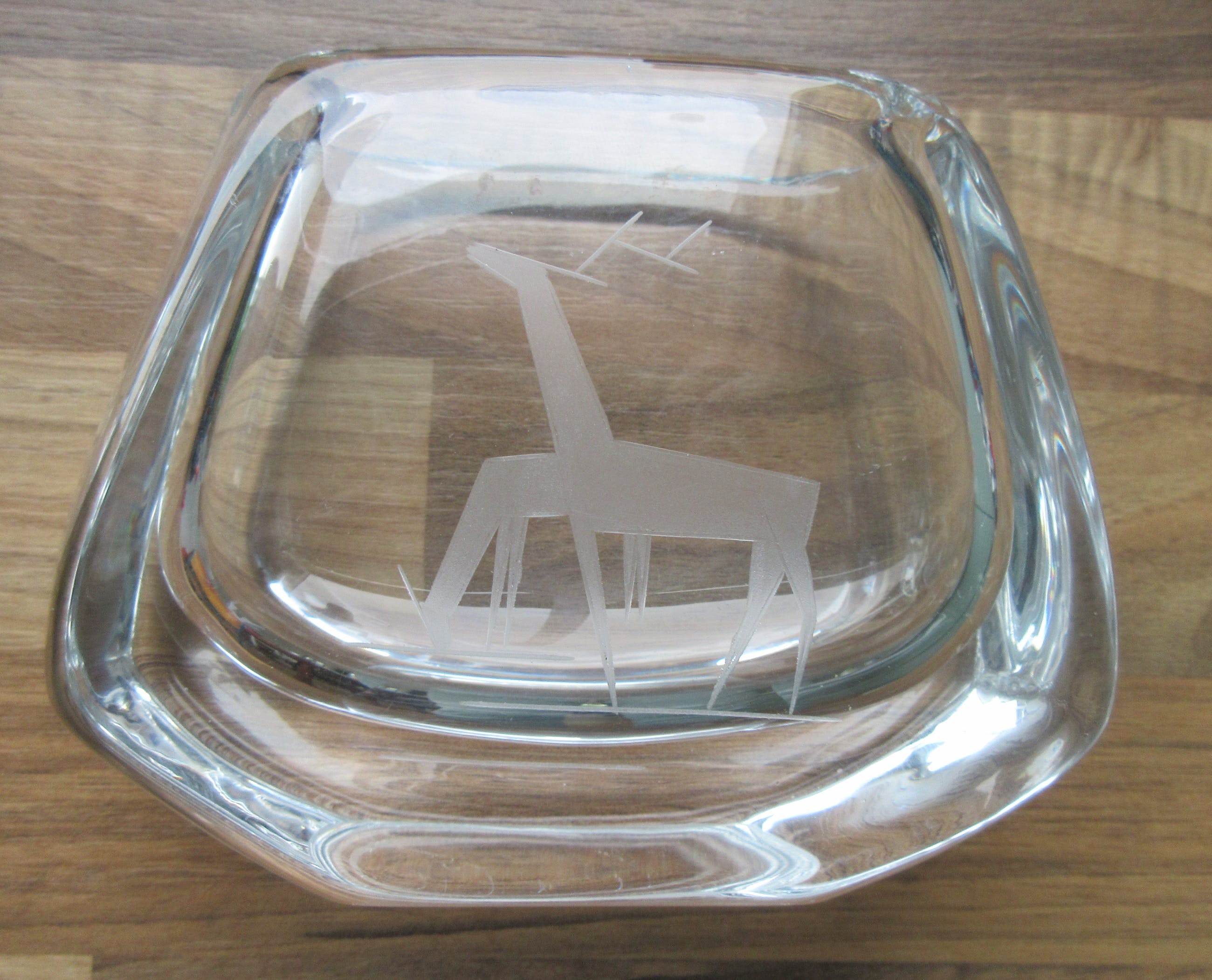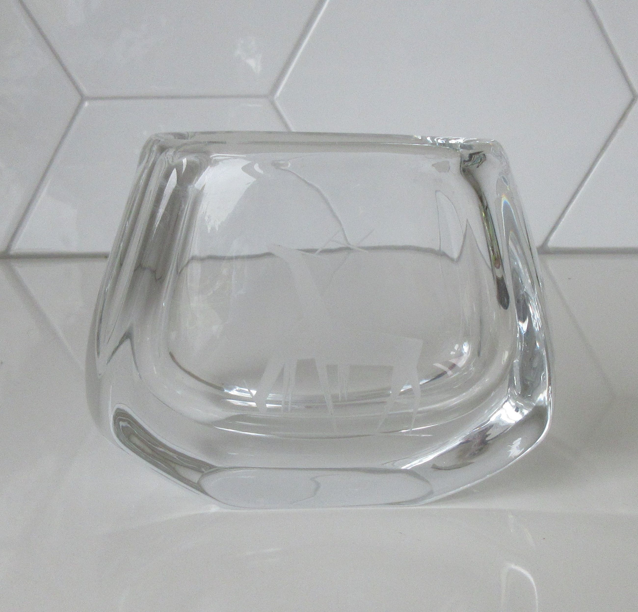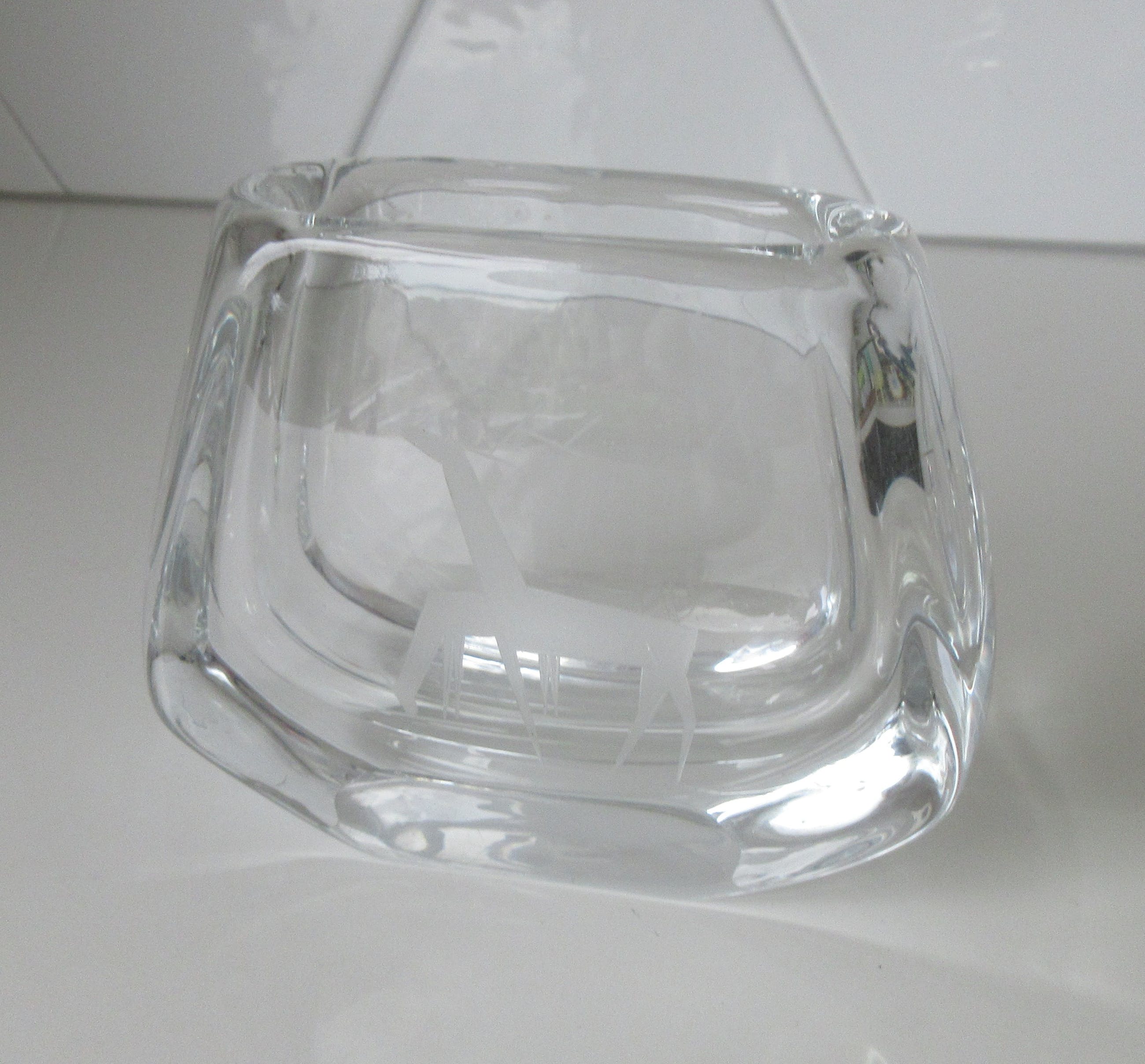 Zweedse dikwandige glazen vaas met etsdecor van gestileerde herten. Mooi vintage stuk glas, niet gesigneerd of gemerkt maar Zweedwse origine.