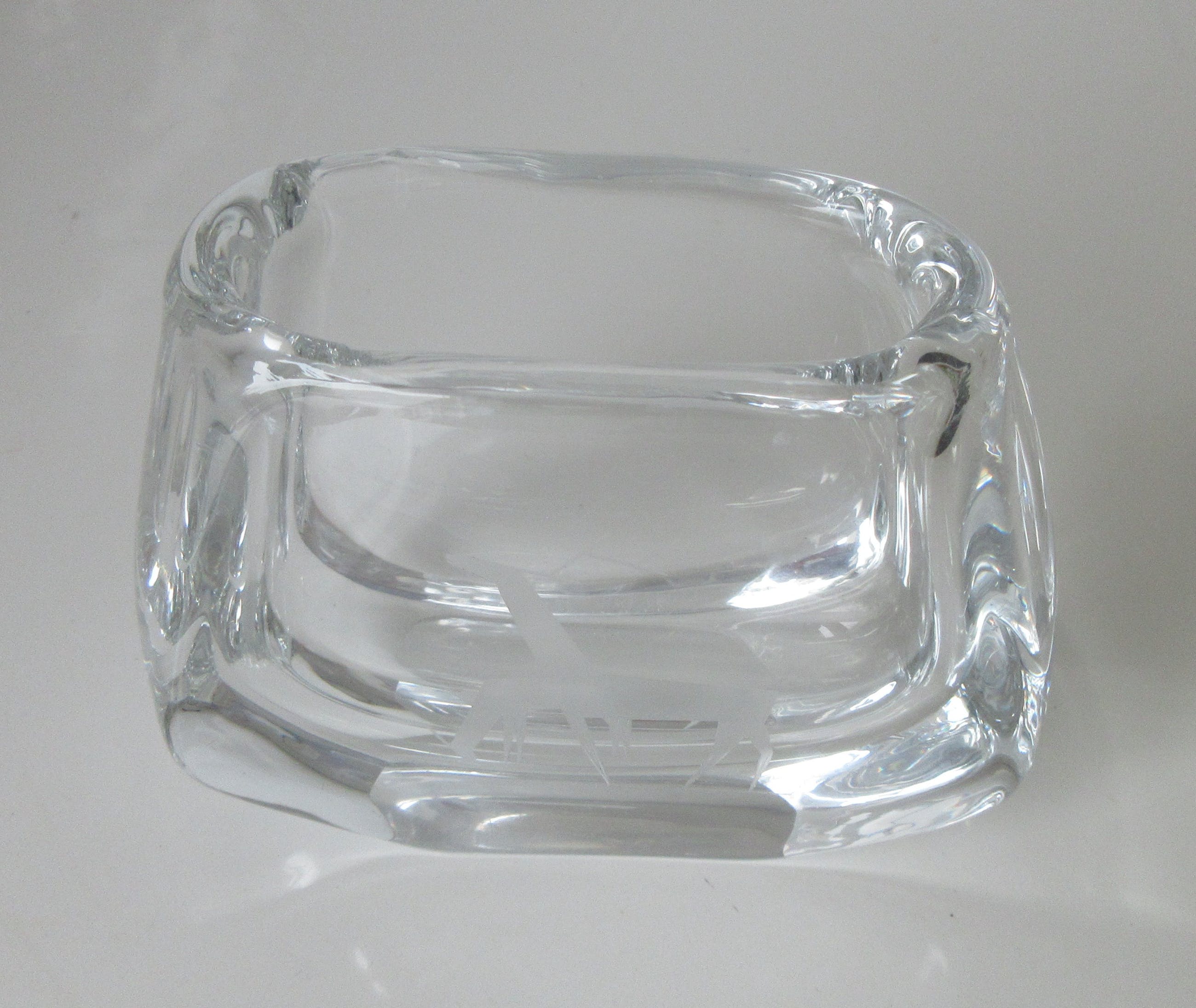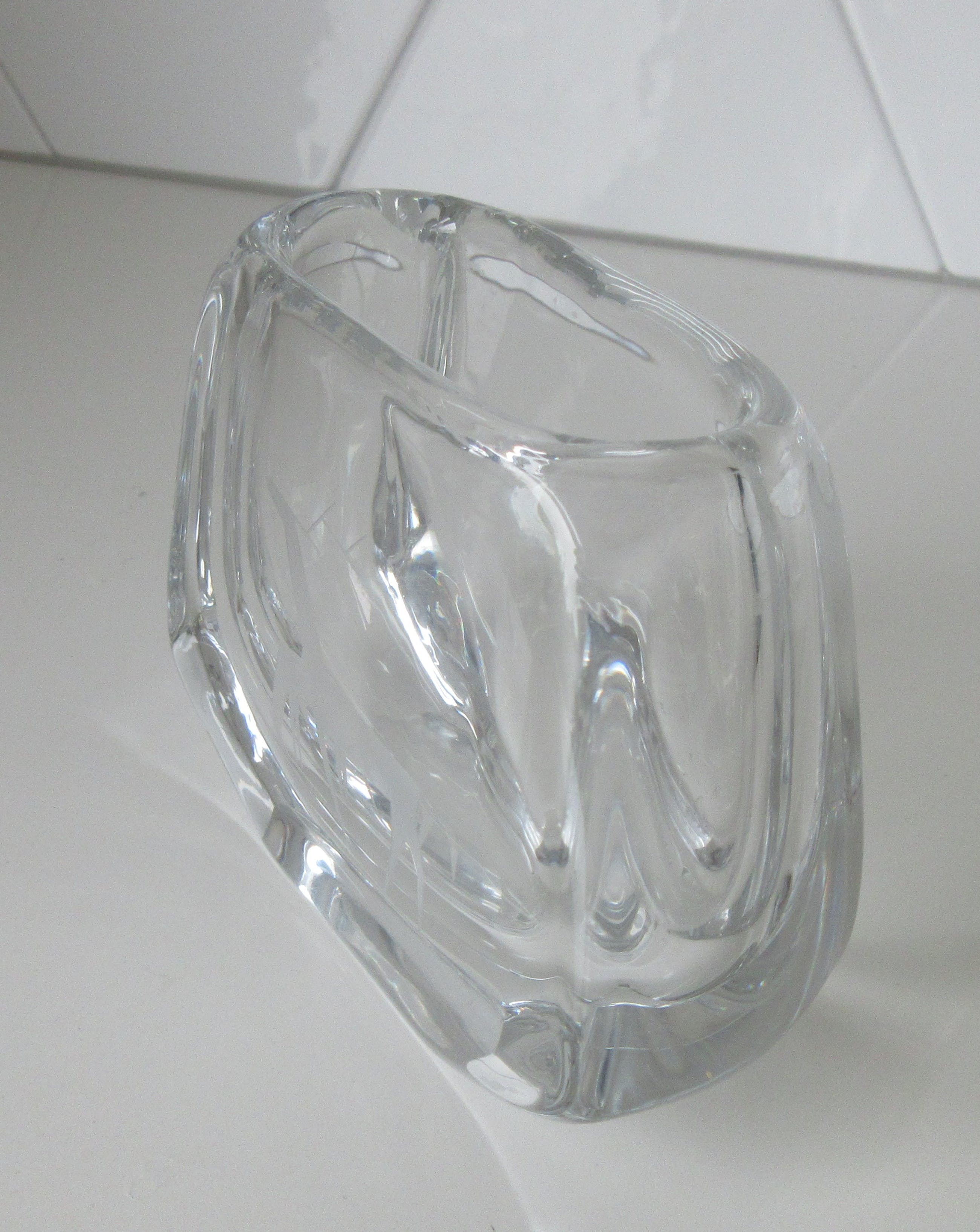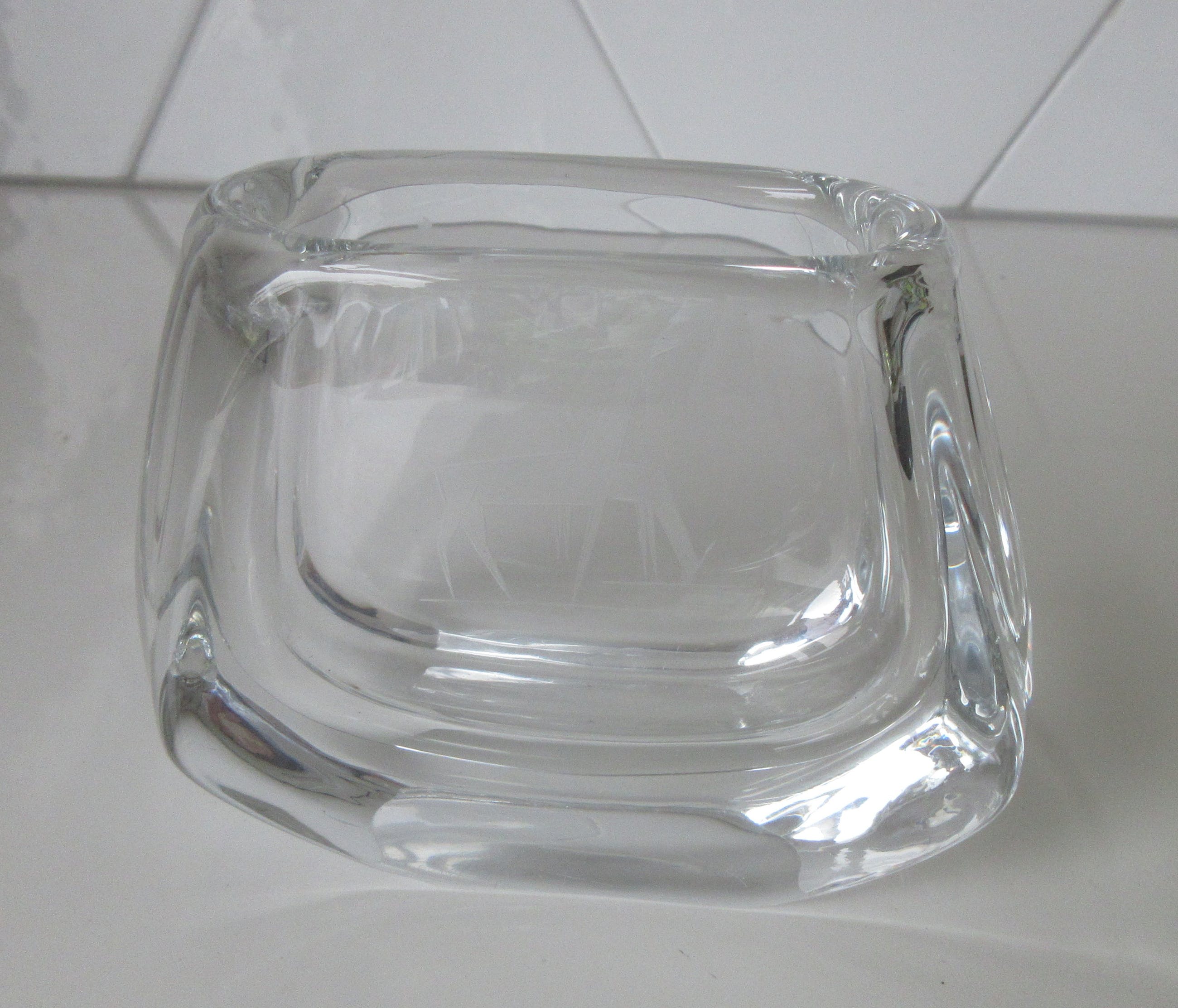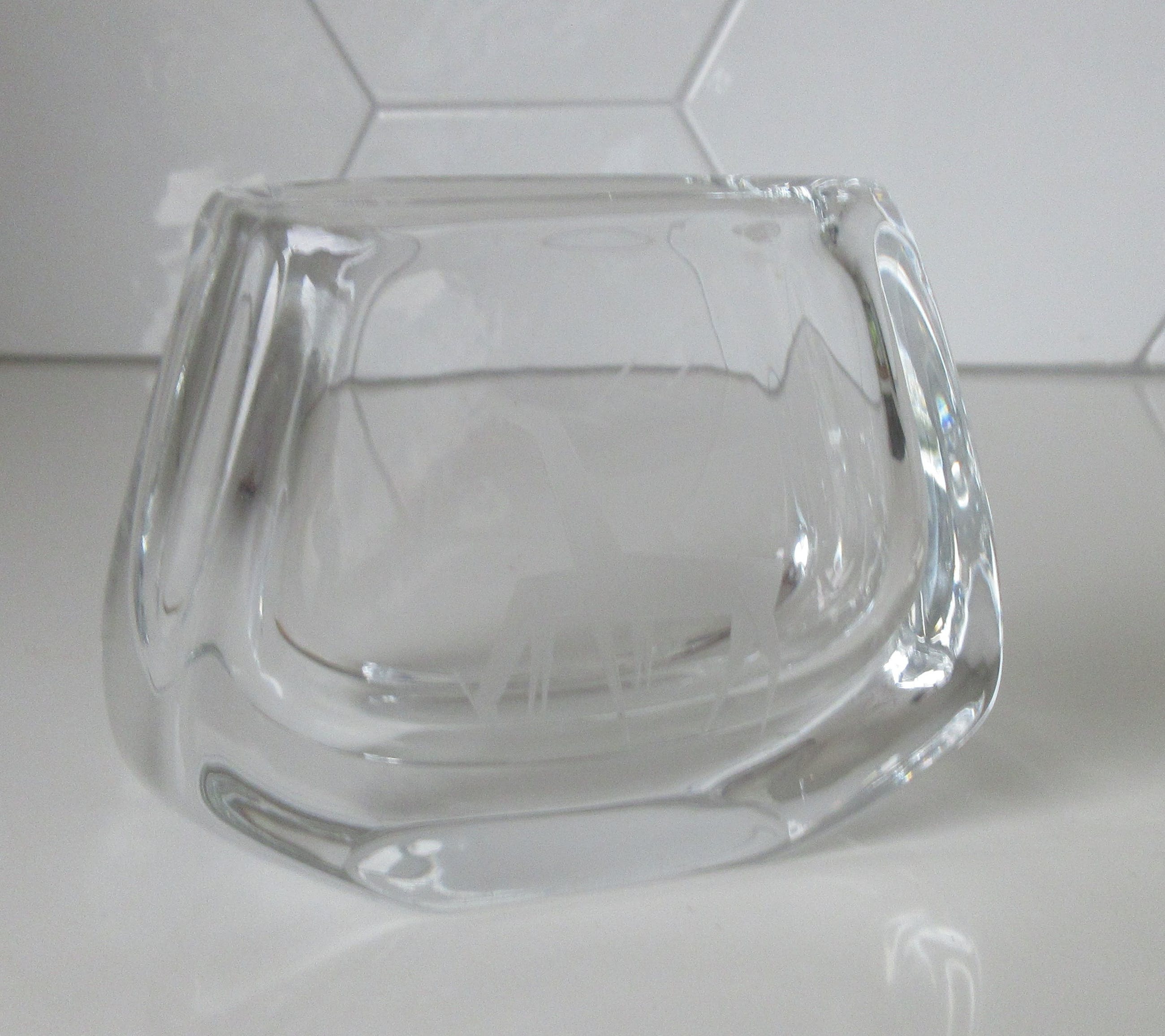 Zweedse dikwandige glazen vaas met etsdecor van gestileerde herten. Mooi vintage stuk glas, niet gesigneerd of gemerkt maar Zweedwse origine.