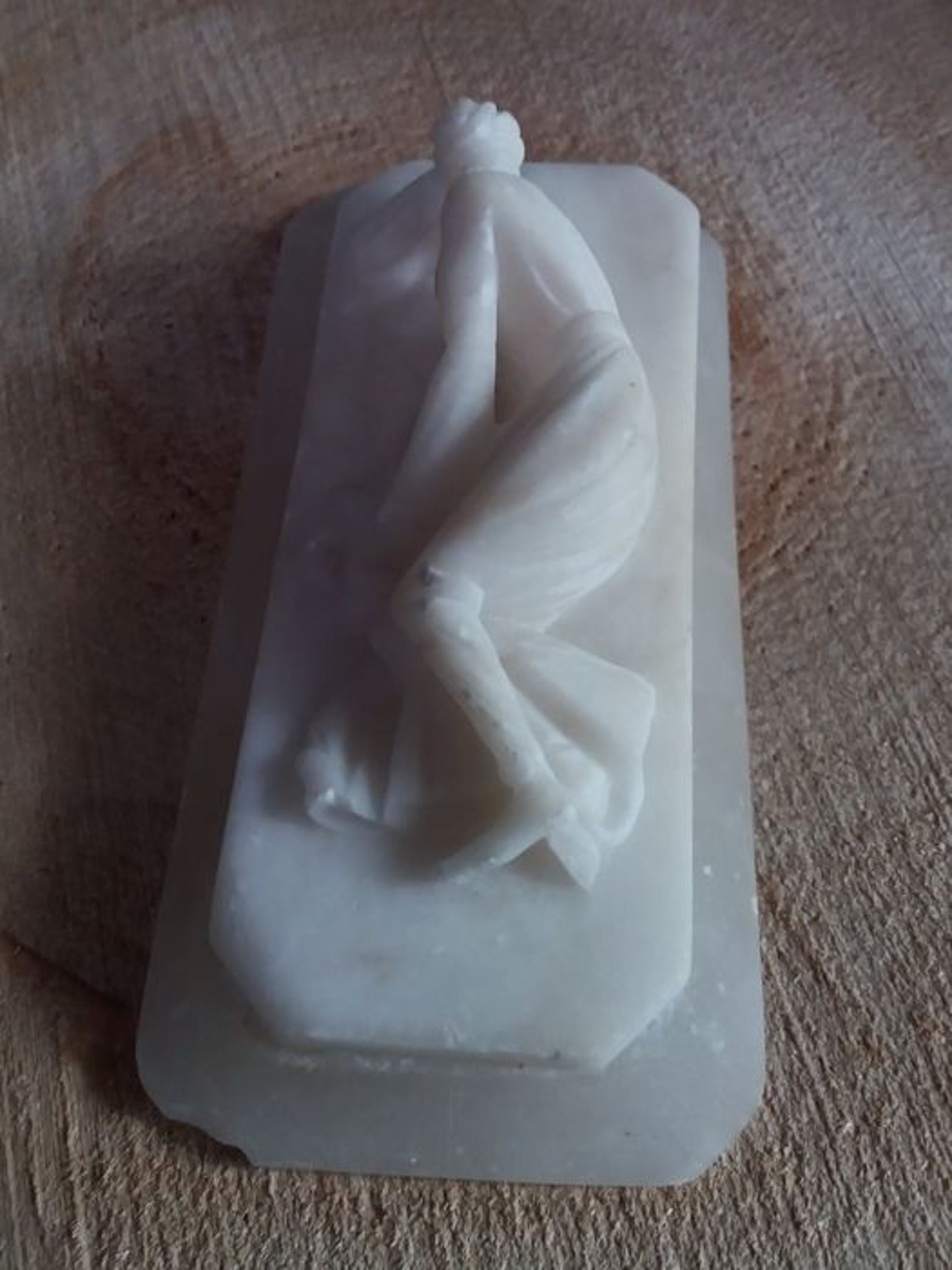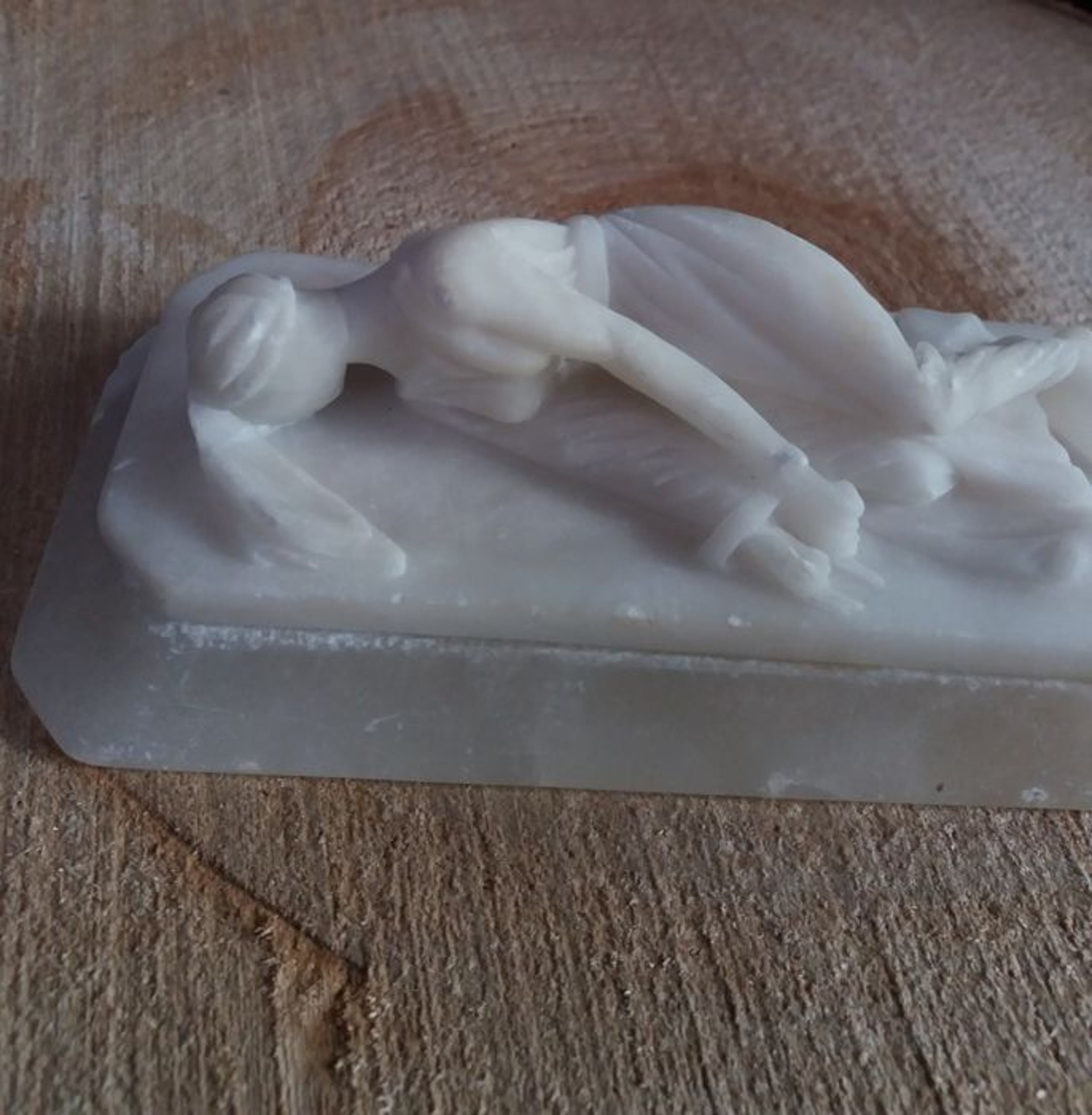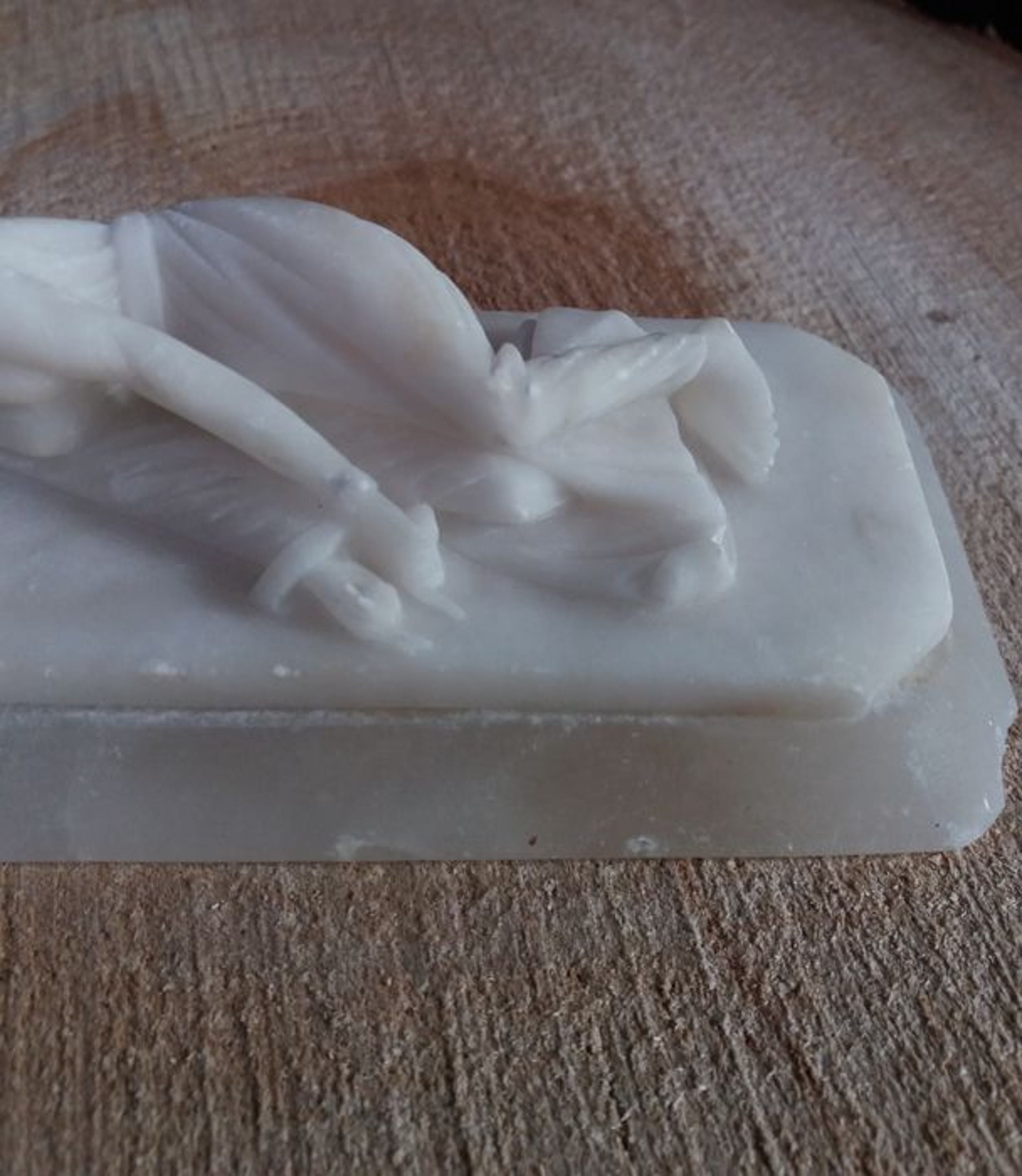 Uit mijn collectie: De Heilige Cecilia naar het origineel van Stefano Maderno in Trastevere (1600). Uitgevoerd in carrarisch marmer, op een carrarisch marmeren basement. Gemaakt vroeg 20ste eeuw. 1930Cecilia was een goed christen die haar man en broer bekeerde. Gedrieën verzorgden zij de martelaren. Als haar broers een officier bekeren, gaat het mis. Beiden worden gedood. Dat kon natuurlijk voor Cecilia niet zonder gevolgen blijven. Eerst probeerden de Romeinen haar in haar bad naar de andere wereld te sturen. Dit mislukte, Cecilia bleef alsmaar hymnen zingen. Toen werd het zwaard tegen deze hardnekkige christelijke dame in stelling gebracht. Een beul sloeg drie keer toe, maar dit leverde ook al de nodige onvoorziene problemen op. Haar hoofd werd niet van de romp gescheiden en Cecilia bleef nog enkele dagen in leven. In die tijd bracht zij nog menige heiden tot het juiste geloof.