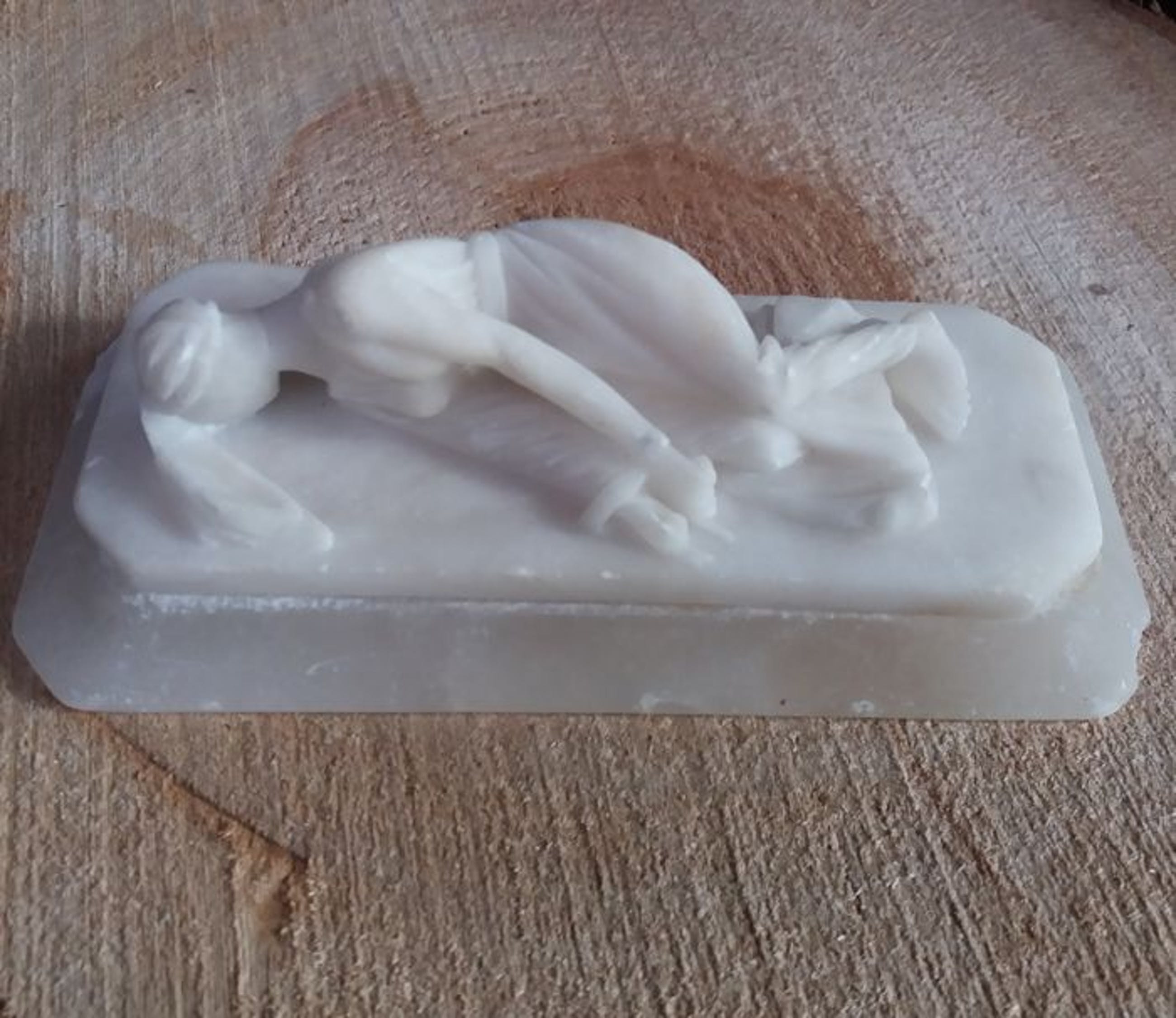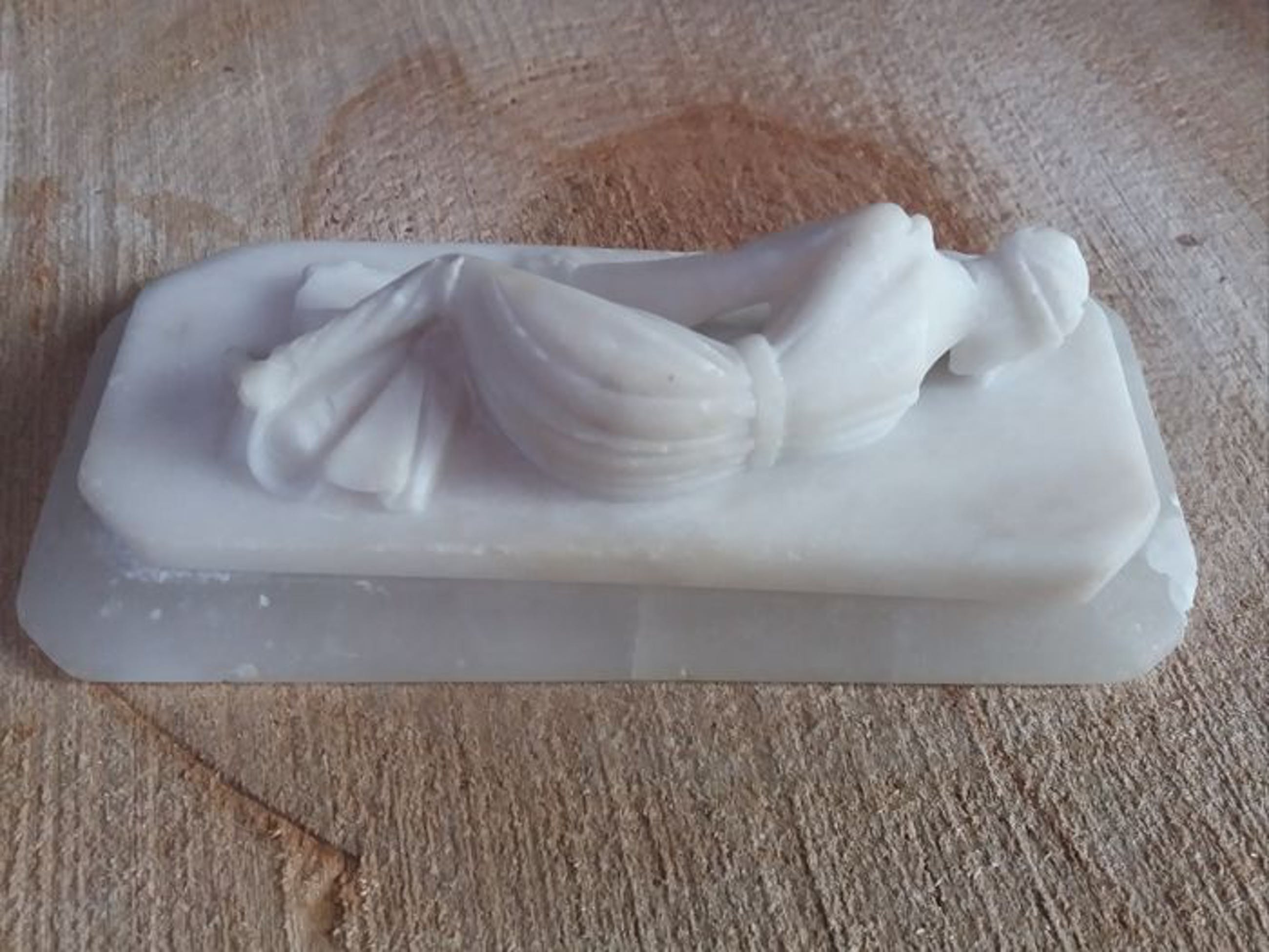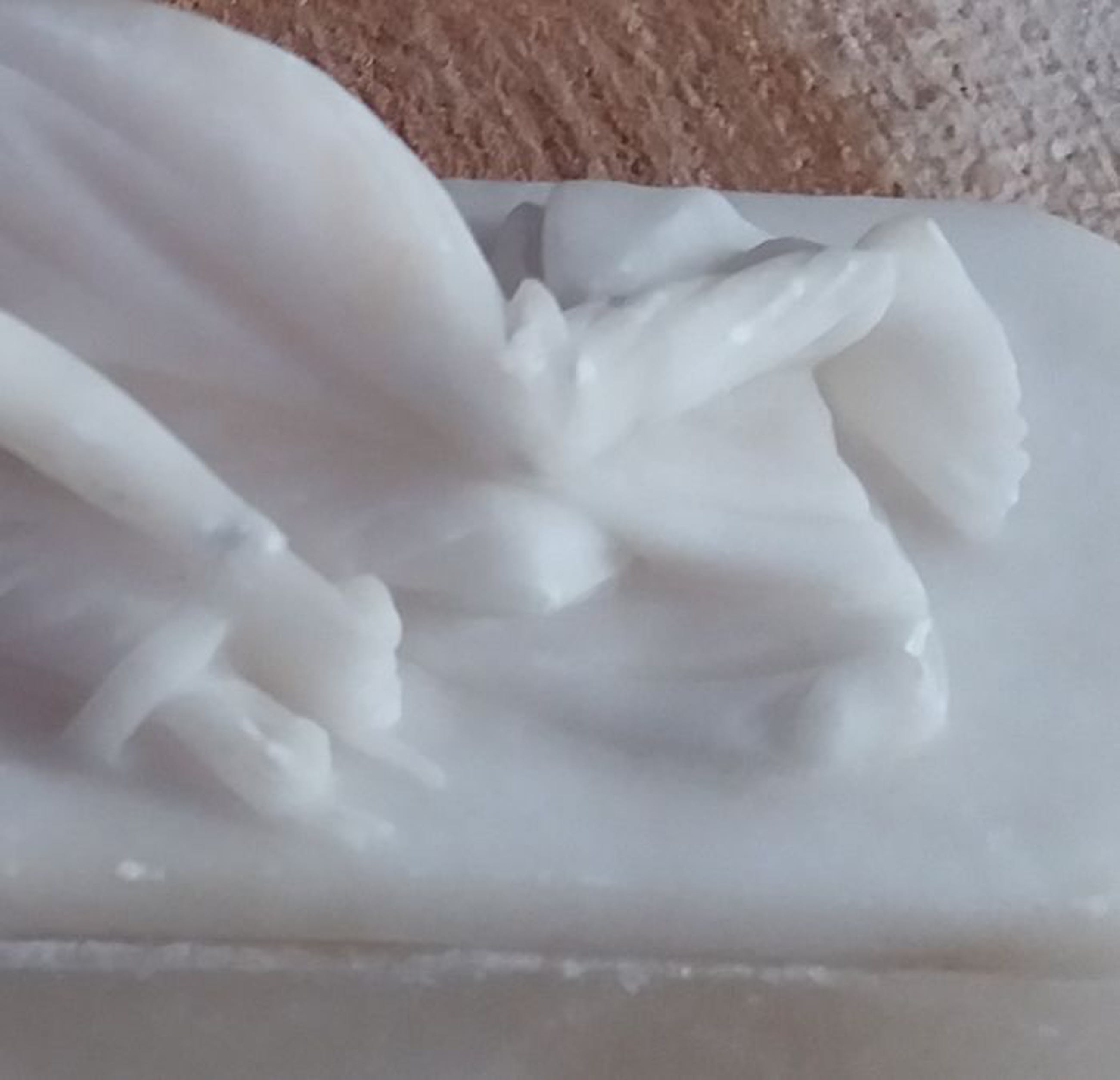Uit mijn collectie: De Heilige Cecilia naar het origineel van Stefano Maderno in Trastevere (1600). Uitgevoerd in carrarisch marmer, op een carrarisch marmeren basement. Gemaakt vroeg 20ste eeuw. 1930Cecilia was een goed christen die haar man en broer bekeerde. Gedrieën verzorgden zij de martelaren. Als haar broers een officier bekeren, gaat het mis. Beiden worden gedood. Dat kon natuurlijk voor Cecilia niet zonder gevolgen blijven. Eerst probeerden de Romeinen haar in haar bad naar de andere wereld te sturen. Dit mislukte, Cecilia bleef alsmaar hymnen zingen. Toen werd het zwaard tegen deze hardnekkige christelijke dame in stelling gebracht. Een beul sloeg drie keer toe, maar dit leverde ook al de nodige onvoorziene problemen op. Haar hoofd werd niet van de romp gescheiden en Cecilia bleef nog enkele dagen in leven. In die tijd bracht zij nog menige heiden tot het juiste geloof.