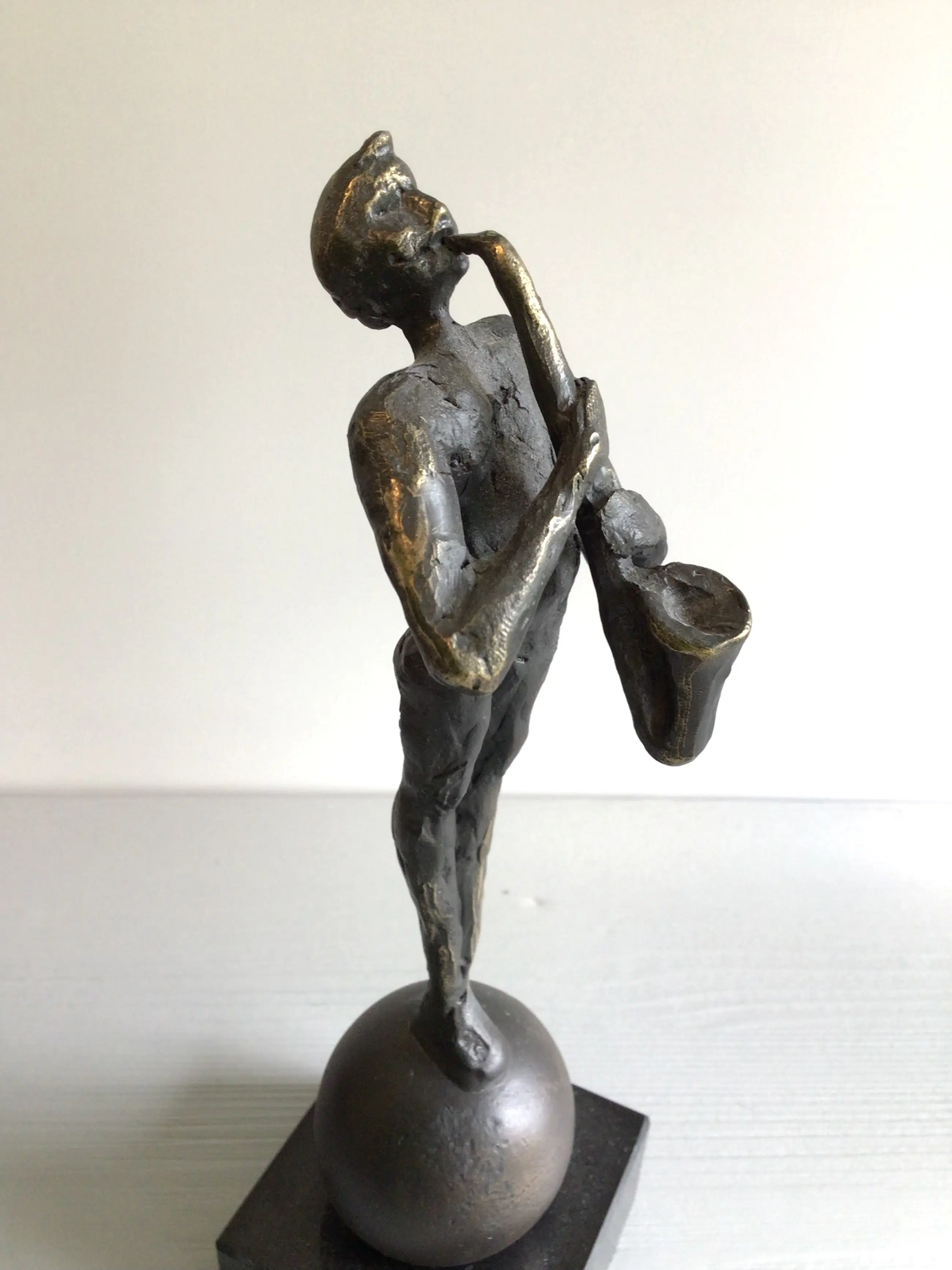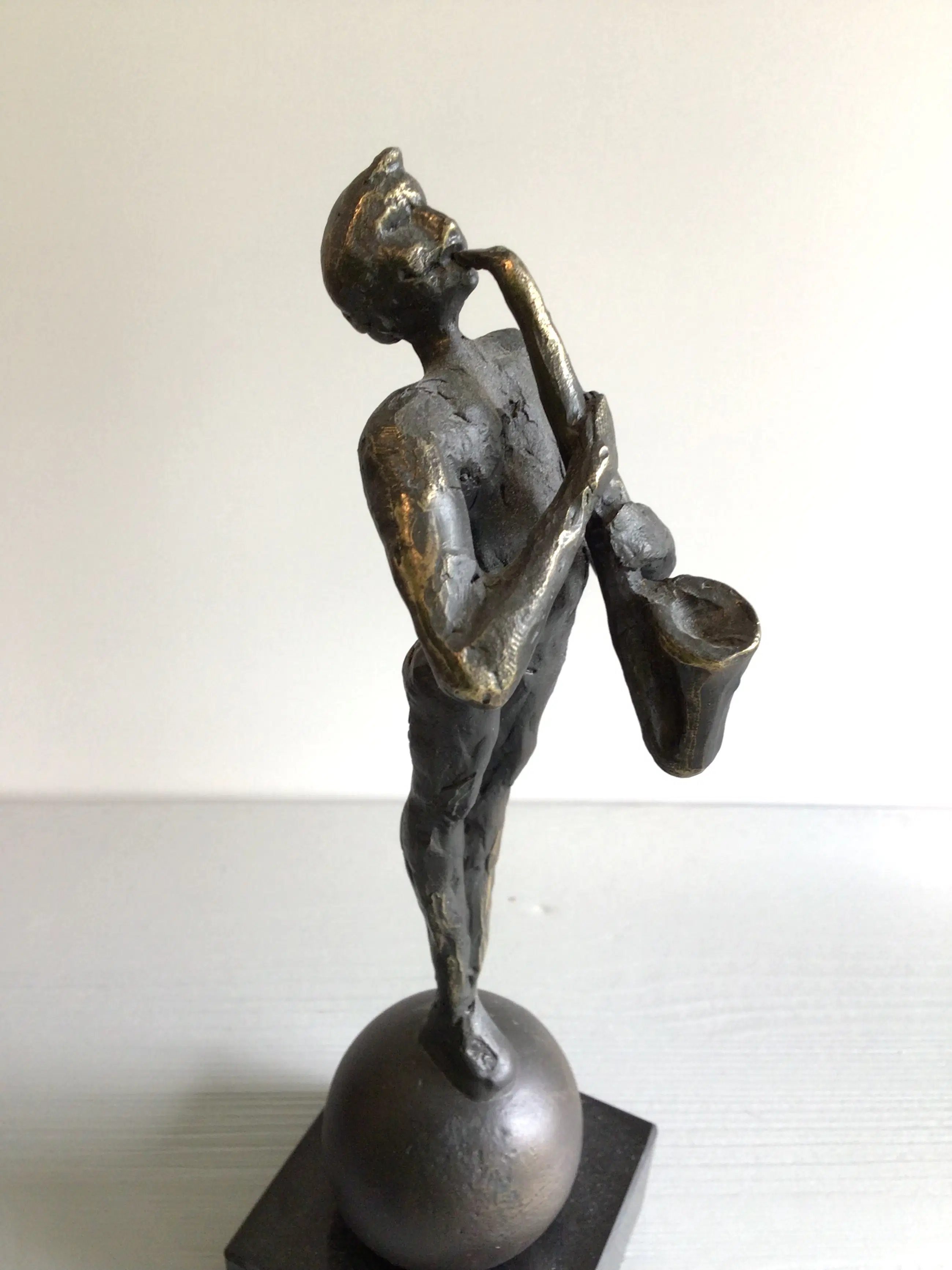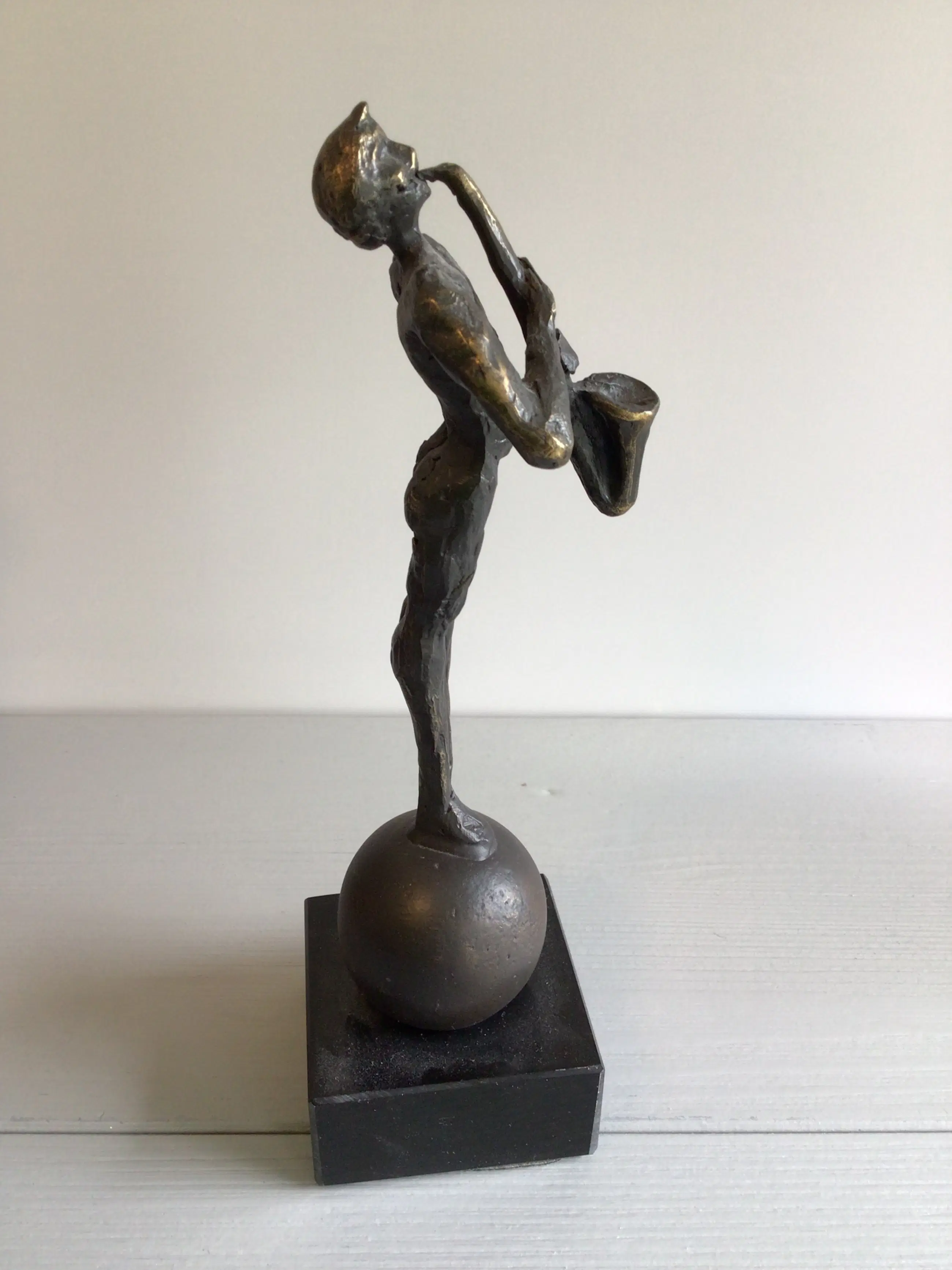 Zeer fraai en gedetailleerd vormgegeven sculptuur van een muzikant met  blaasinstrument.