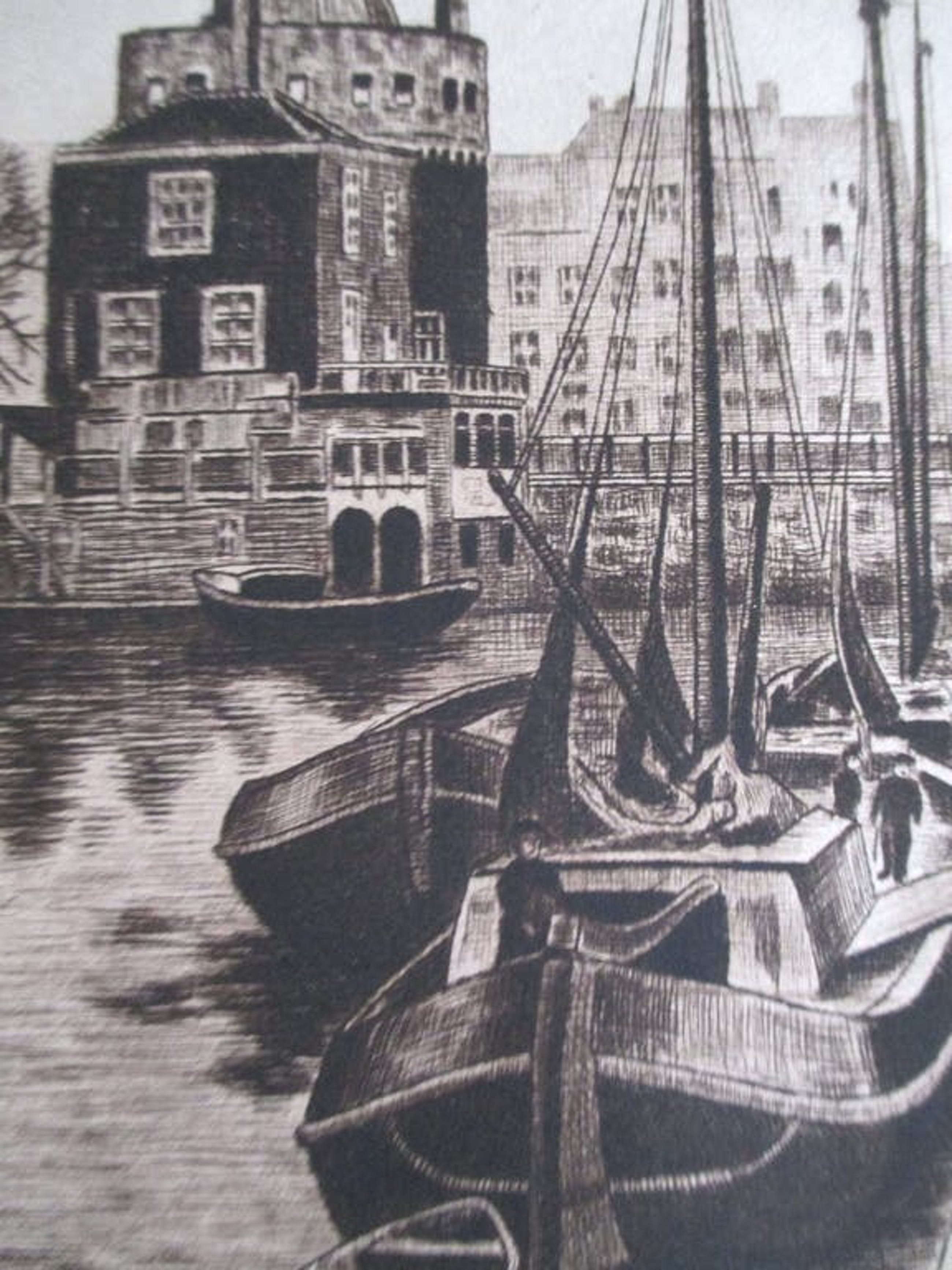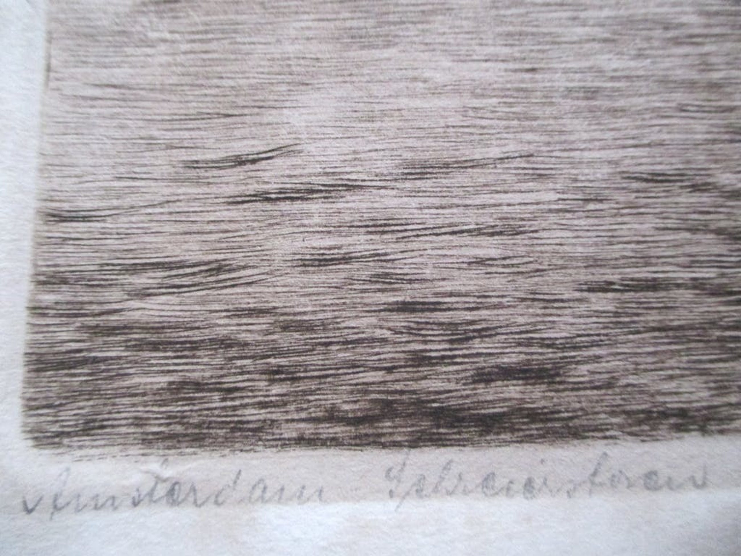 Ets van de Schreierstoren te Amsterdam, in potlood gesigneerd en getiteld. Afm. blad 21,4x26,7, beeld 16,3x21,4 cm. Voor de staat zie de foto's, twee scheurtjes in de marge, l.b in de lucht een kreukje, verder in de lucht foxing-achtige vlekjes.