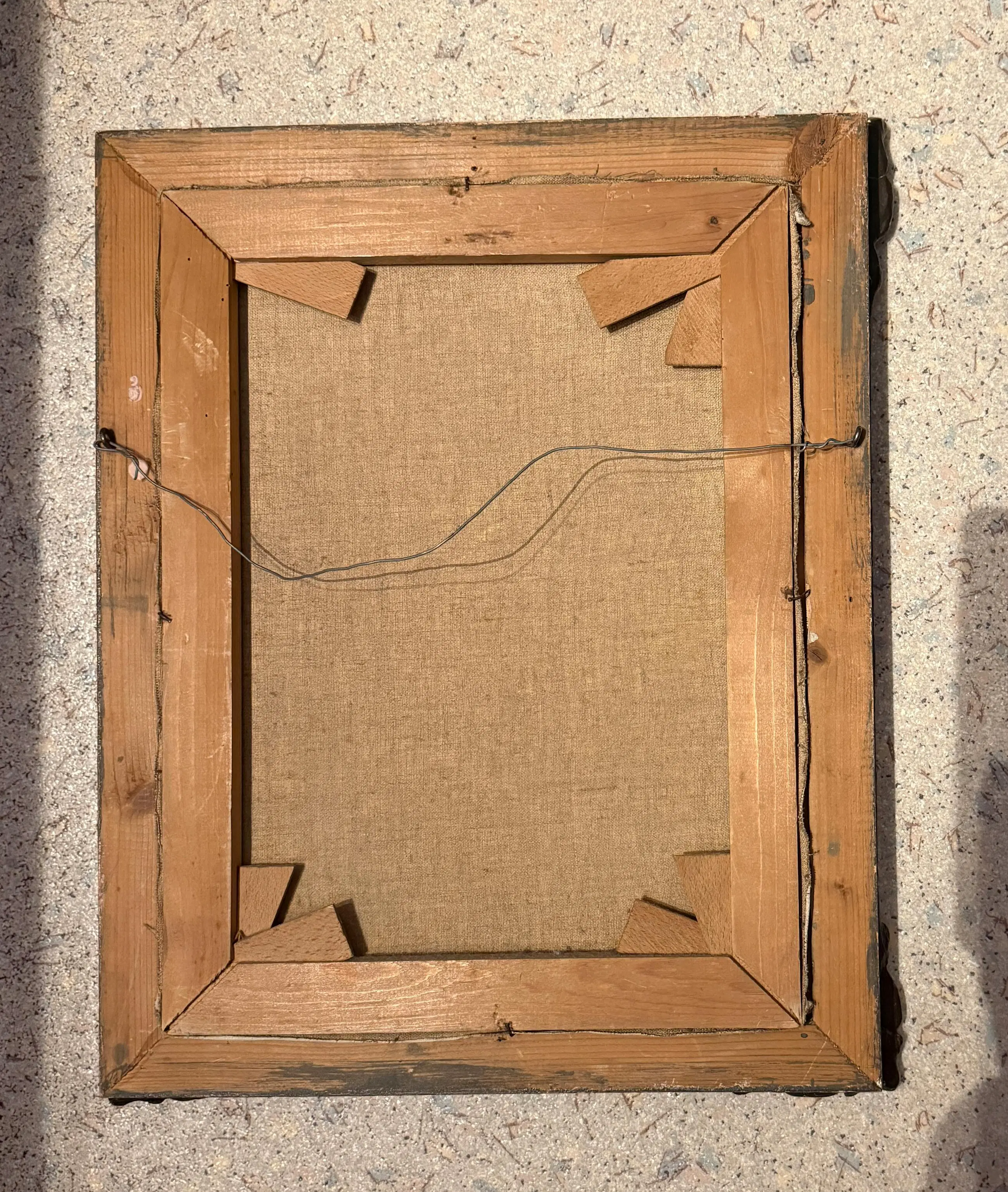Doek is intact, maar er is op één plaats een kleine indeuking (zie laatste foto). De lijst is in prima staat, enkele kleine schilfertjes van de verf af aan de zijkant (waarschijnlijk ooit gestoten bij vervoer)