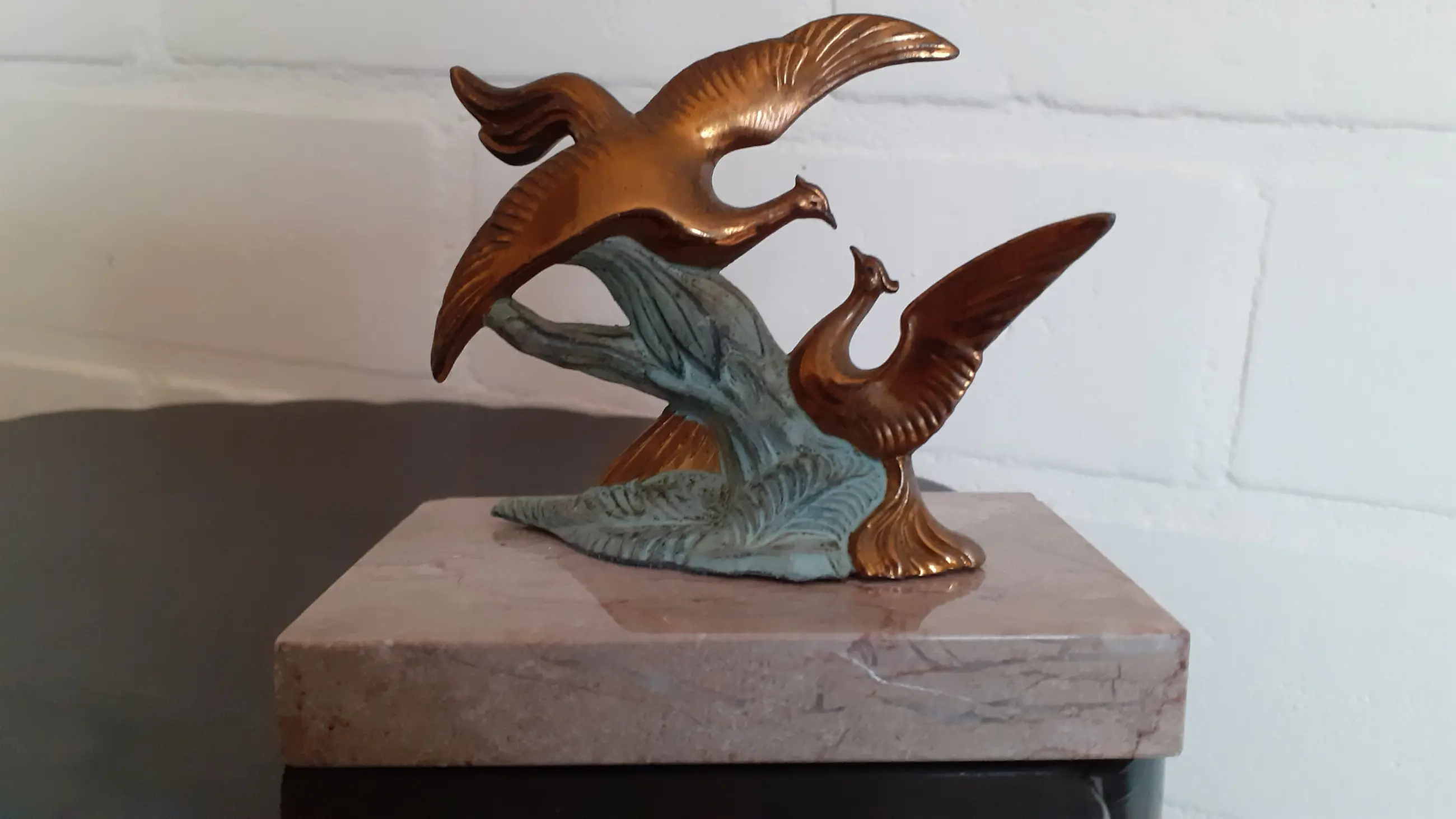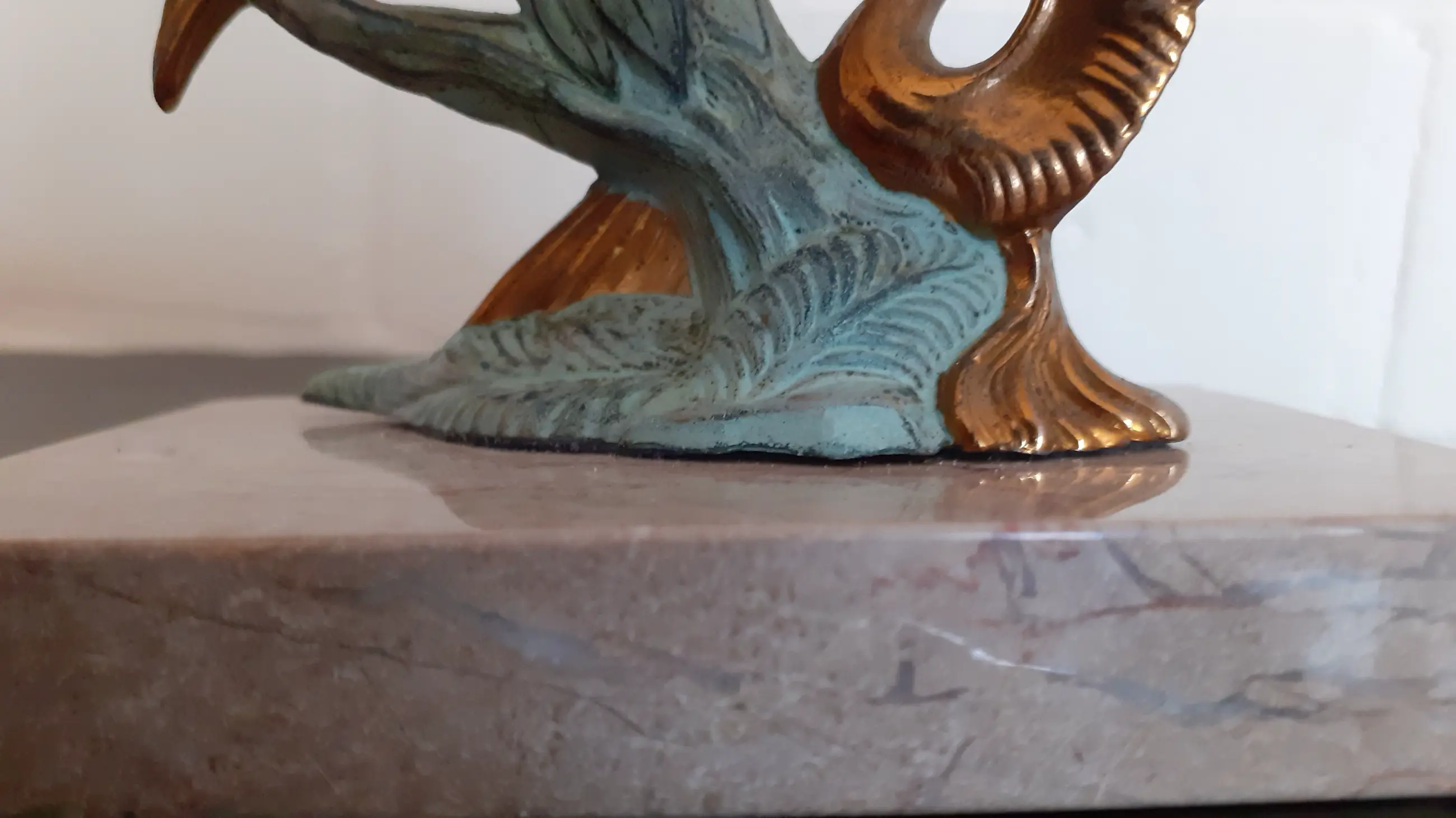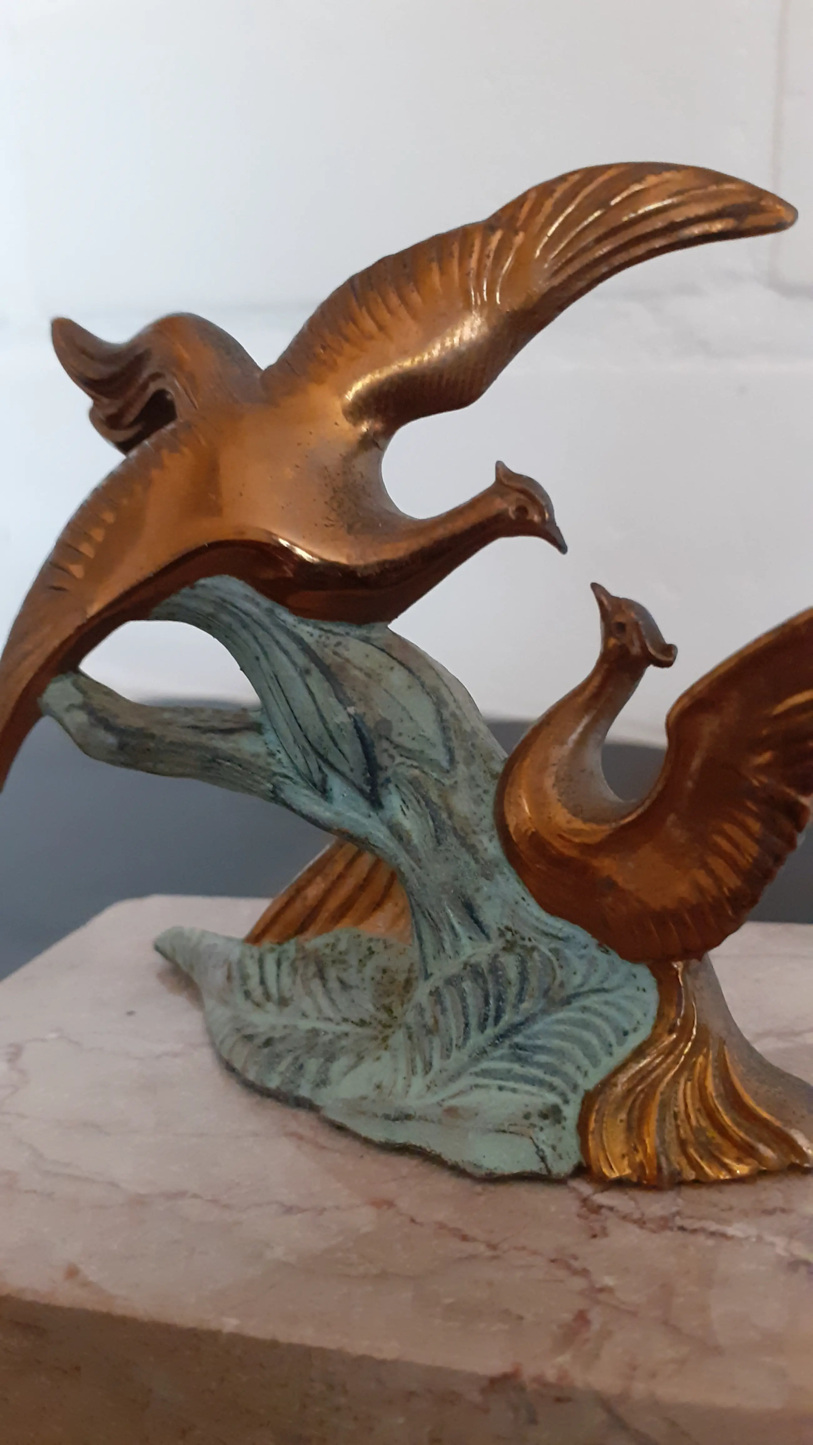 Naar voorbeeld Irinee Rochard Twee vechtende Pauwen op boomstronk gemaakt van brons, fraai gedetailleerd uitgewerkt door onbekende kunstenaar Frankrijk. Op marmer voetsuk. Hele verfijnde voorstelling, in bijvoorbeeld verlichte vitrine of op schouw. Kleuren goud en groen.