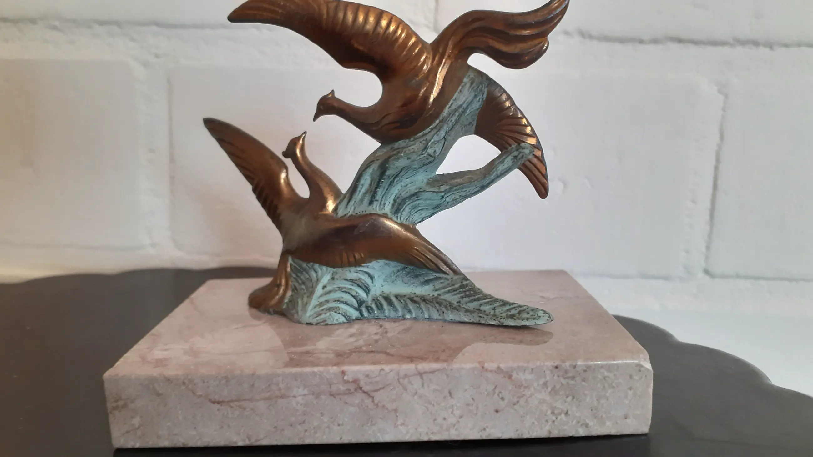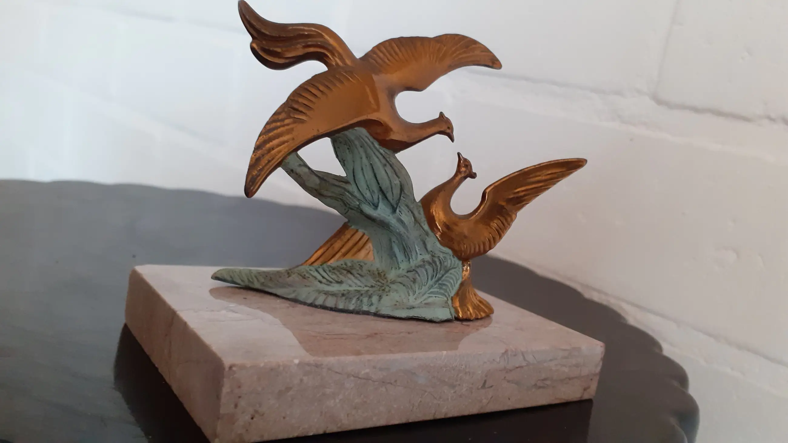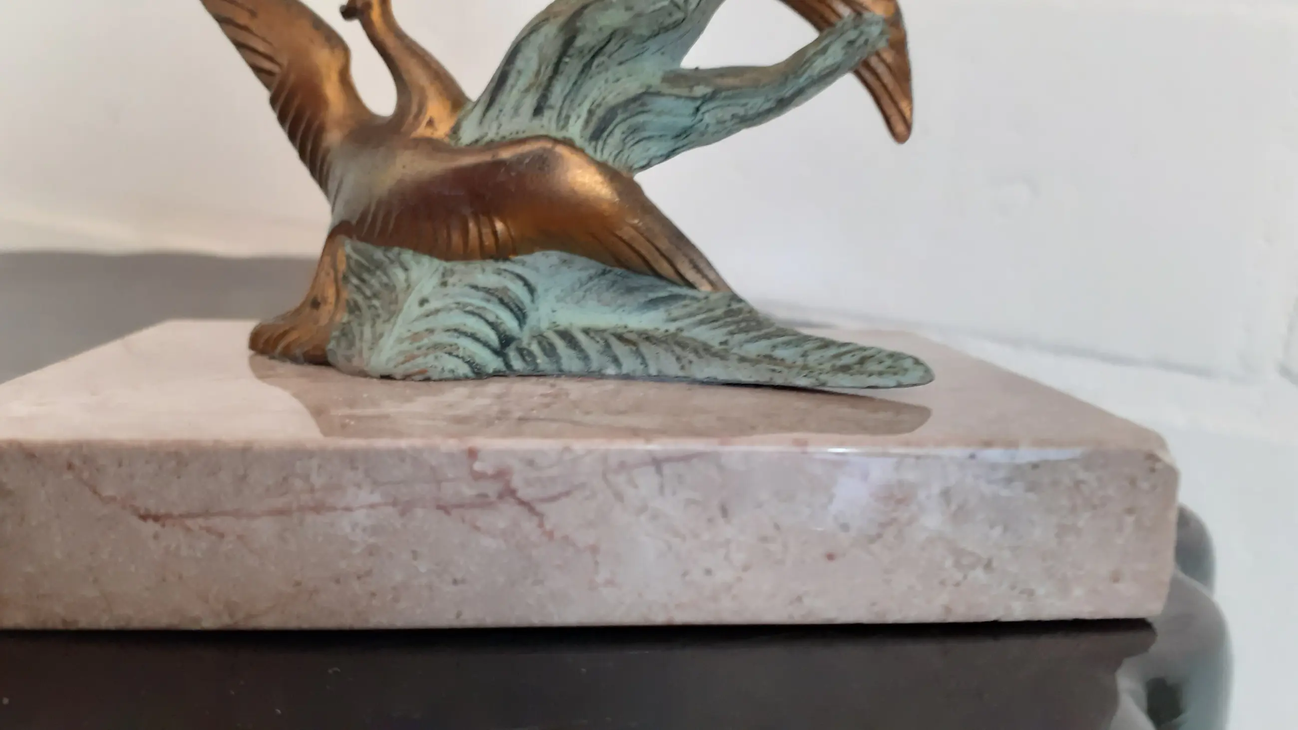 Naar voorbeeld Irinee Rochard Twee vechtende Pauwen op boomstronk gemaakt van brons, fraai gedetailleerd uitgewerkt door onbekende kunstenaar Frankrijk. Op marmer voetsuk. Hele verfijnde voorstelling, in bijvoorbeeld verlichte vitrine of op schouw. Kleuren goud en groen.