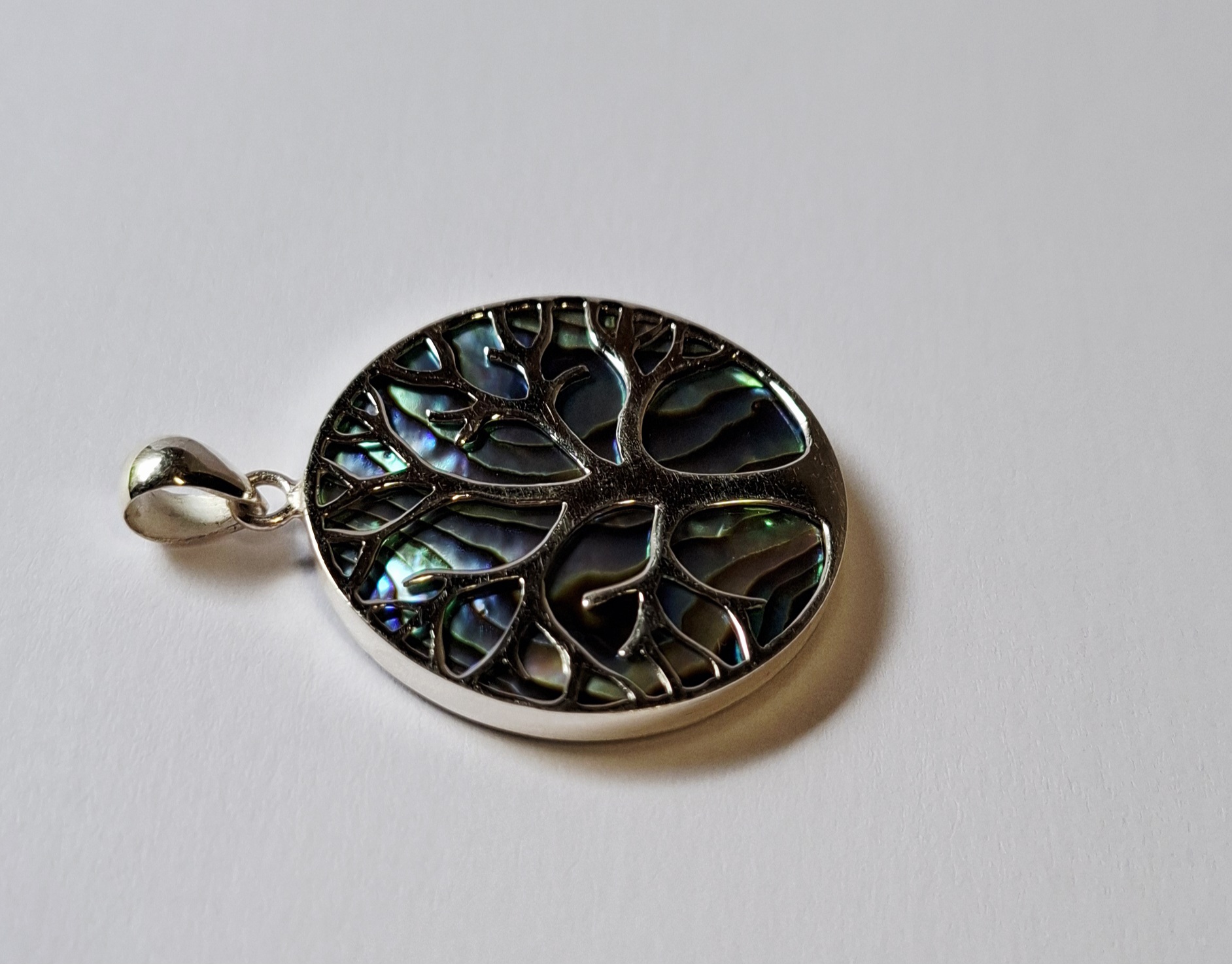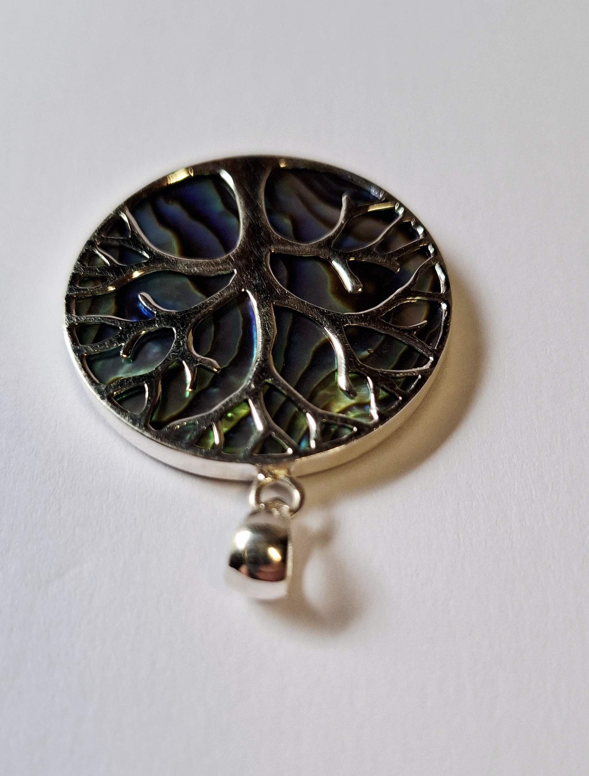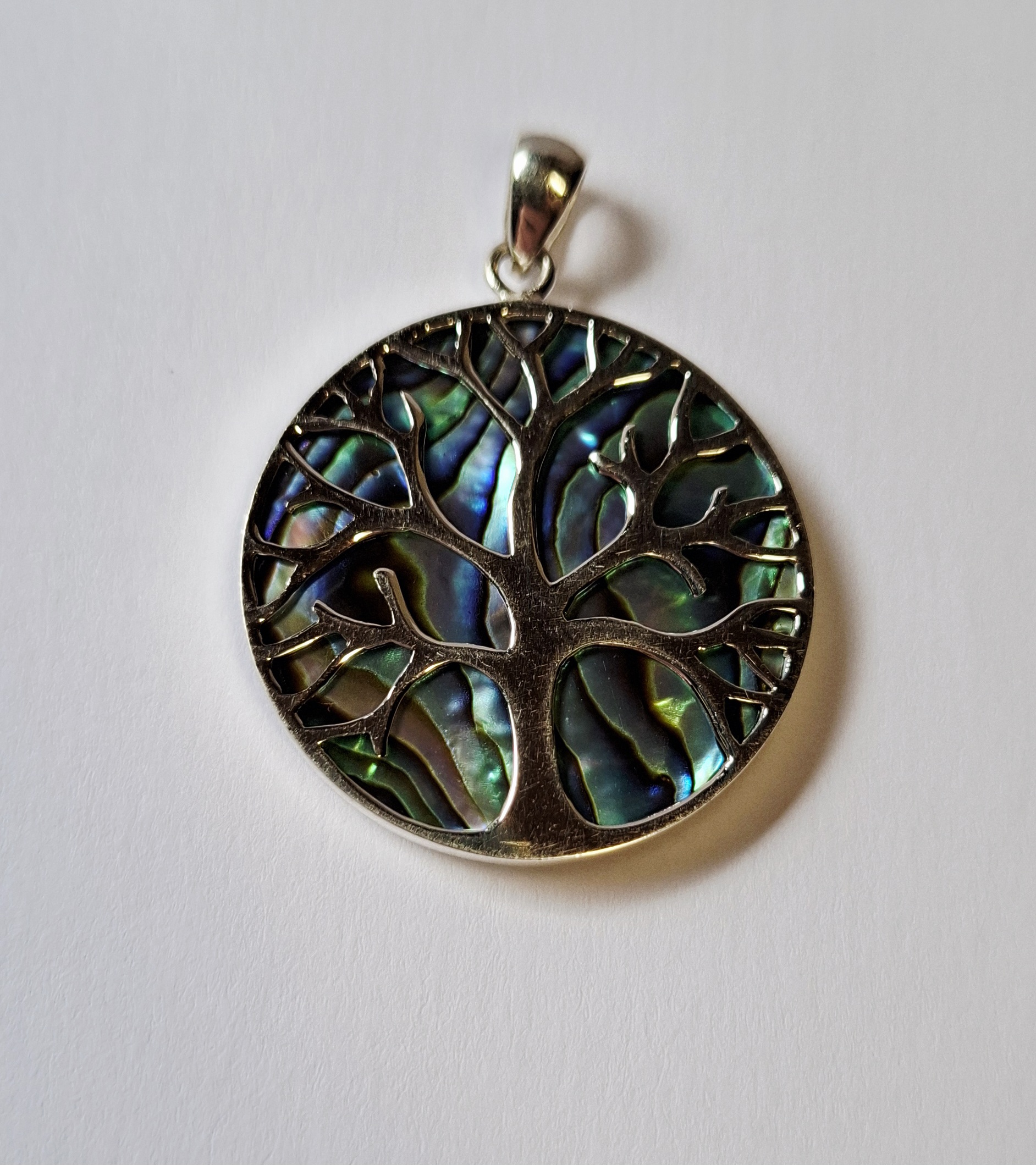 Nieuwe mooie hanger met een levensboom heeft een achtergrond van echte pauaschelp, met zo enorm veel kleuren in zich. Dat het echt handwerk is, aan de achterzijde van de schelp. Het is heel mooi gemaakt en een blijvend wonder van de natuur. Paua schelp wordt veel in Nieuw-Zeeland gevonden. Circa 2010 . Eigelijk kan je deze hanger aan twee kanten dragen voorkant of achterkant . Ze zijn beide mooi.