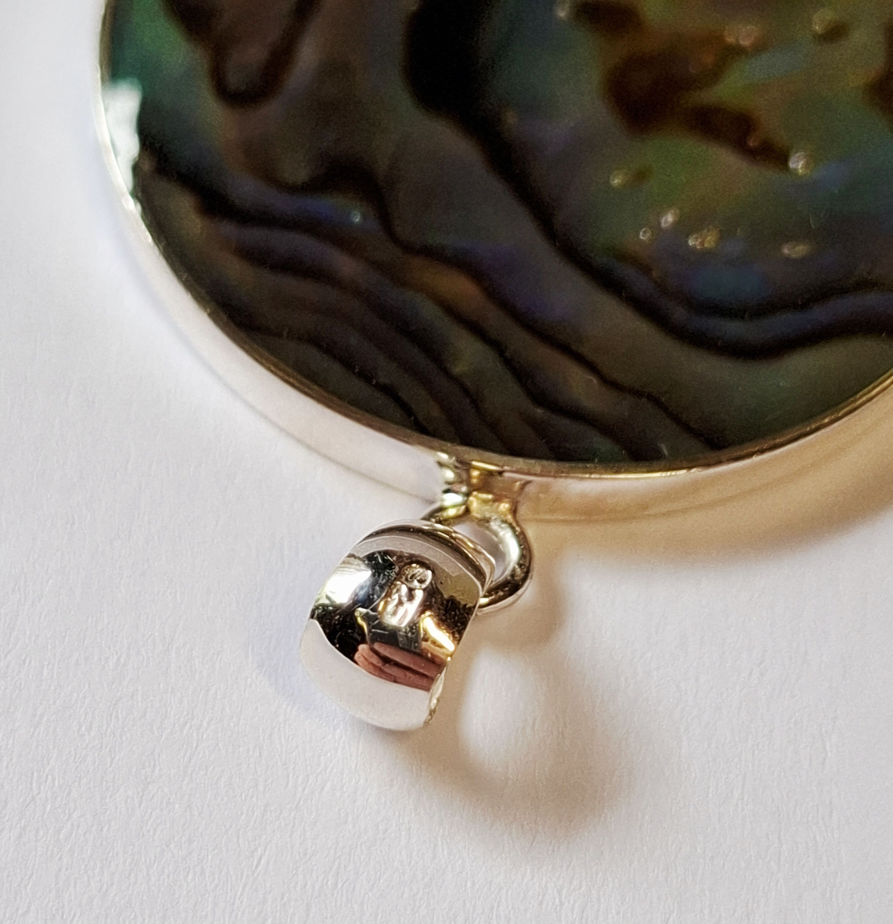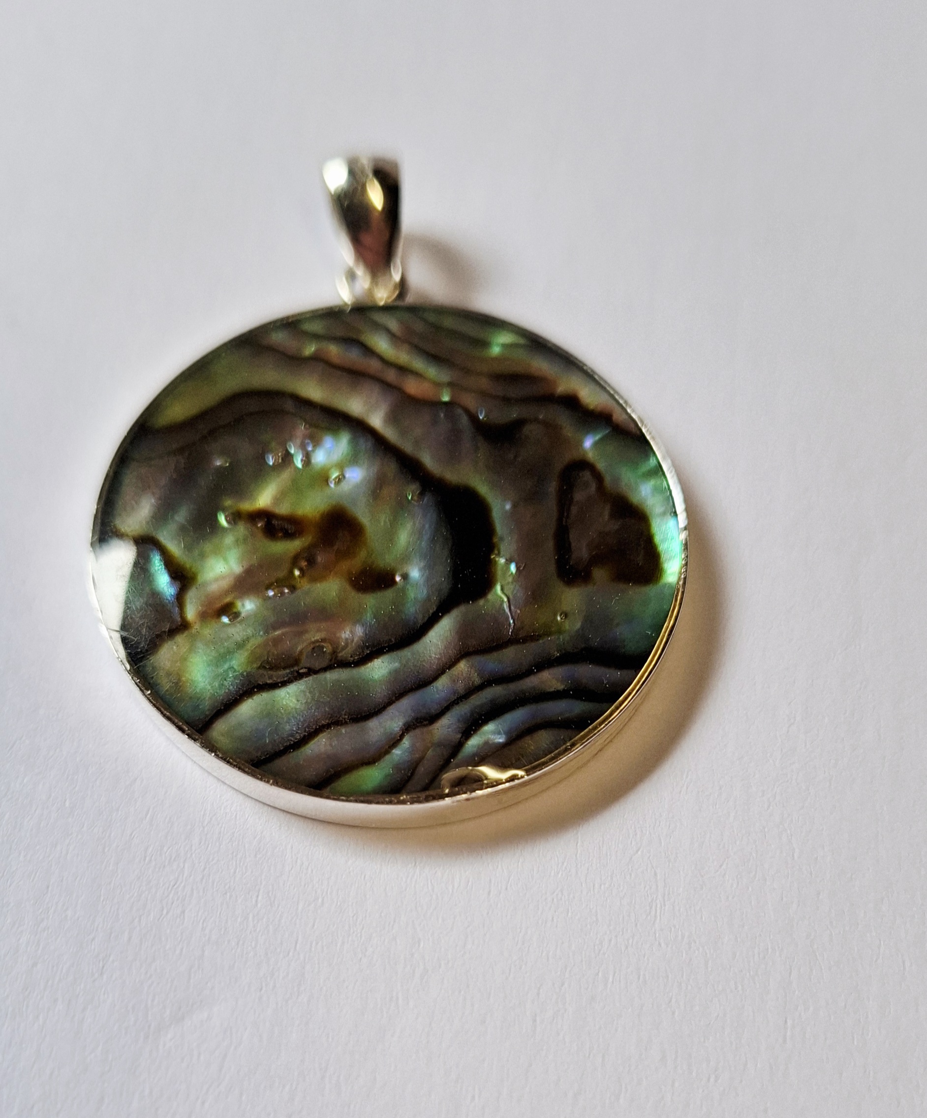 Breedte: 38 mm Hoogte: 41 mm Gewicht: 6,7 gram (middelzwaar) Hangoog: rond Materiaal: zilver + Paua schelp