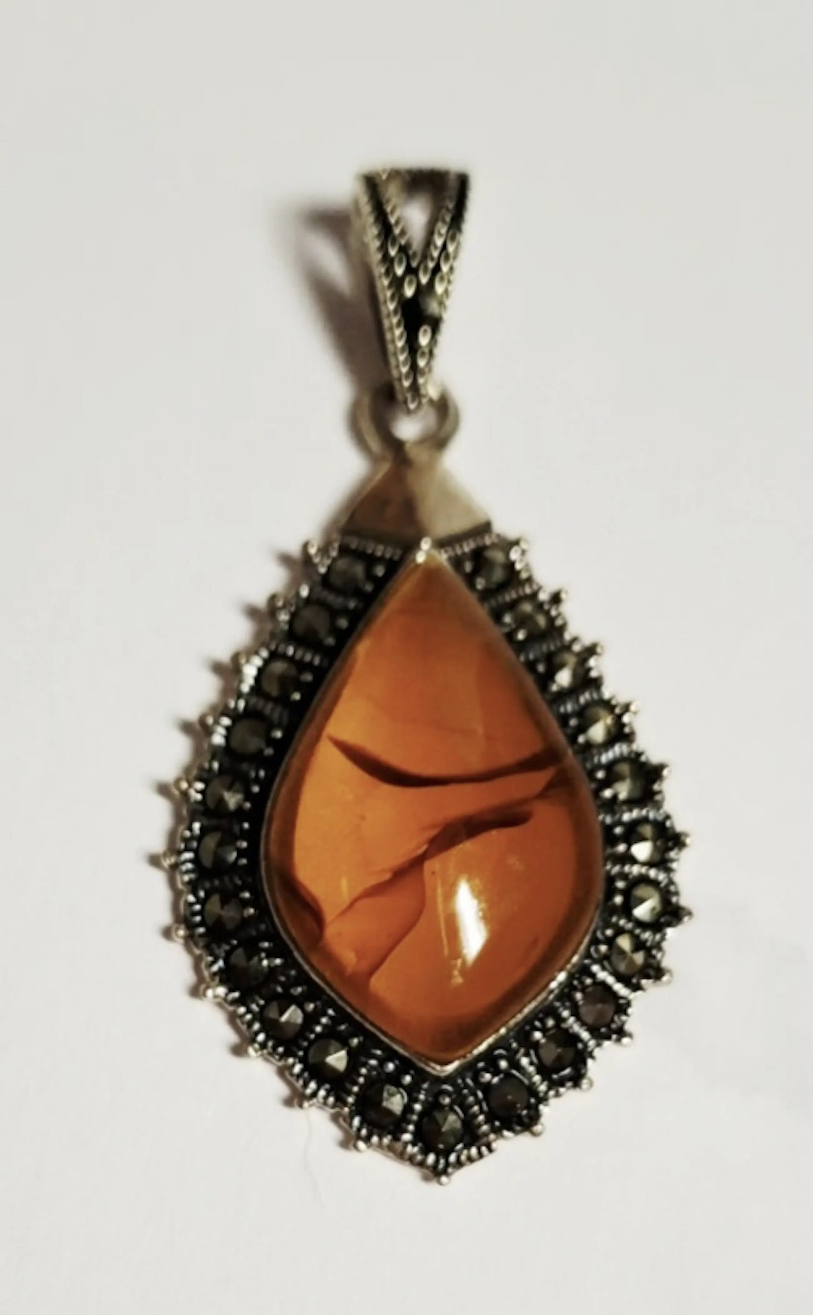 De setting van deze druppelvormige hanger is zilver en de rand heeft een mooi marcasiet setting. Het midden heeft een koepelvormig stuk gouden Amber met een open achterkant.