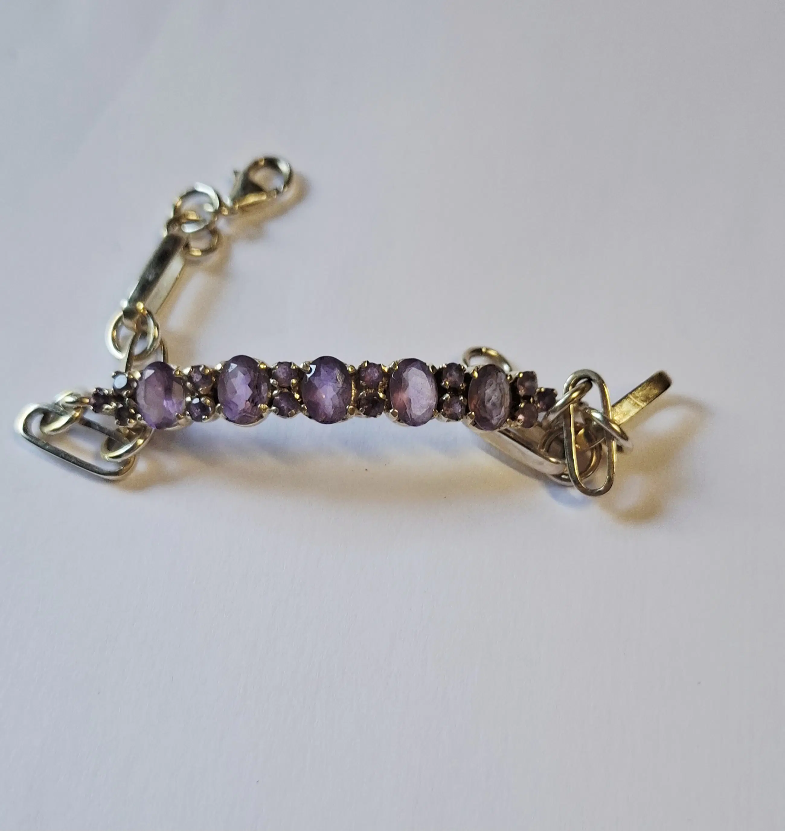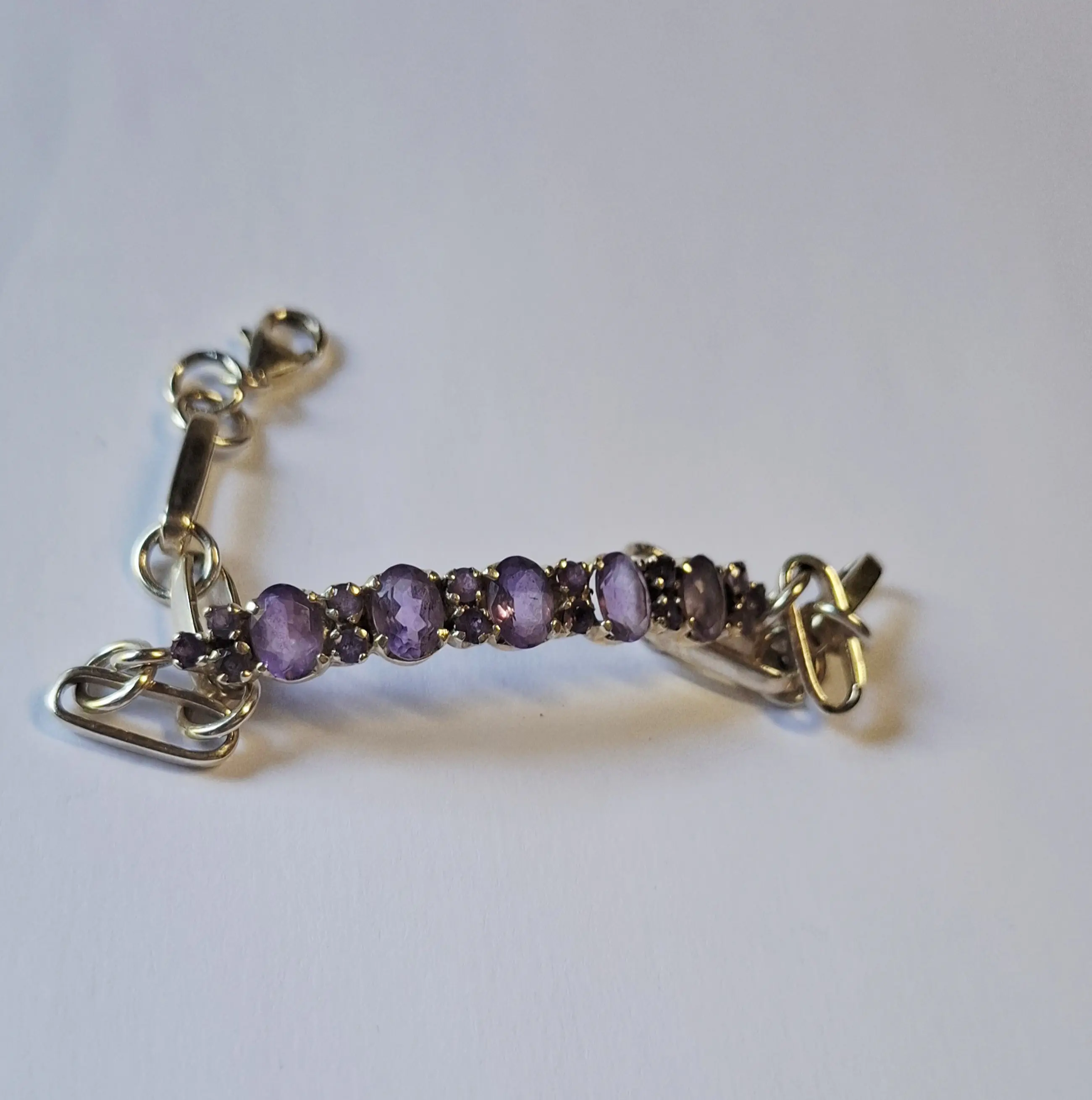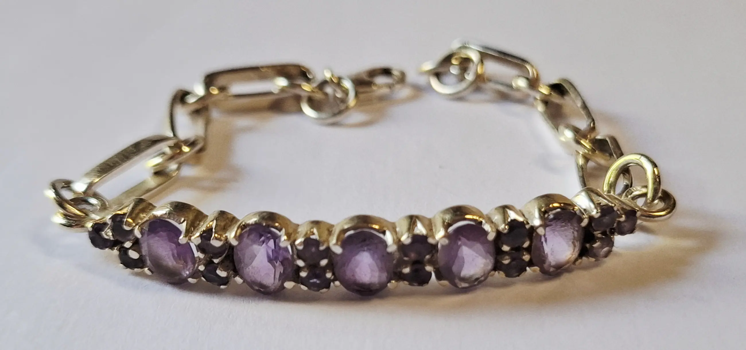 Nieuw zilveren armband gezet met 5 grote facetgeslepen Amethist en 6 kleine facetgeslepen Amethist Nieuw ingekocht in 1975 Lengte: verstelbaar 18 cm ,17cm , 16 cm .15 cm Komt uit een prive Collectie nog nooit gedragen . Heeft altijd in een vitrine kastje gelegen eigenlijk is het nog nieuw voor een vintage uit 1975 Word goed verpakt en verzekerd verzonden met track en trace