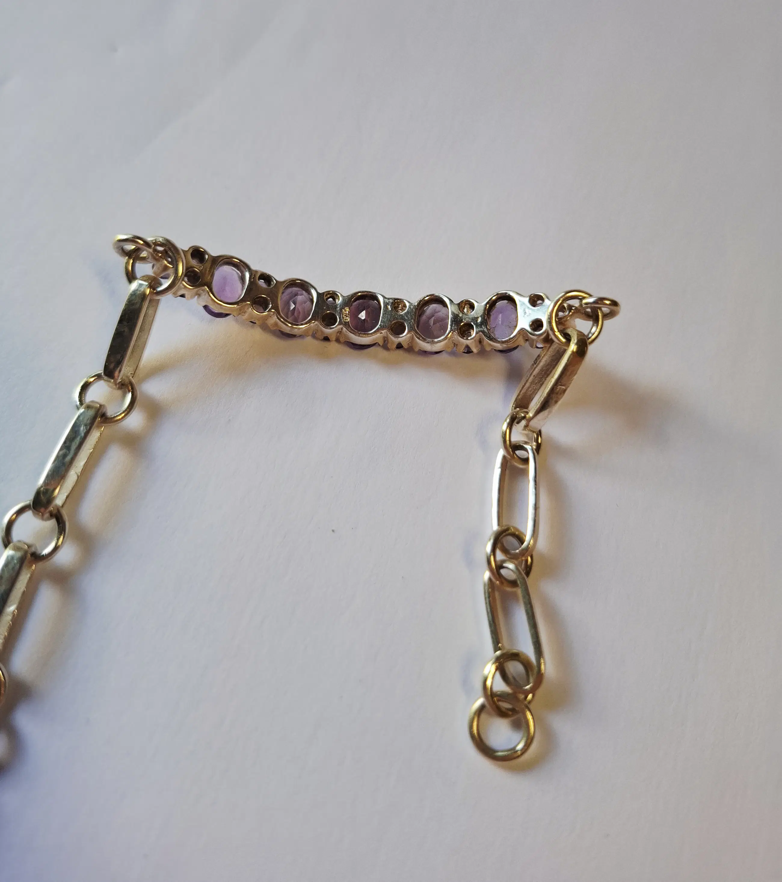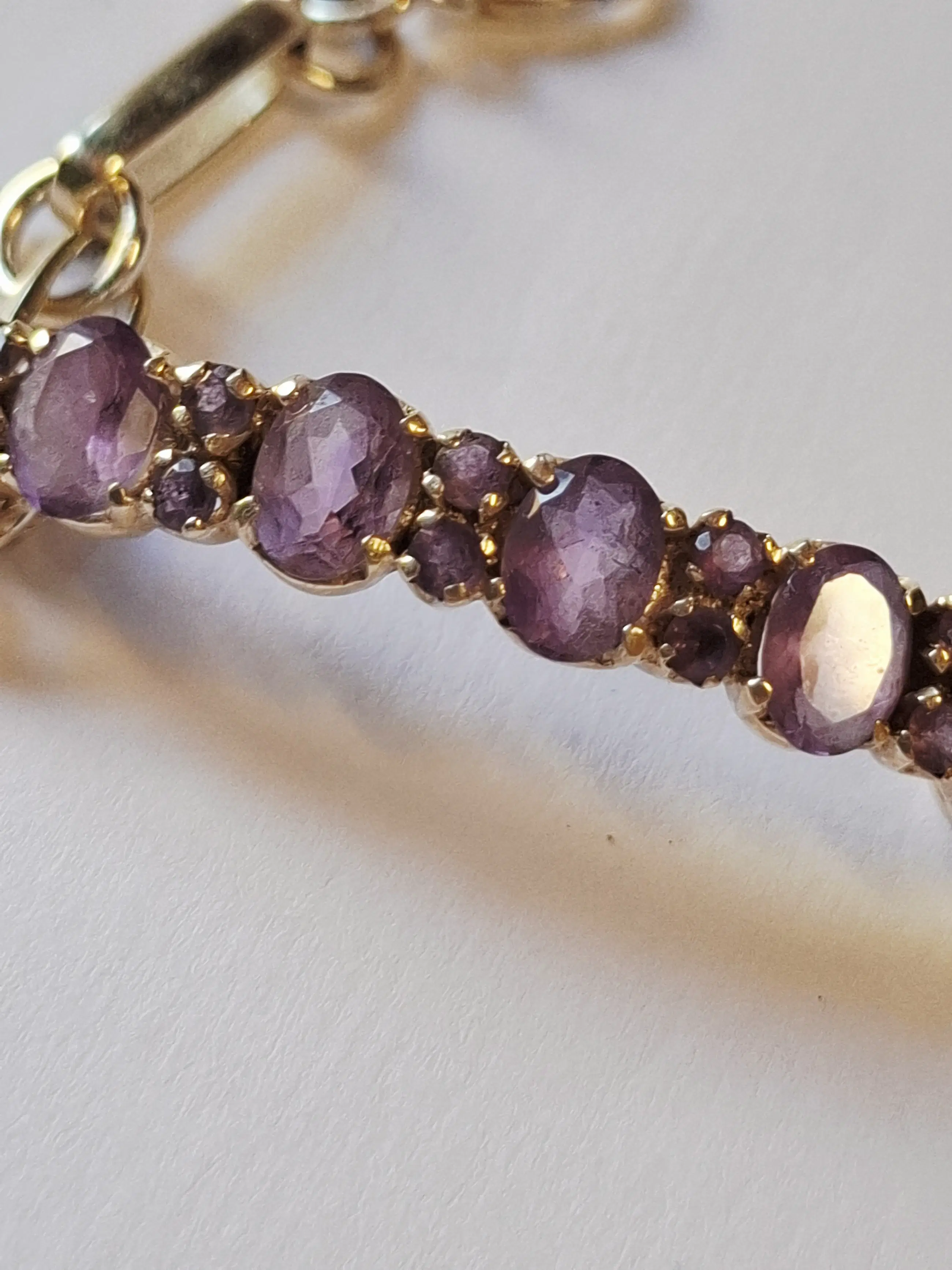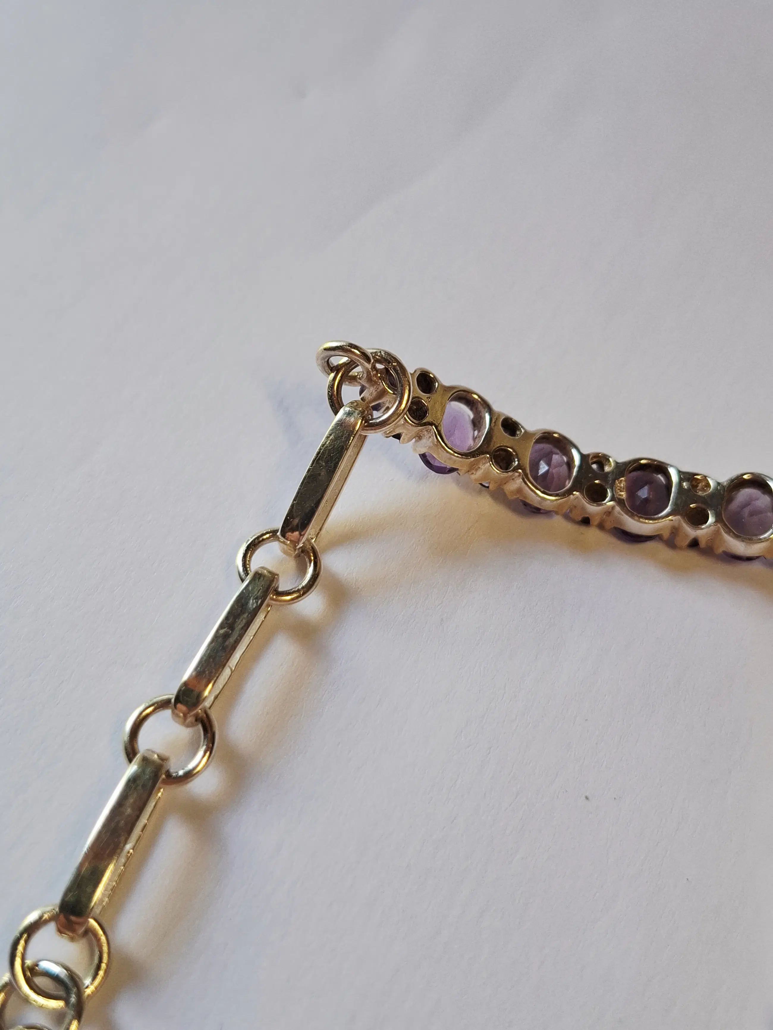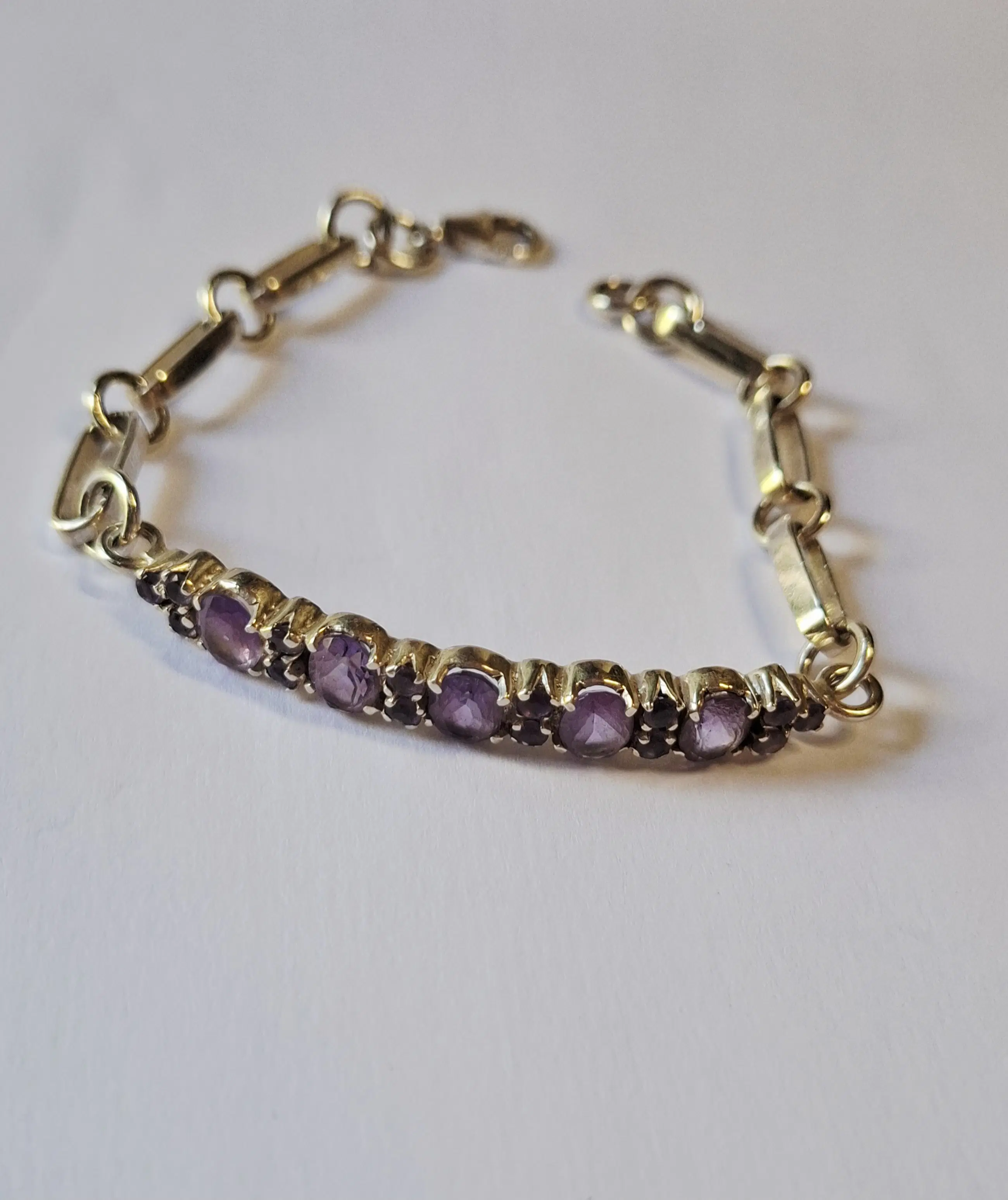 Nieuw zilveren armband gezet met 5 grote facetgeslepen Amethist en 6 kleine facetgeslepen Amethist Nieuw ingekocht in 1975 Lengte: verstelbaar 18 cm ,17cm , 16 cm .15 cm Komt uit een prive Collectie nog nooit gedragen . Heeft altijd in een vitrine kastje gelegen eigenlijk is het nog nieuw voor een vintage uit 1975 Word goed verpakt en verzekerd verzonden met track en trace