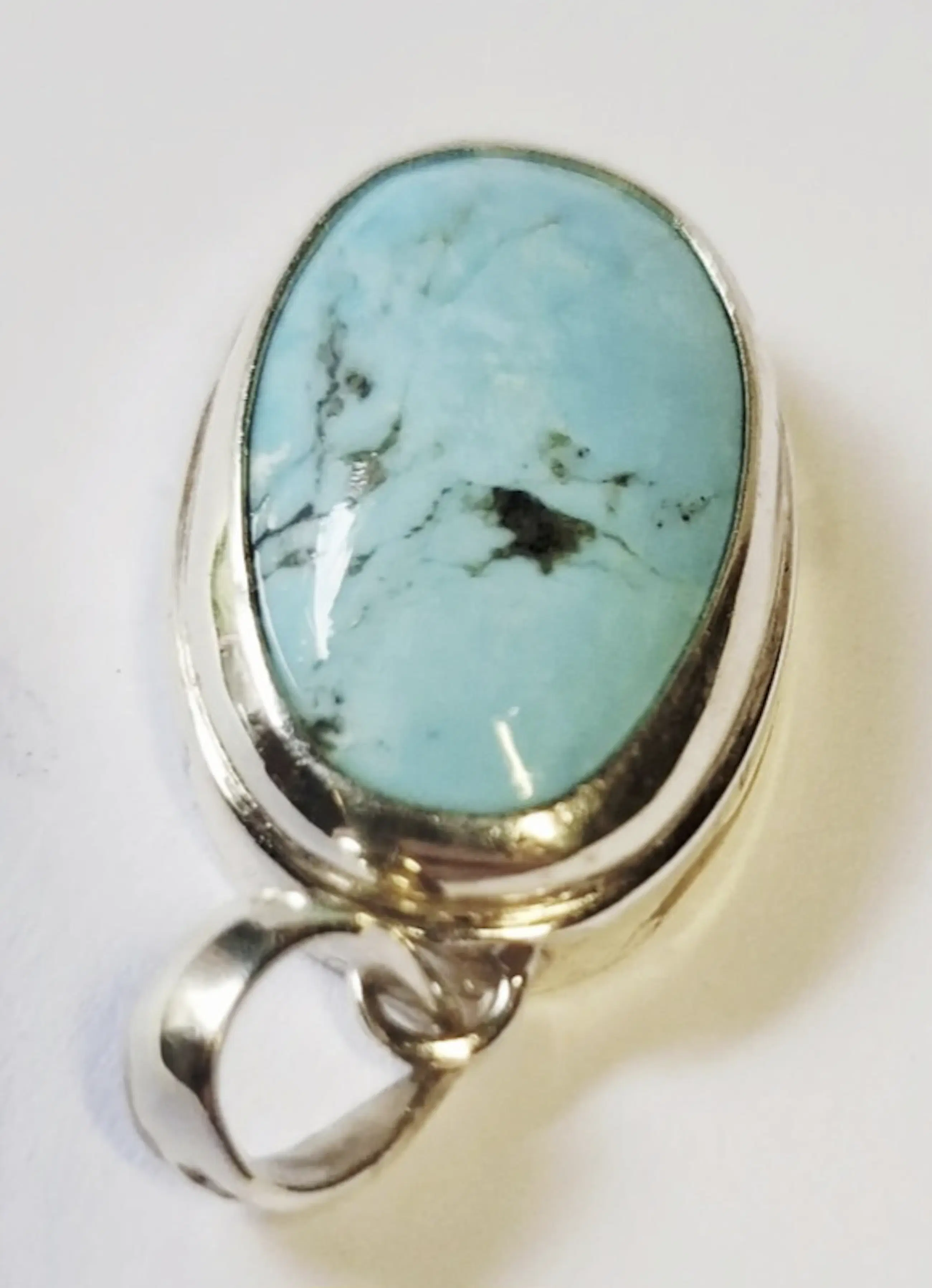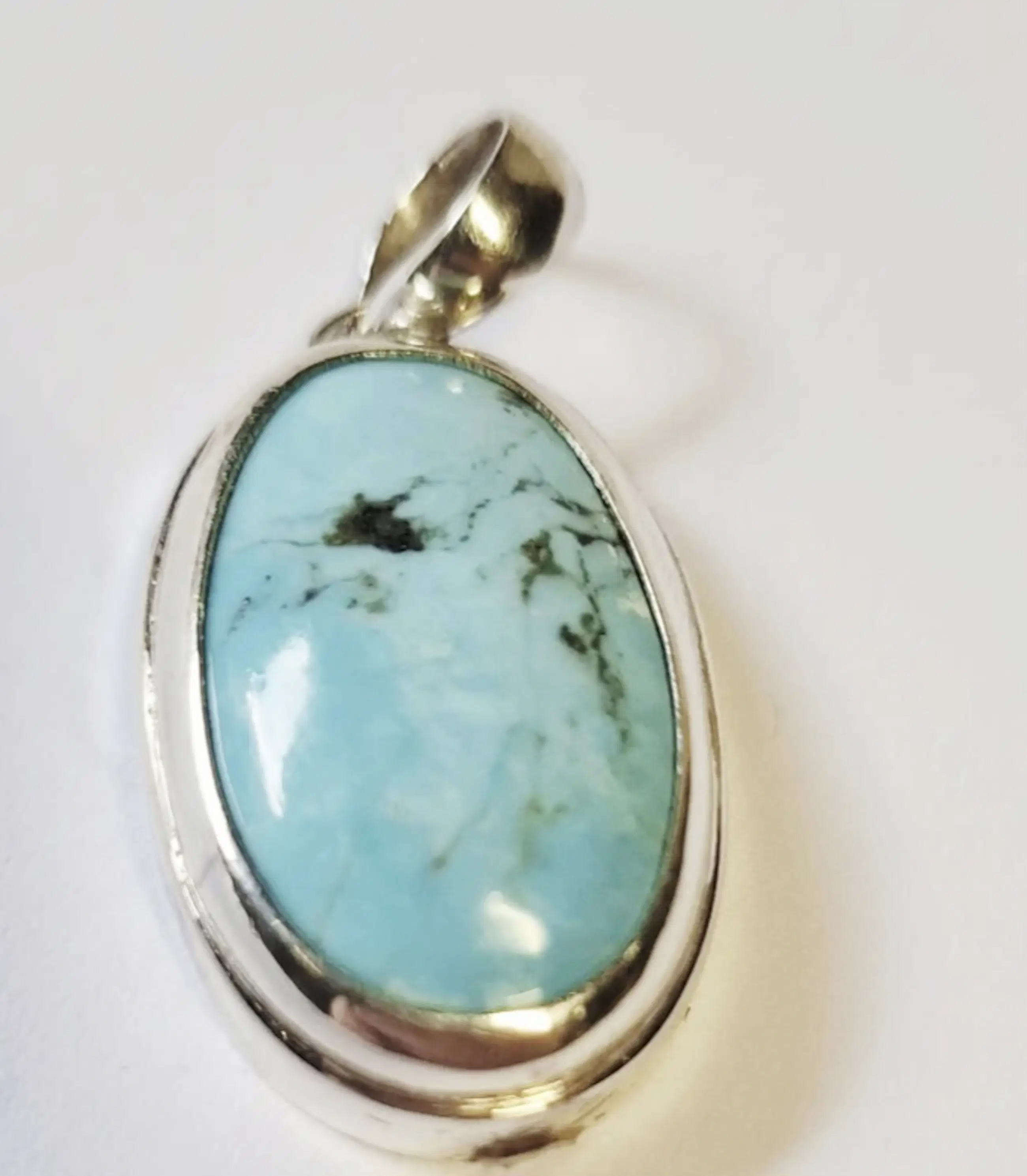 Nieuwe grote ovale hoogglans zilveren hanger, ingelegd met groene turkoois