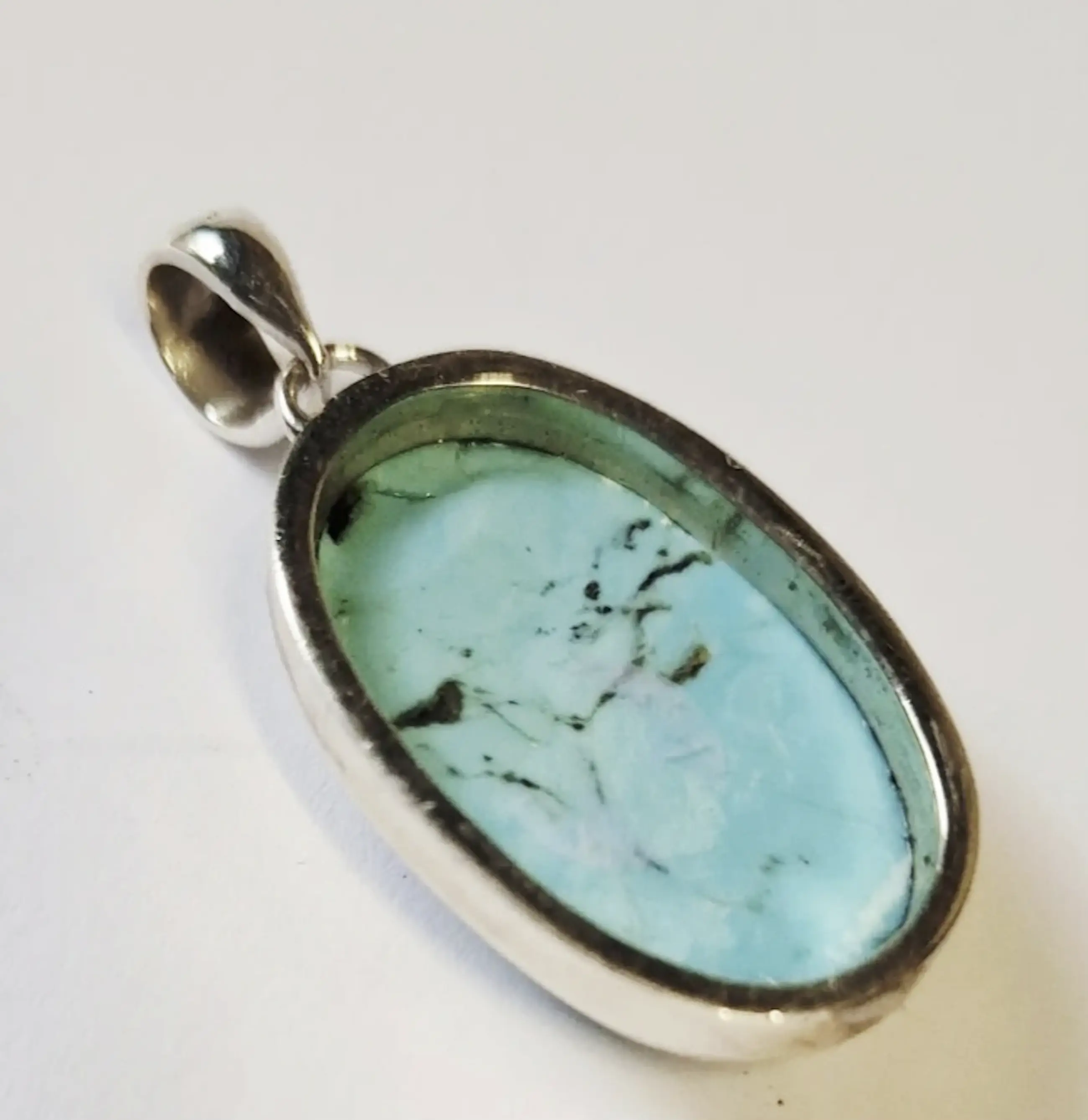 Nieuwe handgemaakte grote ovale hoogglans zilveren hanger, fraai ingelegd met groene turkoois