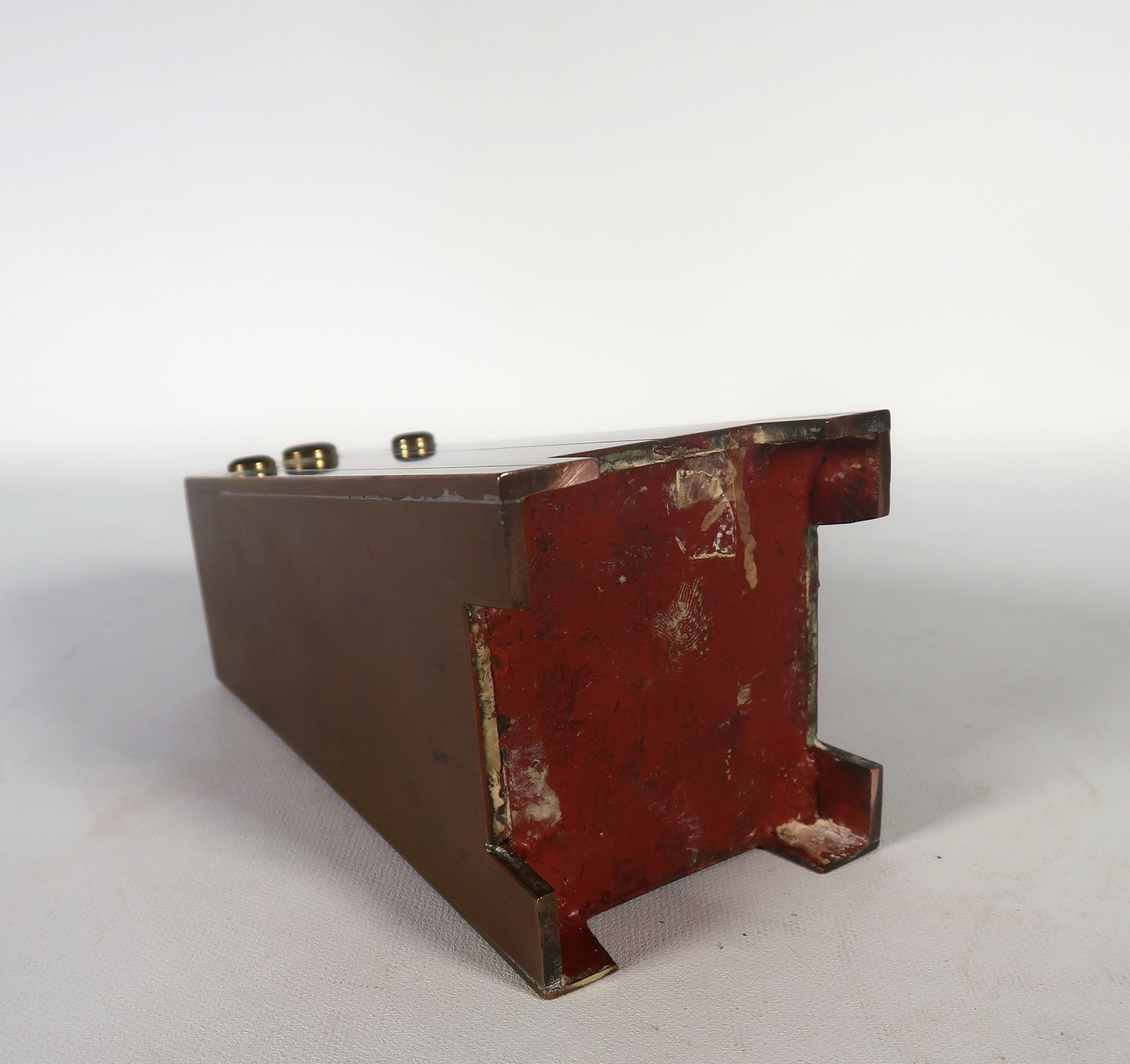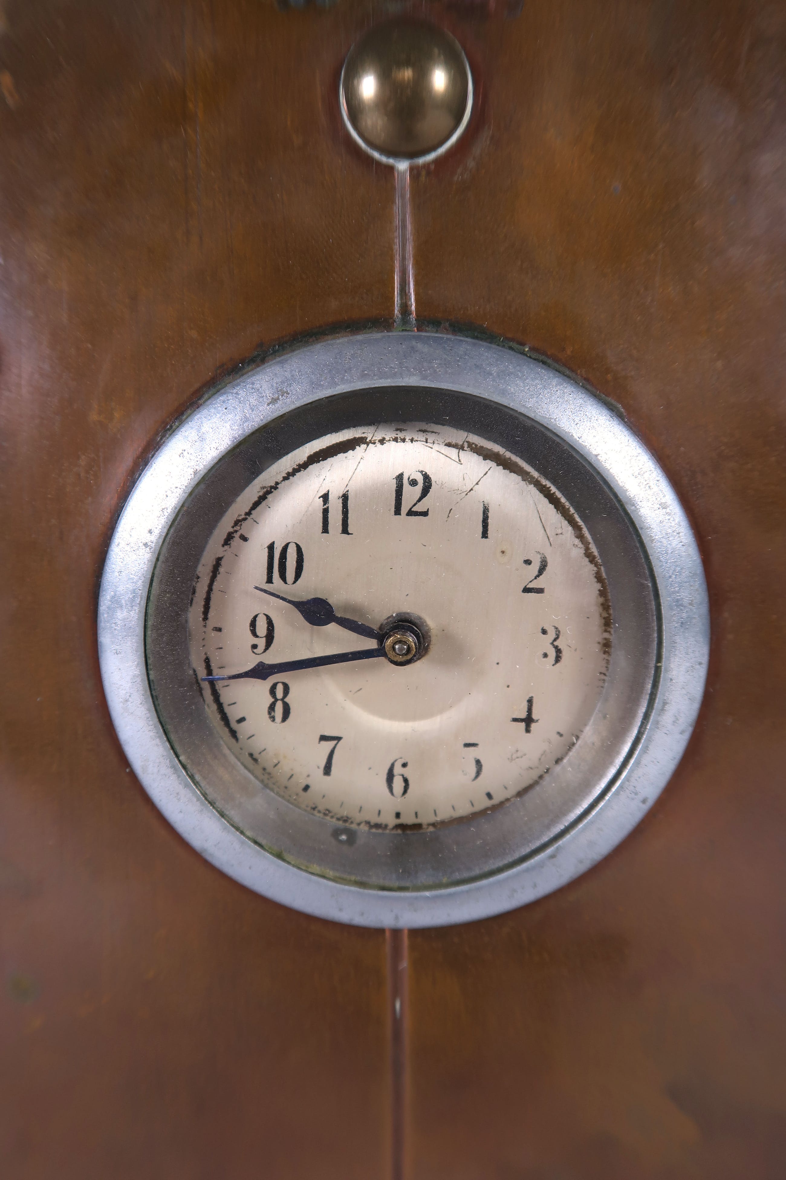 | Het pendulestel verkeert in goede conditie. Op de voorzijde van de pendule zit een corrosie vlek, vermoedelijk veroorzaakt door lijm van plakband of een sticker. De klok is in werkende staat maar zal gereviseerd moeten worden. Hier en daar zitten resten poetsmiddel. | |||