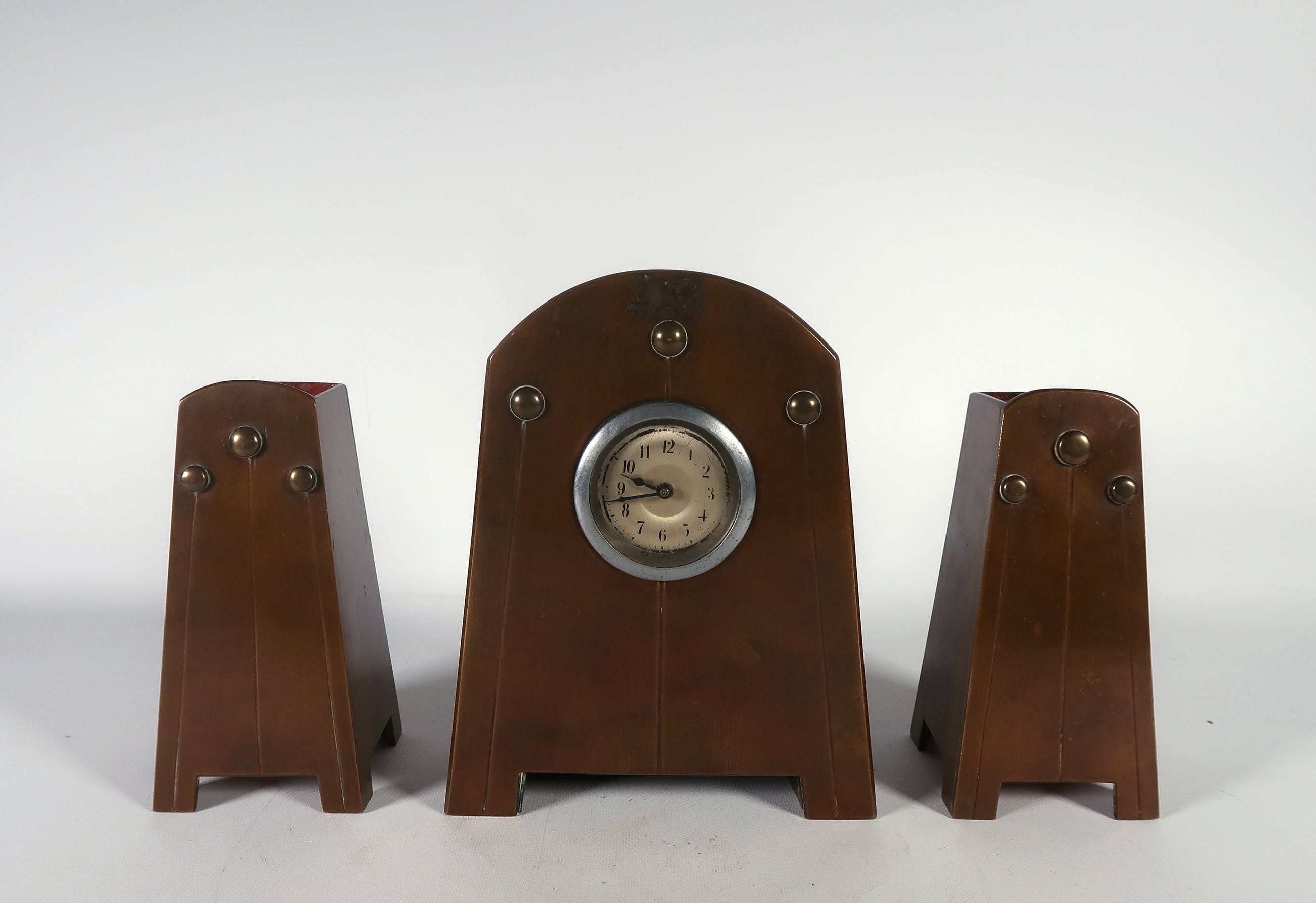 Het pendulestel verkeert in goede conditie. Op de voorzijde van de pendule zit een corrosie vlek, vermoedelijk veroorzaakt door lijm van plakband of een sticker. De klok is in werkende staat maar zal gereviseerd moeten worden. Hier en daar zitten resten poetsmiddel. Het stel bestaat uit drie afzonderlijke delen, de afmetingen zijn: