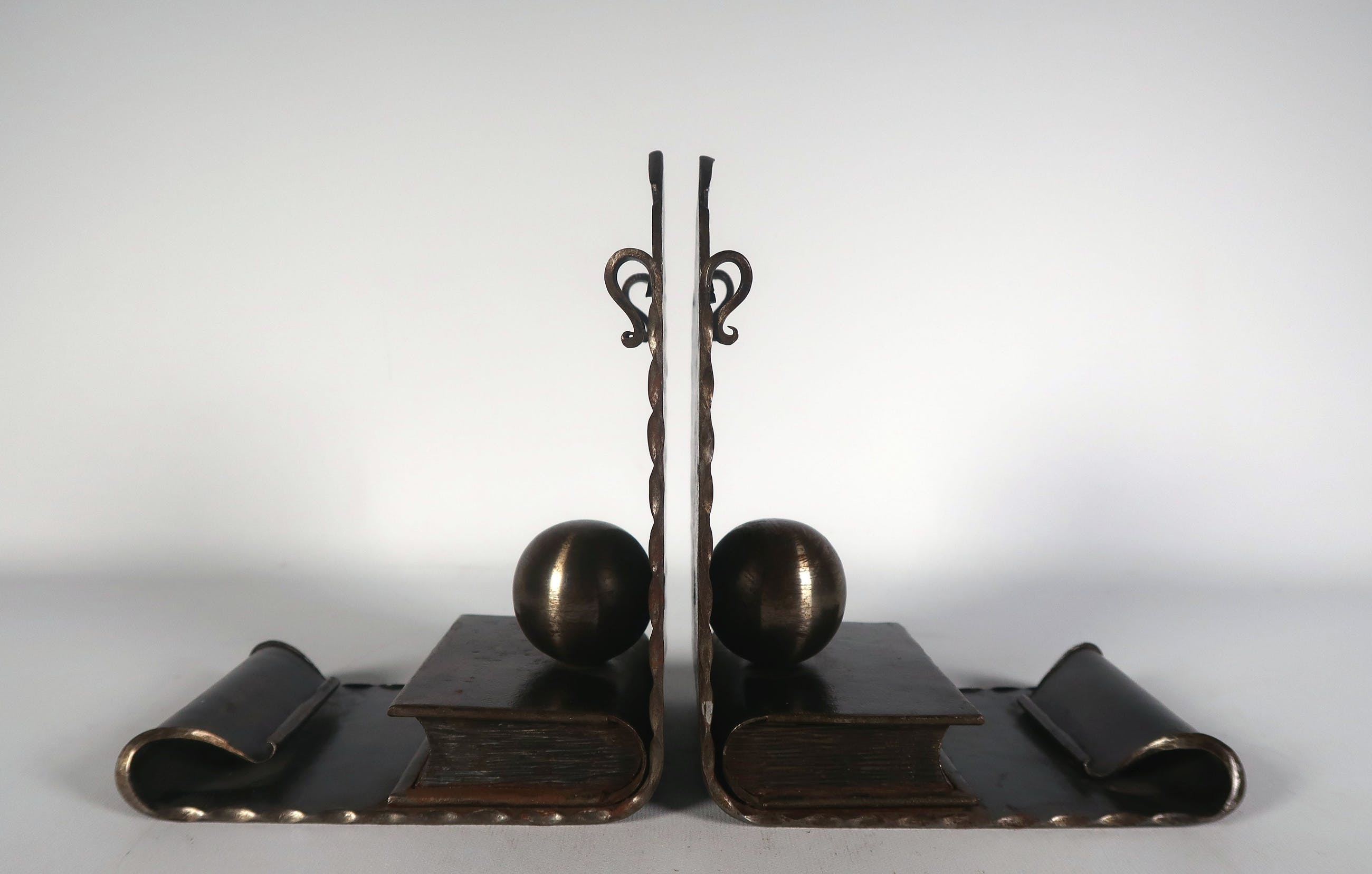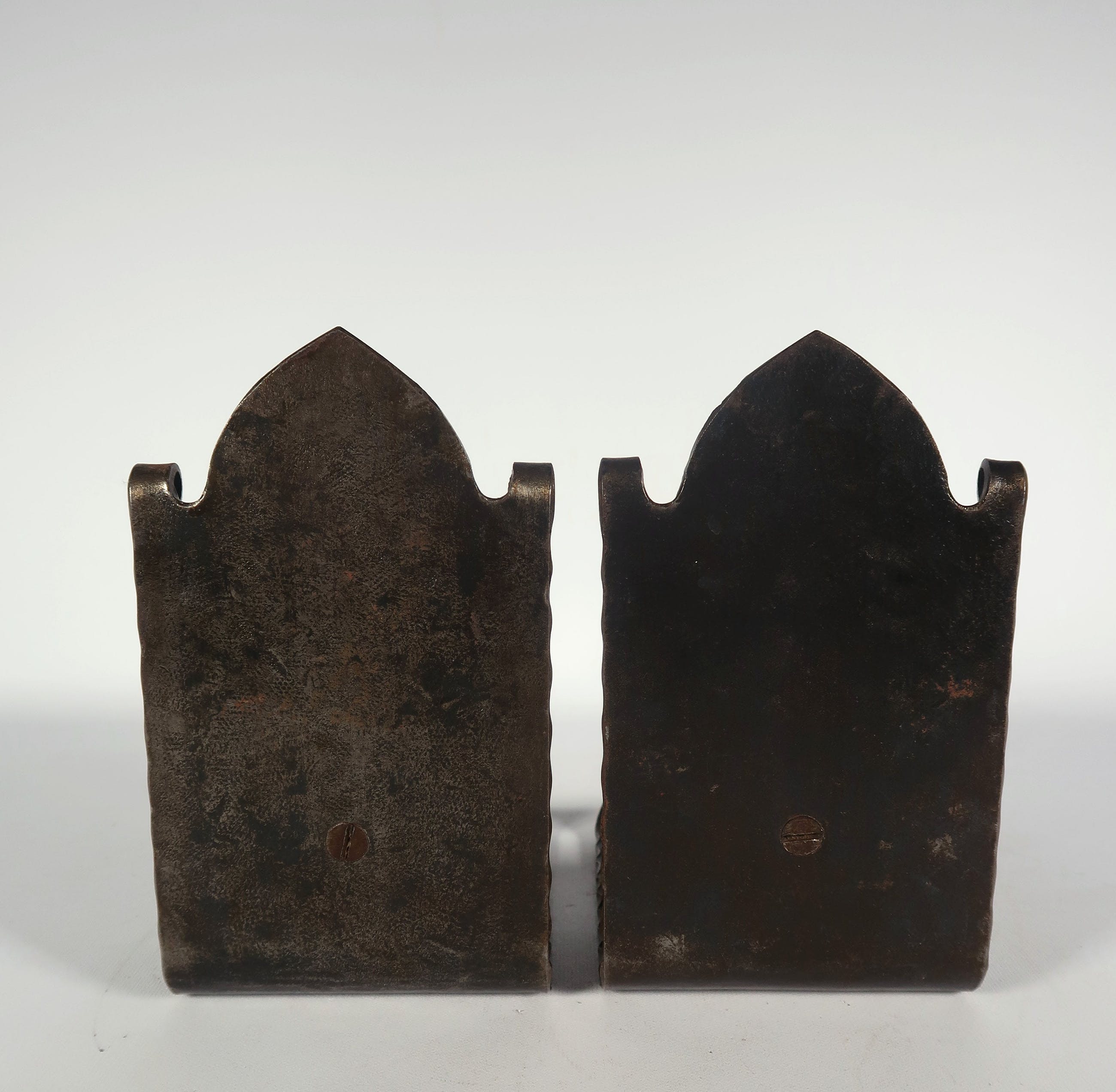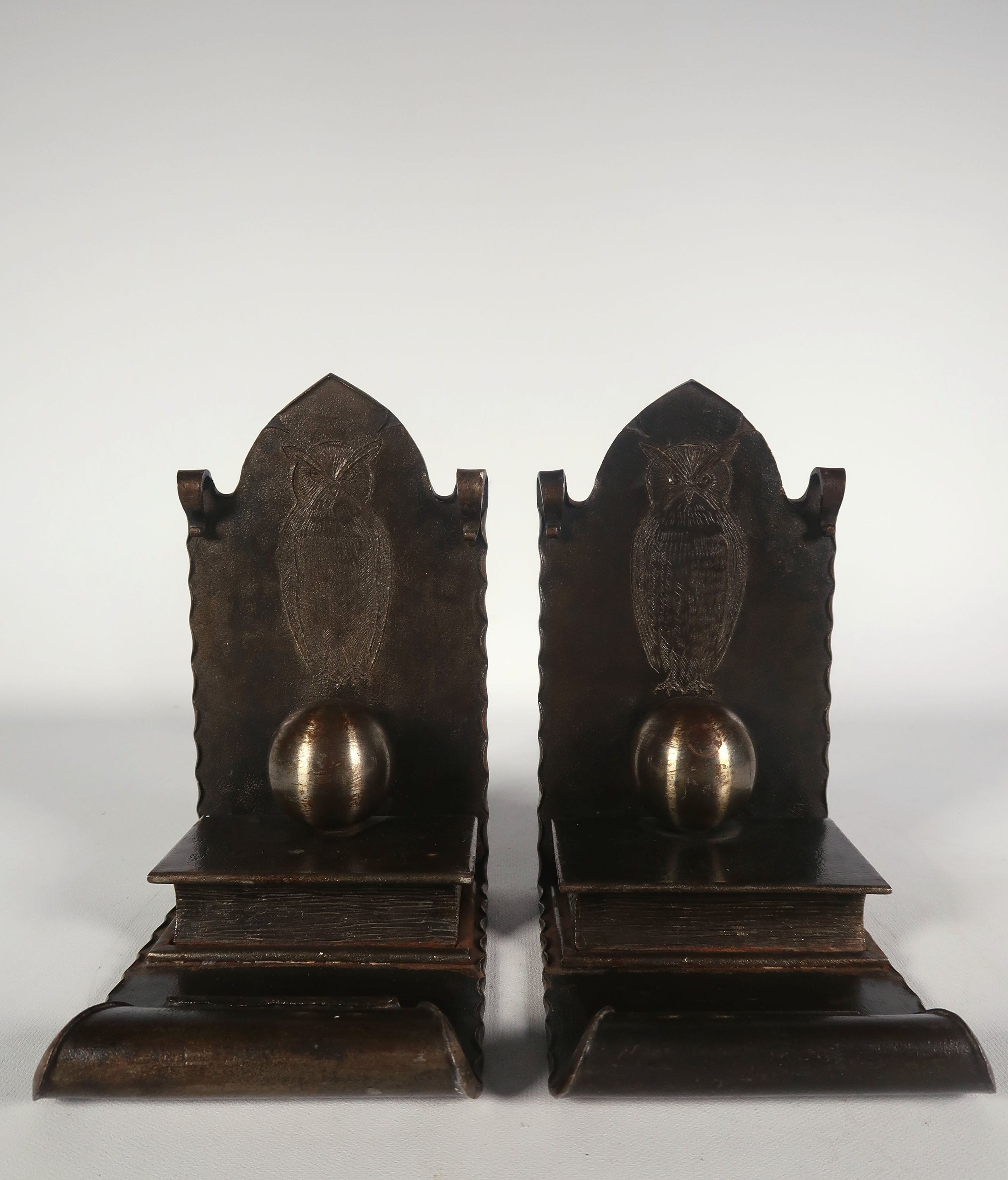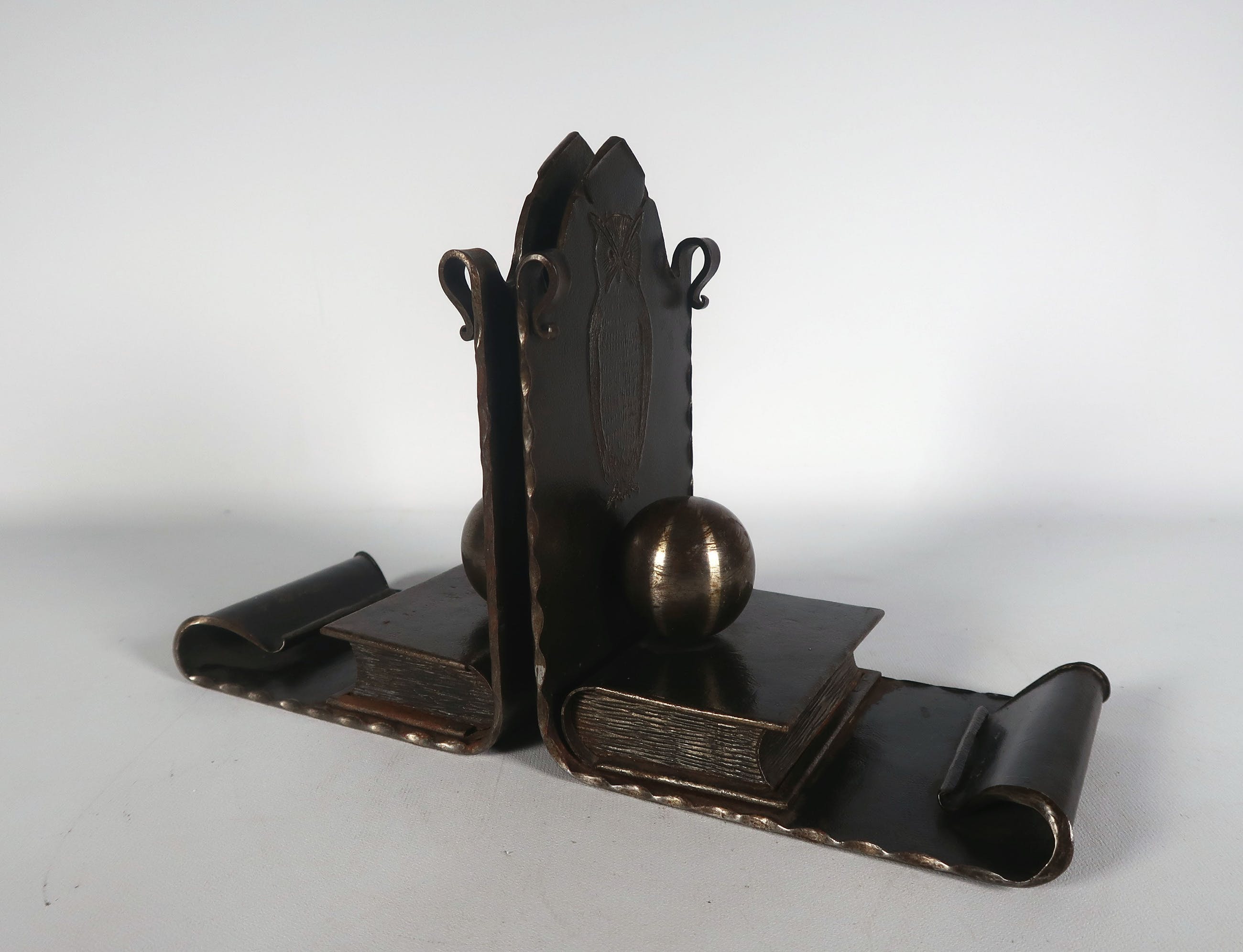 Een set handgesmede metalen boekensteunen met gegraveerde uilen, in de stijl van de Amsterdamse School.