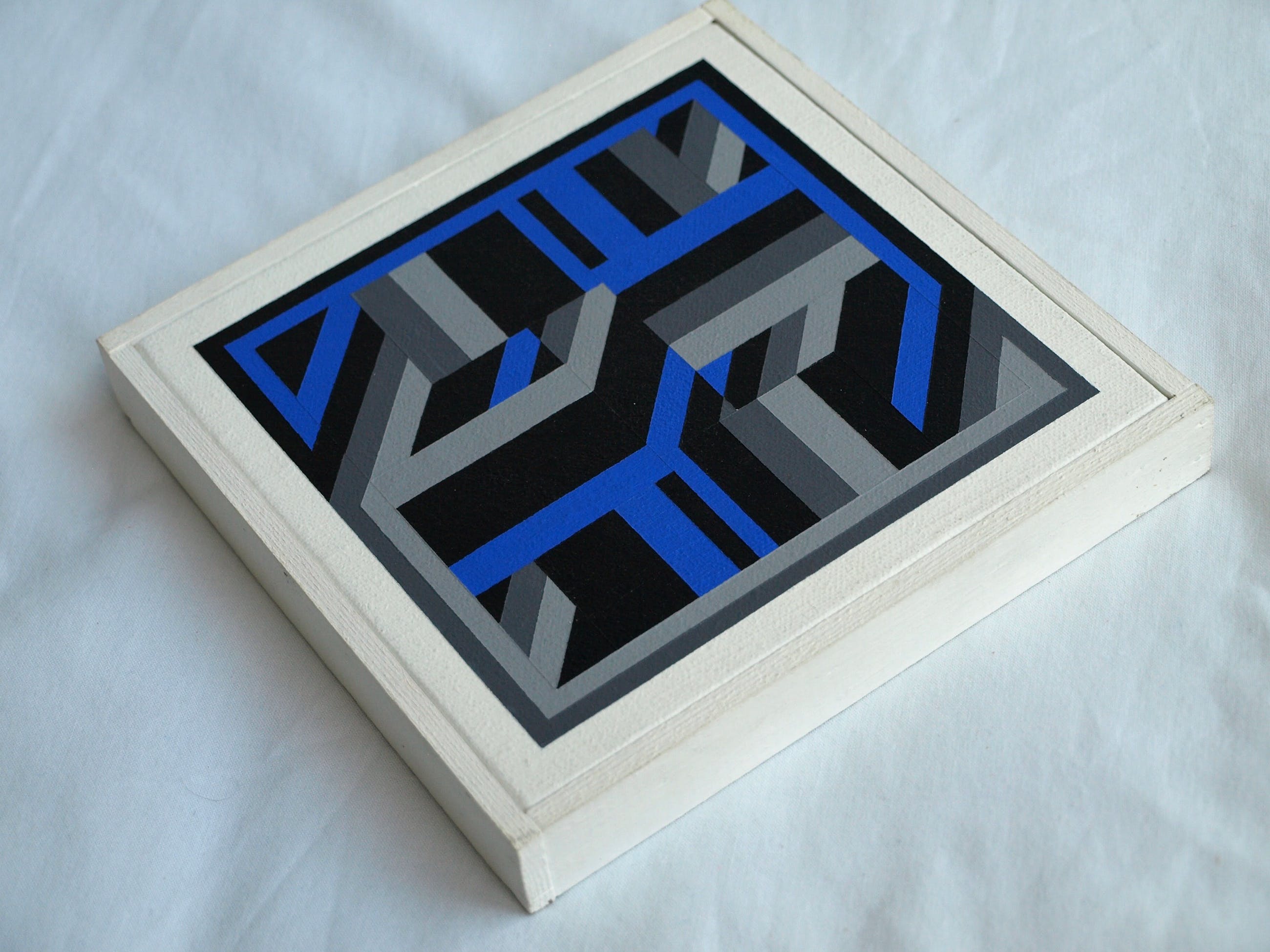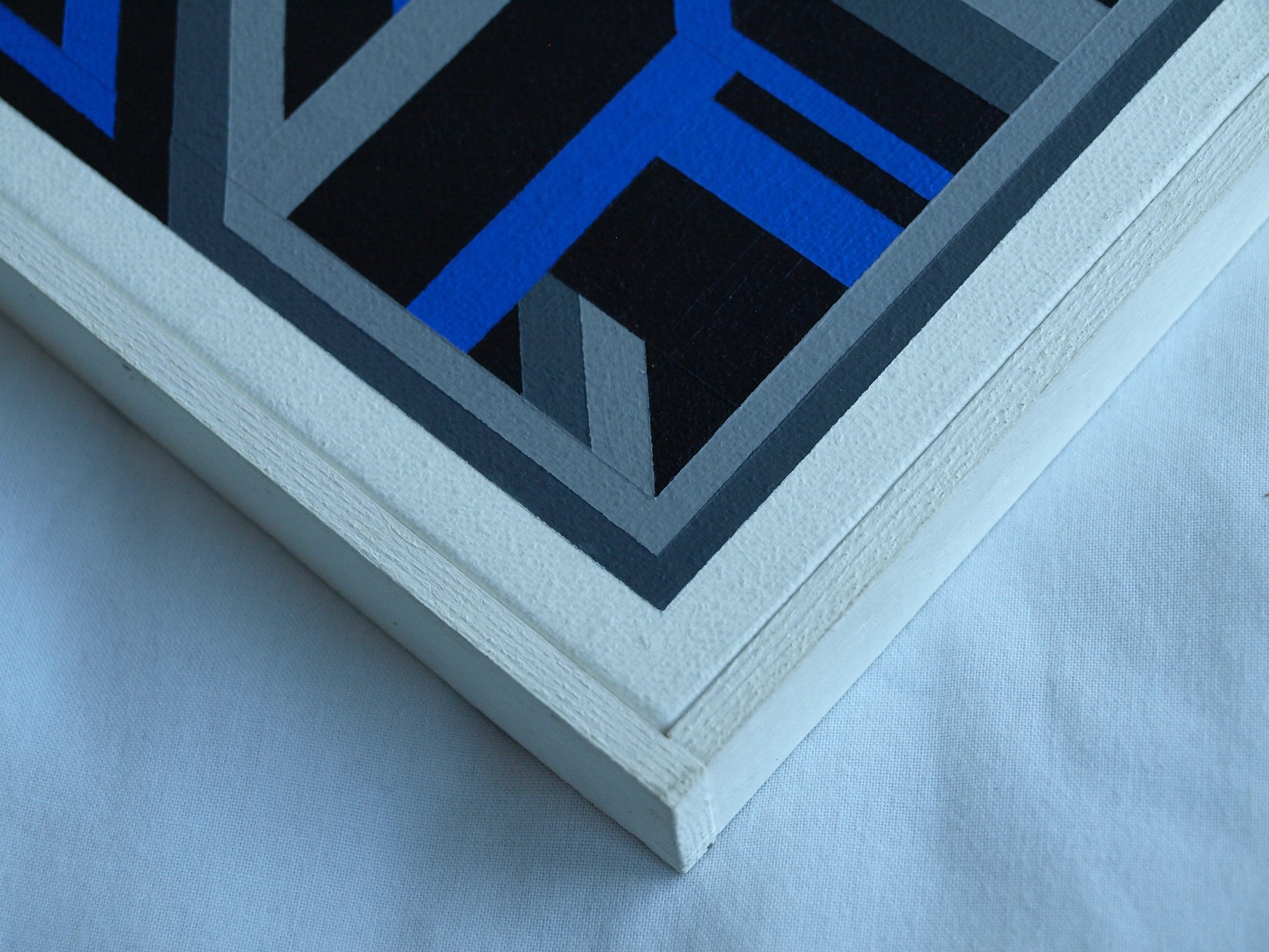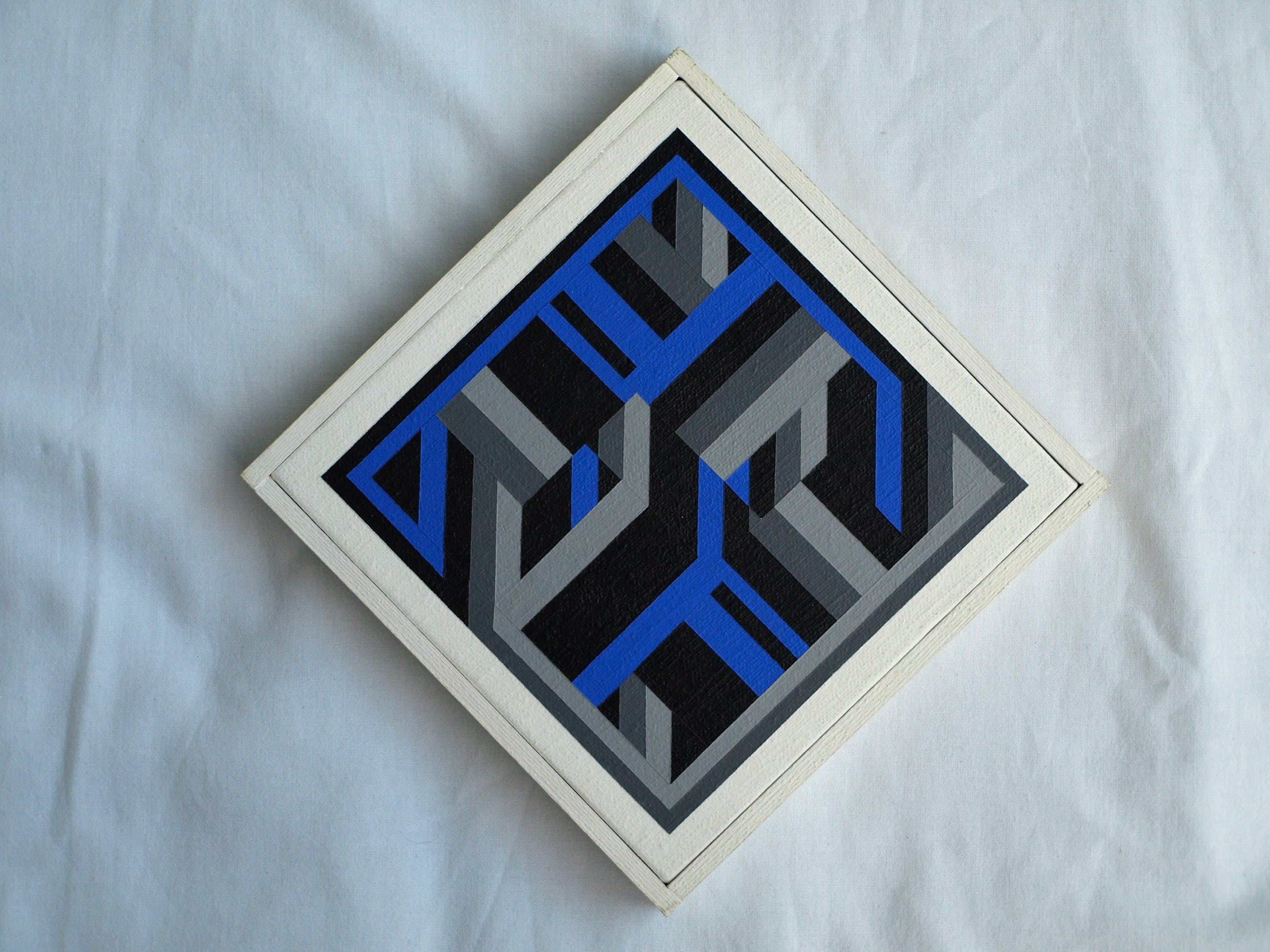 -Geschilderd met acrylverf op doek, gespannen op een paneel. De kunstenaar noemde de manier van schilderen van zijn abstracte, constructivistische werken: “Serial Painting”.