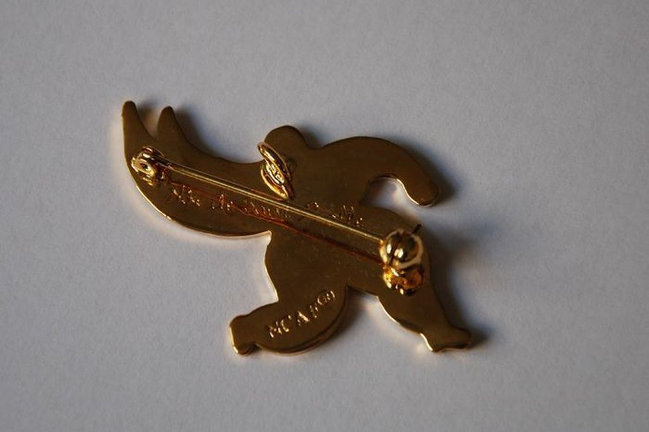 Het sierraad kan als broche en tevens als hanger worden gedragen. Wordt geleverd met bijbehorende originele ketting en in het bijbehorende originele fluwelen sieradenzakje. Afmetingen: 5,0 cm x 3,5 cm. Het sierraad is gesigneerd op de achterzijde en verkeert in nieuw staat(nooit gedragen). Wordt aangetekend verzonden.