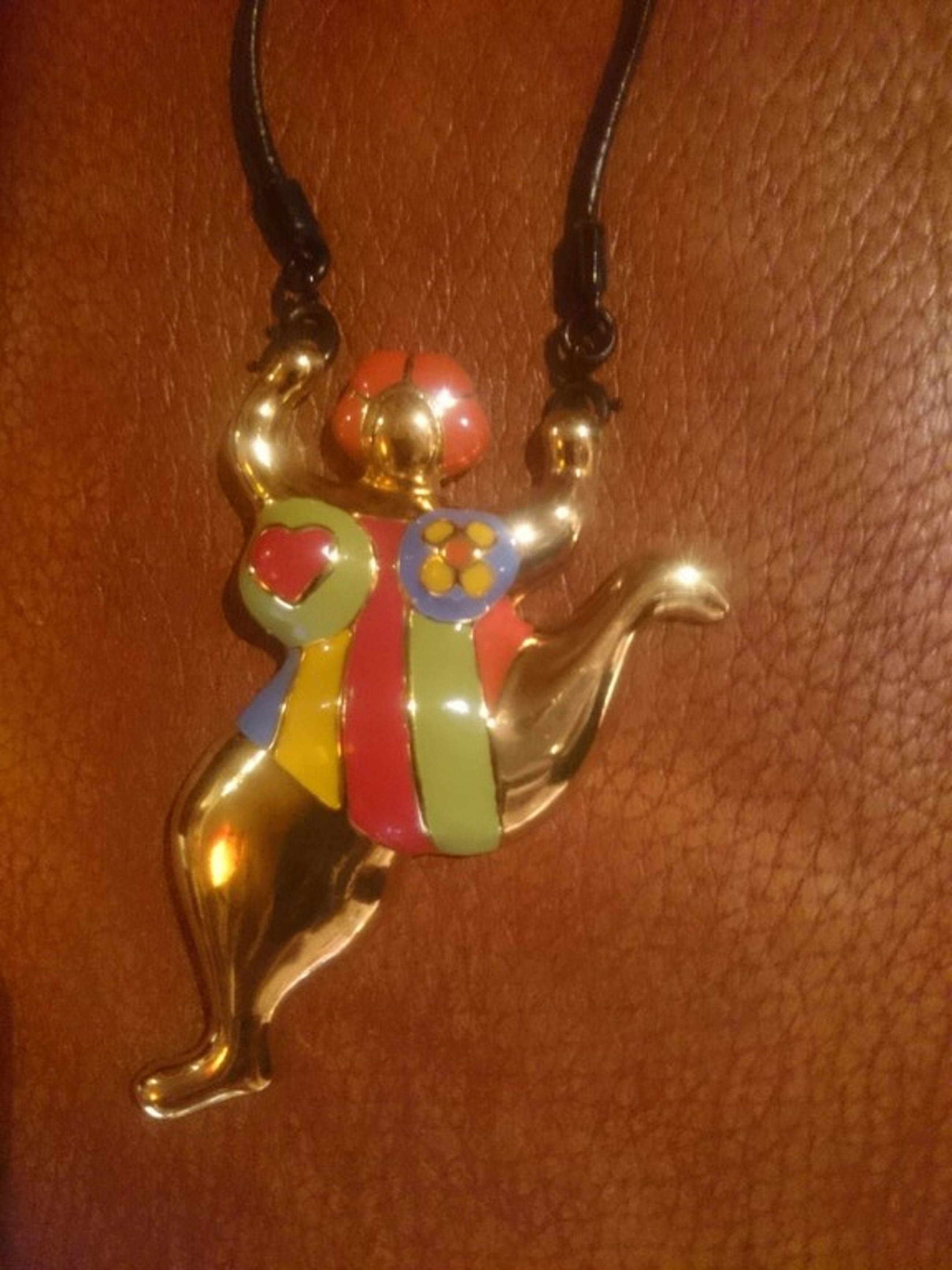 hanger goud metaal en glazuur op lederen band met stoffen etui