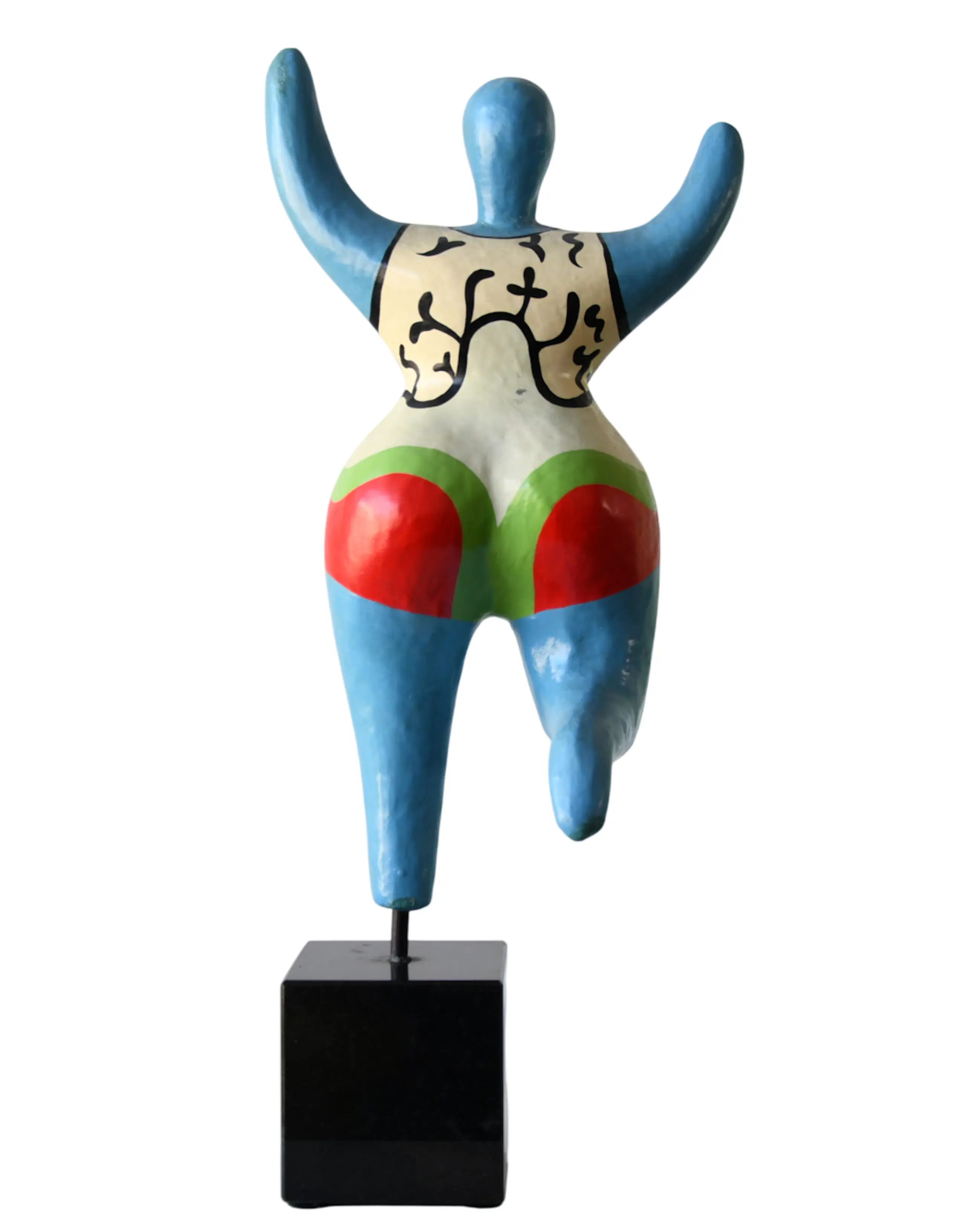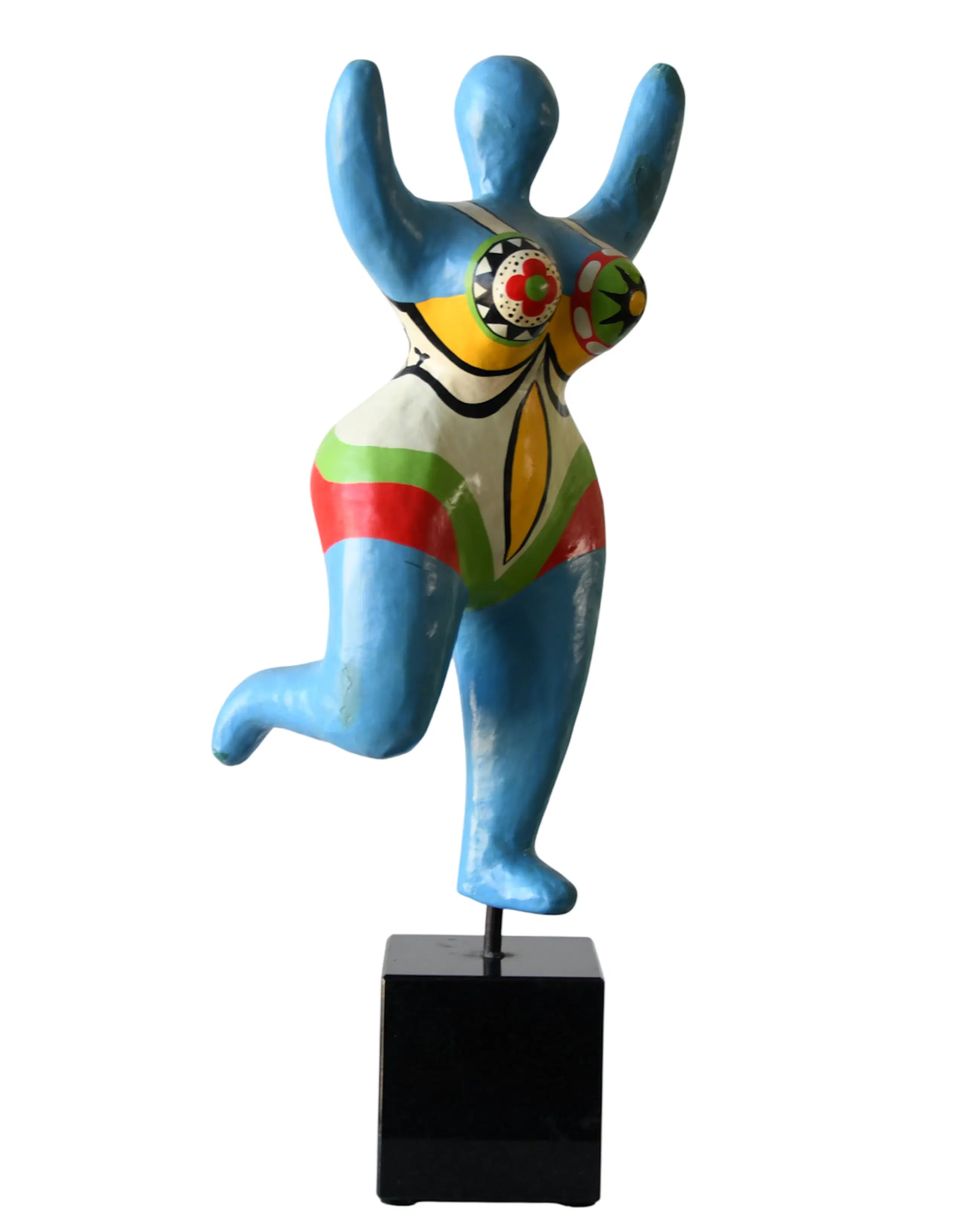 Een prachtige vrolijke gekleurde vrouwelijke sculptuur op een marmeren sokkel met een houten stang waar het sculptuur "Nana" op rust, gemaakt van papier-maché en hand vervaardigd geschilderd, en toegeschreven / naar de Frans-Amerikaanse kunstschilderes en beeldhouwster Niki de Saint Phalle (1930-2002).