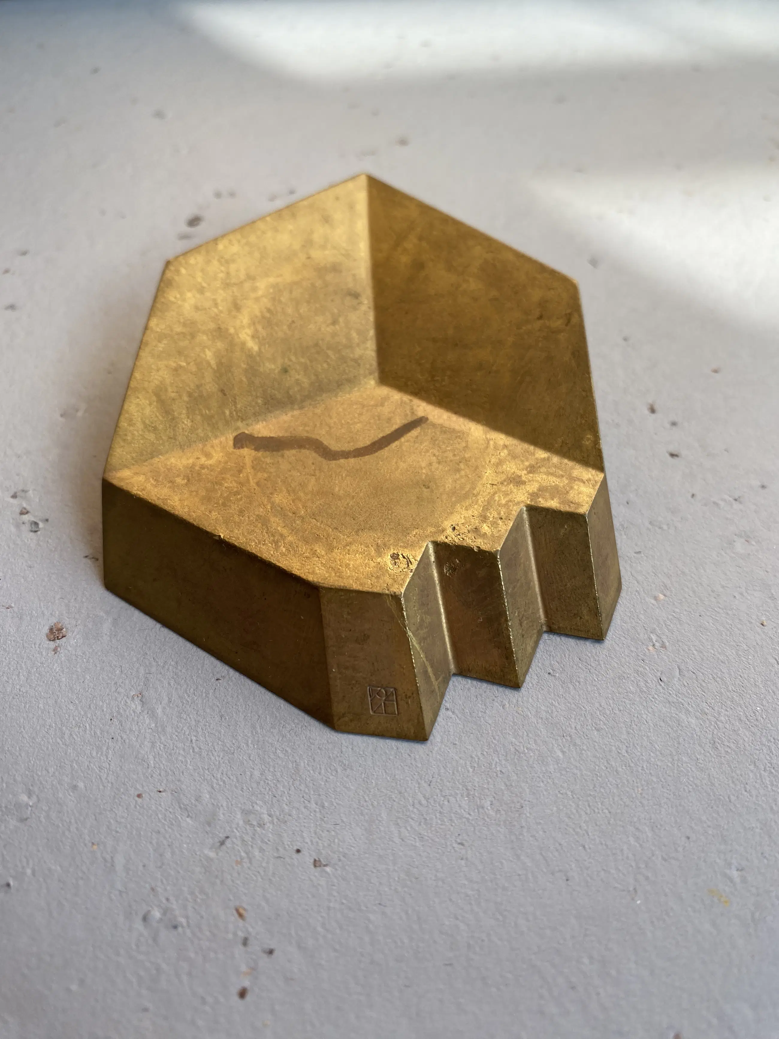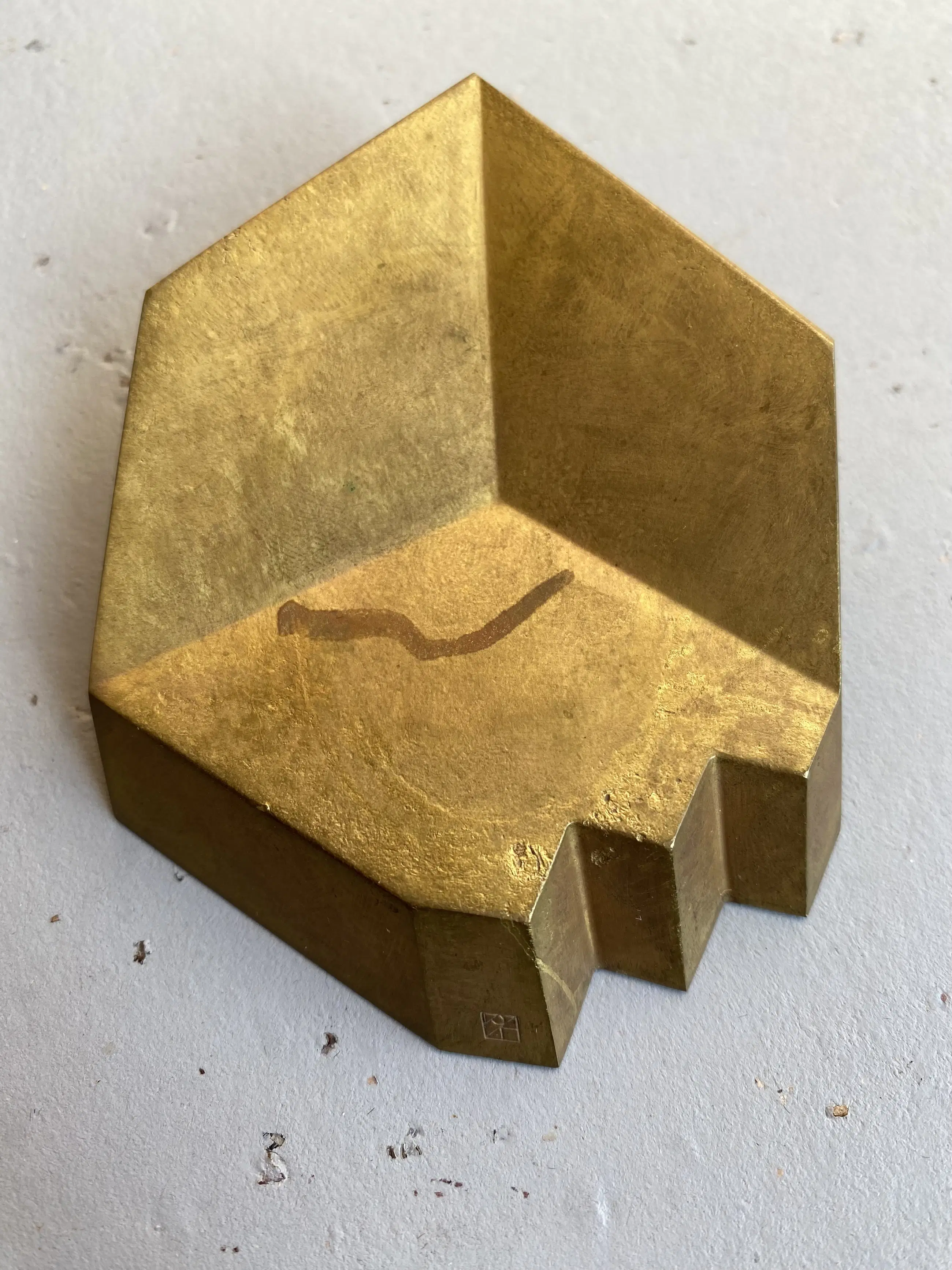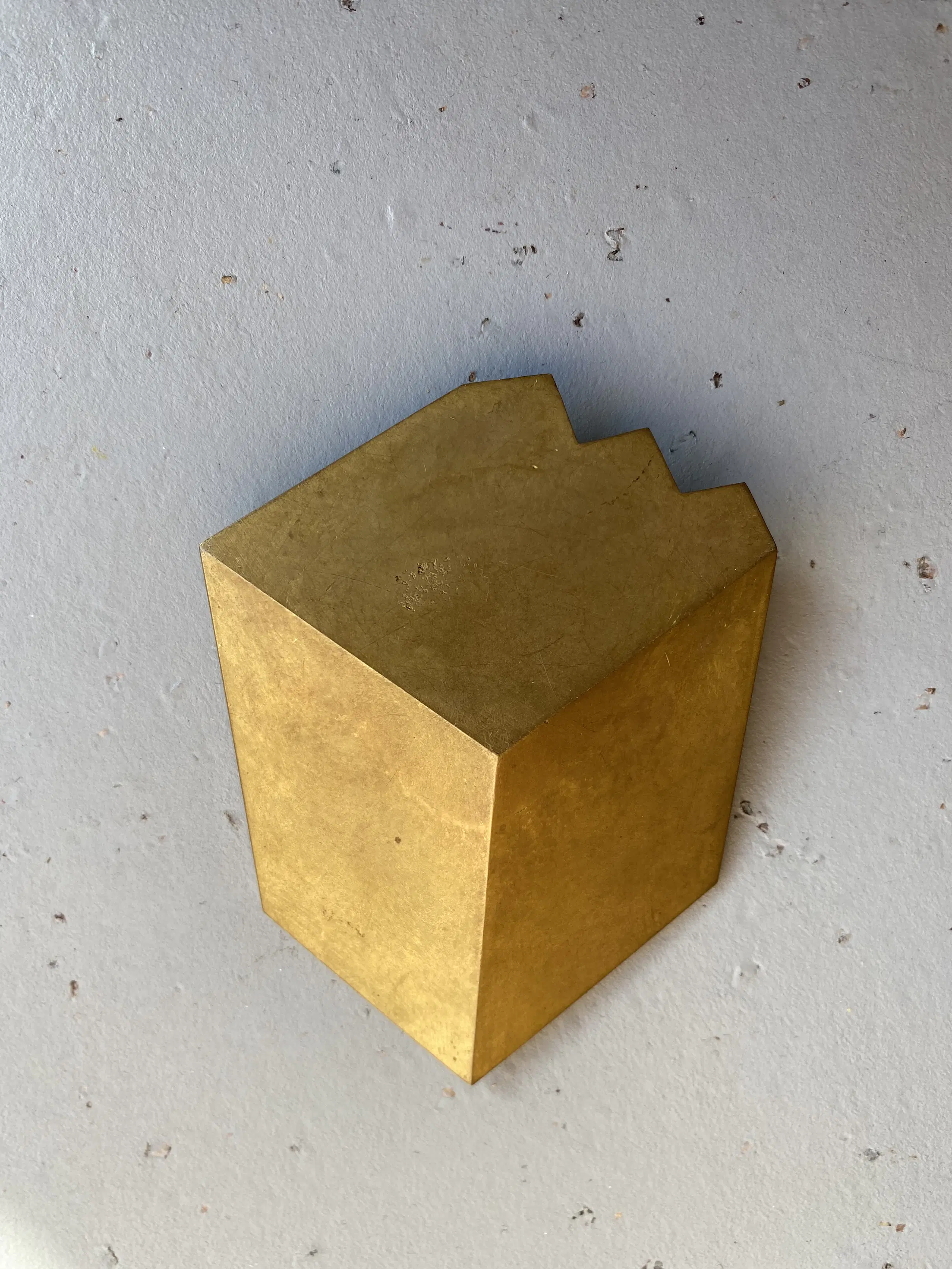 Details • Kunstenaar: Niko de Wit (geb. 1948) • Titel: Getrapt blok • Jaar: 1990 • Serie: Jaarpenning Vereniging voor Penningkunst (VPK) – nr. 1 van 1990 • Materiaal: messing • Afmetingen: ca. 90 × 69 × 22 mm • Producent: Fa. van de Wetering, Boxtel