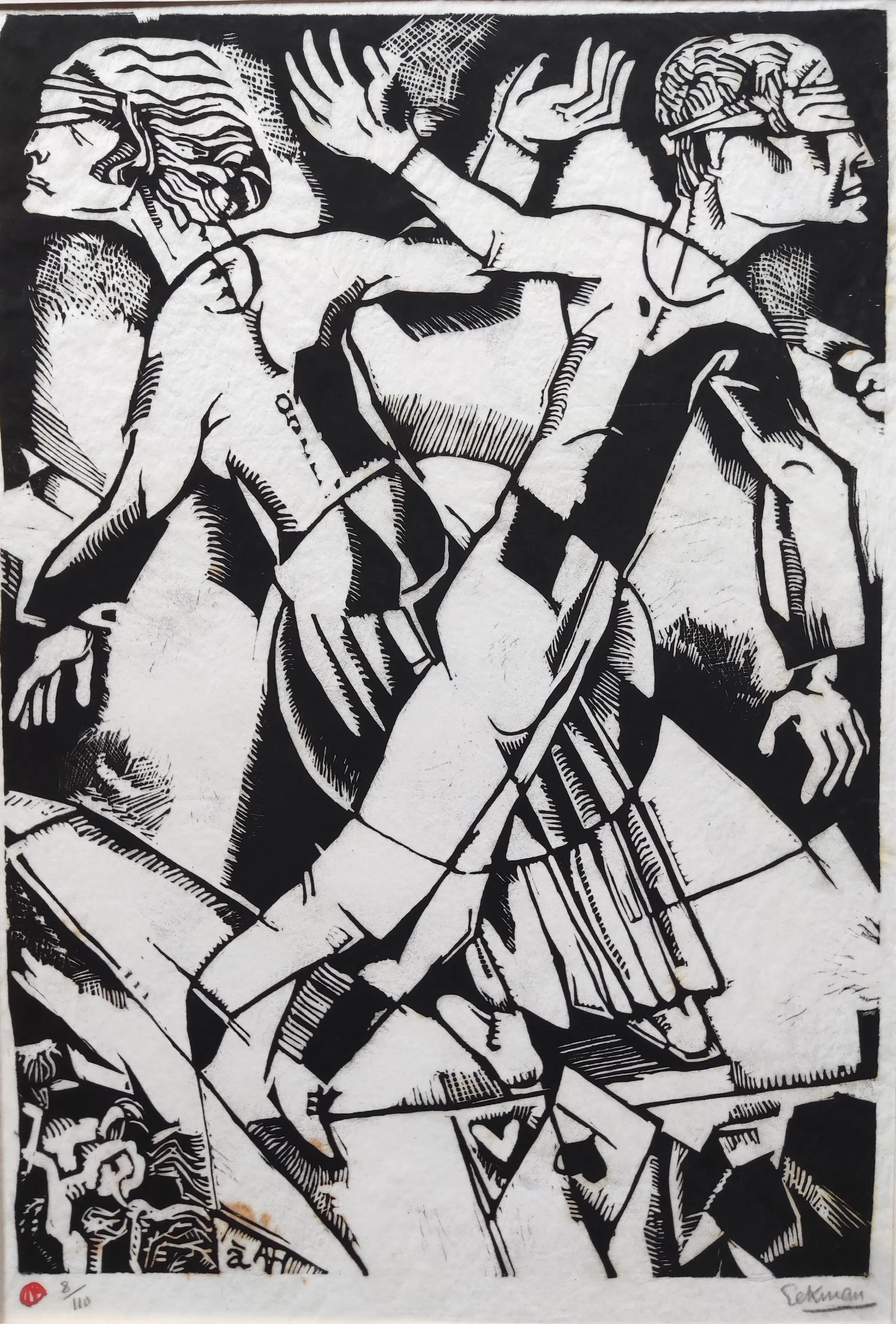 Mooie grote houtsnede op dun papier onder papieren passe-partout getiteld "Colin-Maillard" (Blindemannetje).