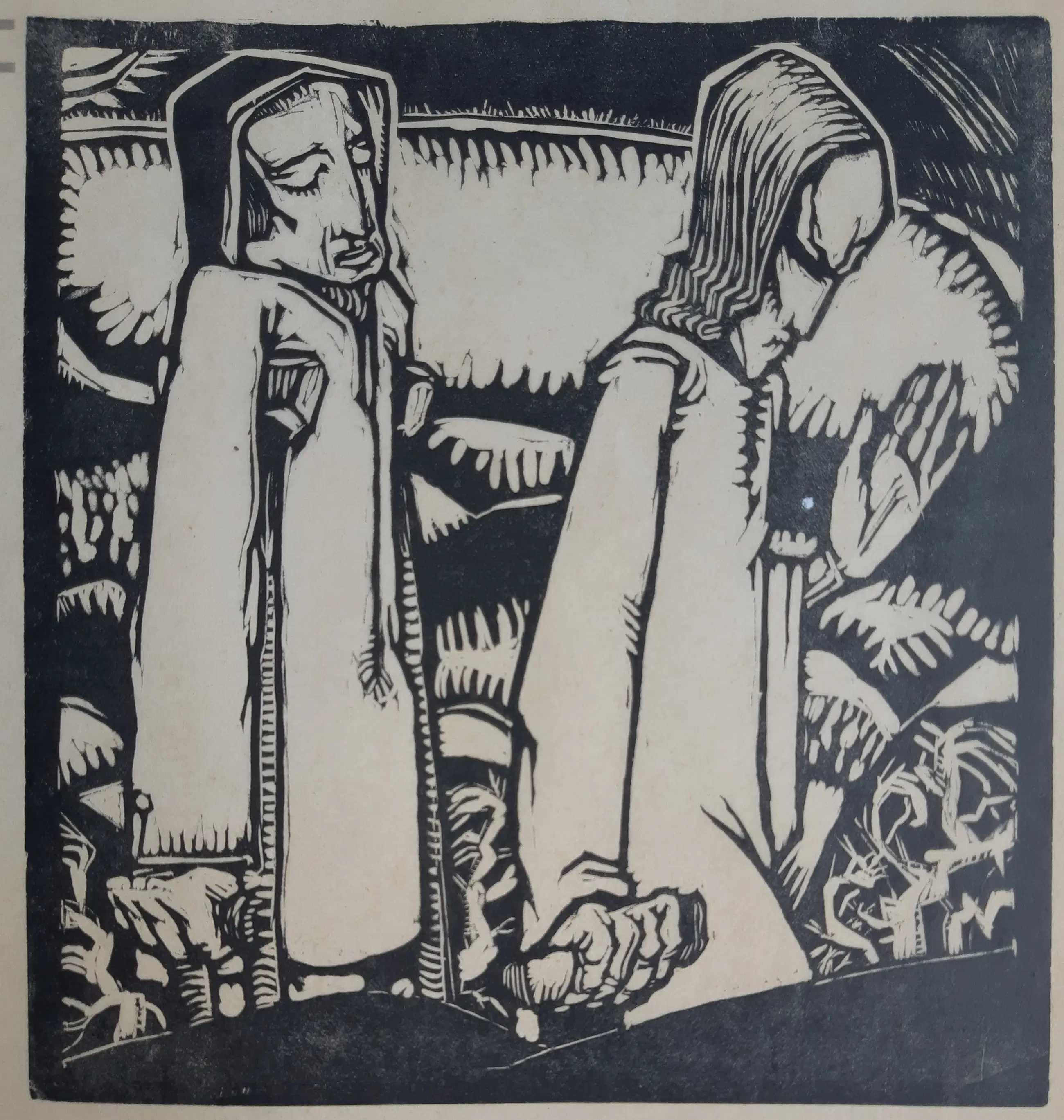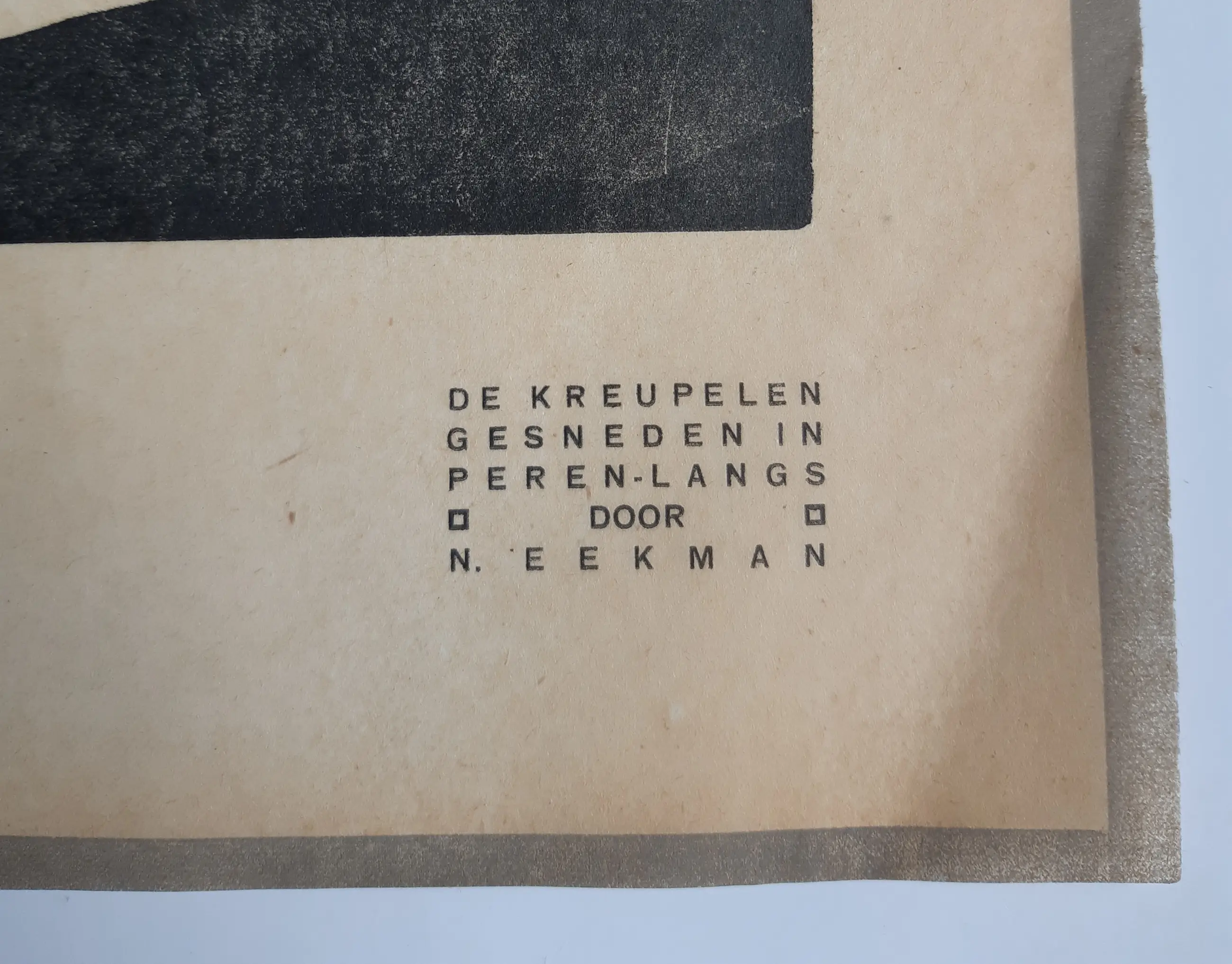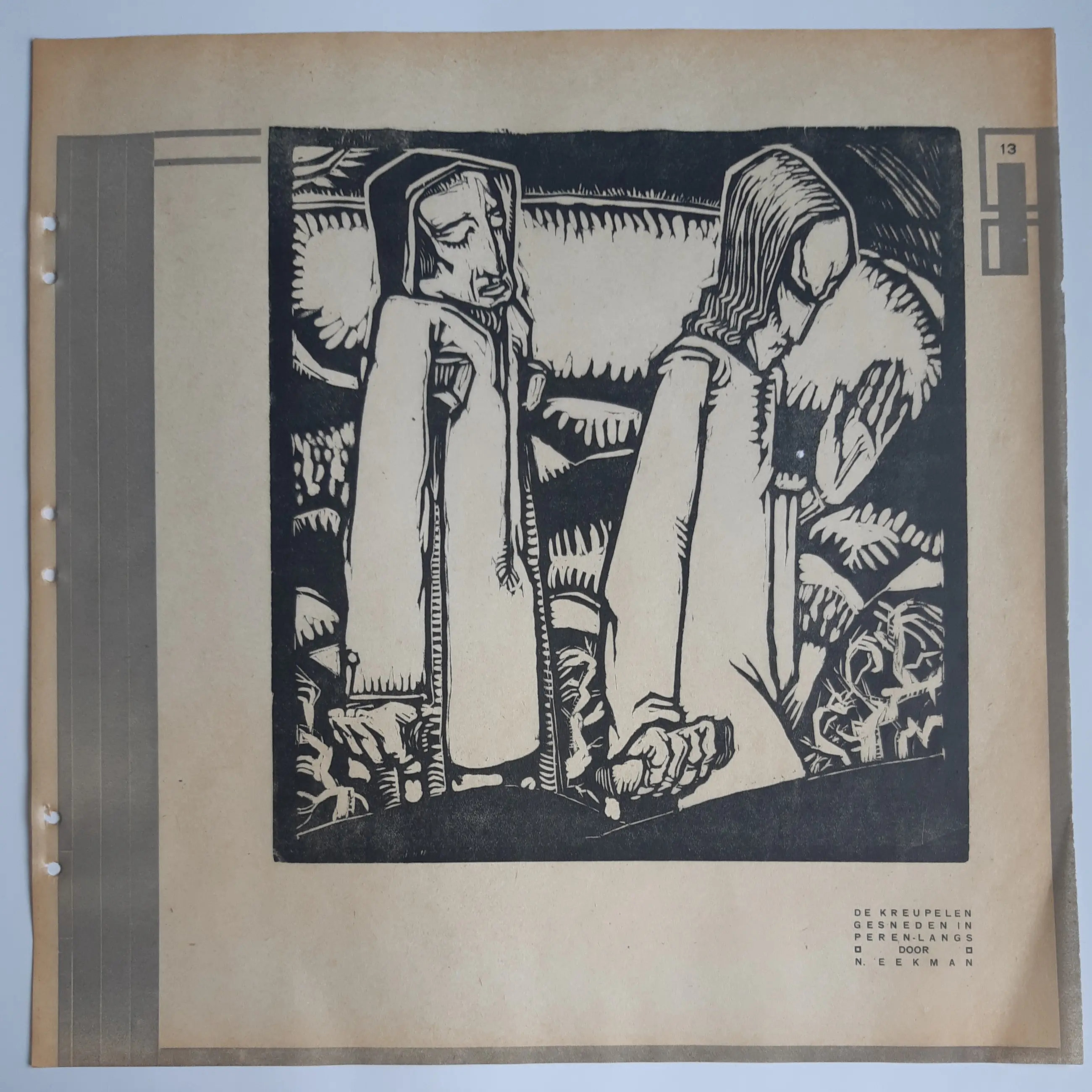 Nico Eekman maakte voor het beroemde houtsnijdersnummer van het tijdschrifte Wendingen 2 houtsnedes met dezelfde titel. Dit is een exemplaar van pagina 13, de andere staat op pagina 12. Gesneden in peren-langs en afgedrukt op flinterdun Japans papier. De kwaliteit is, zeker gegeven de leeftijd goed, er is sprake van lichte vergeling langs de randen van het blad (zie foto's).