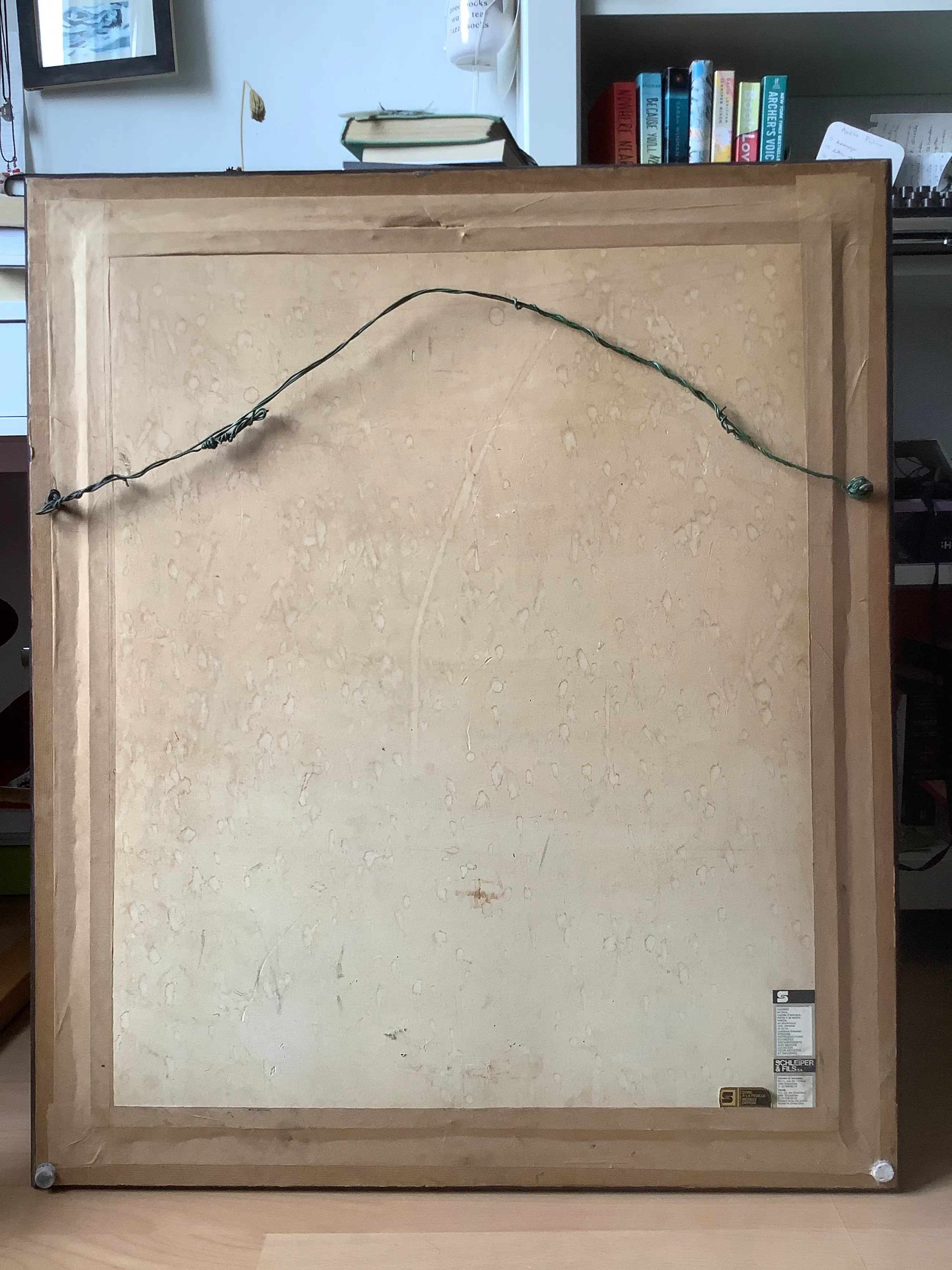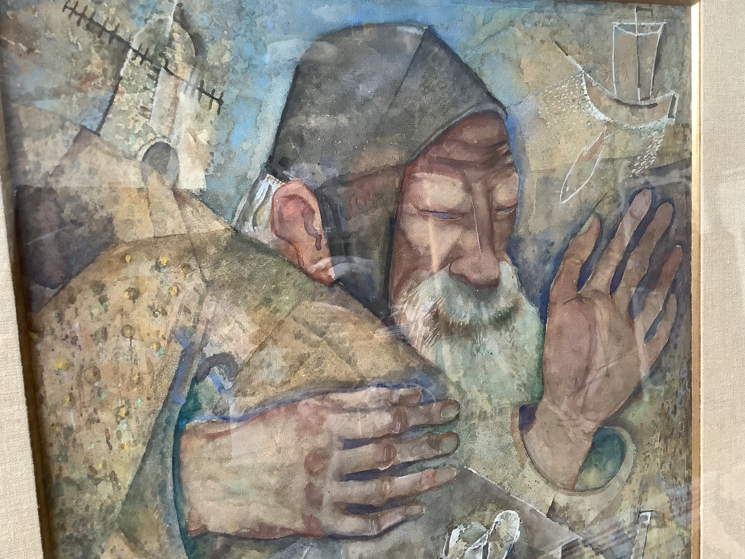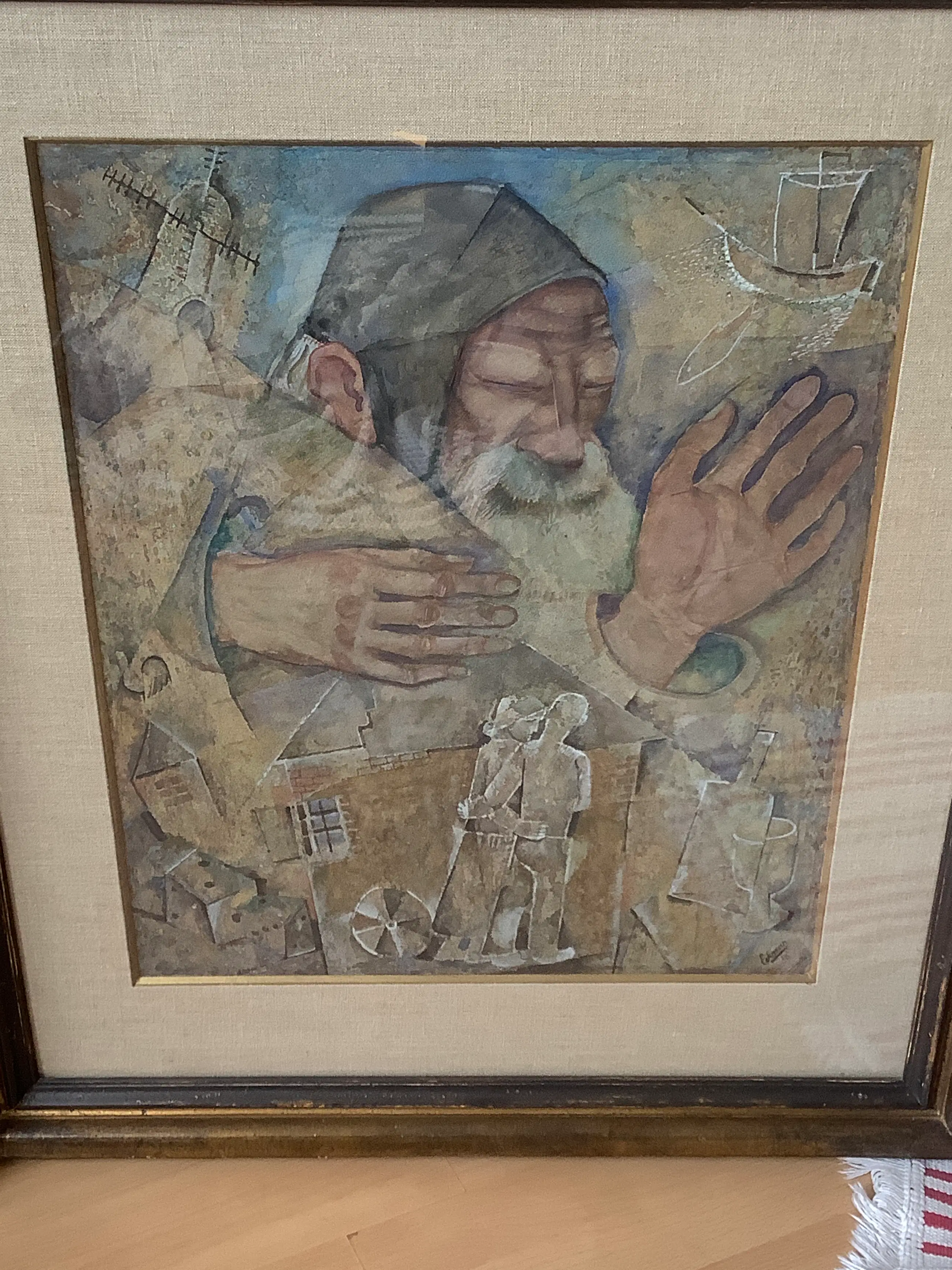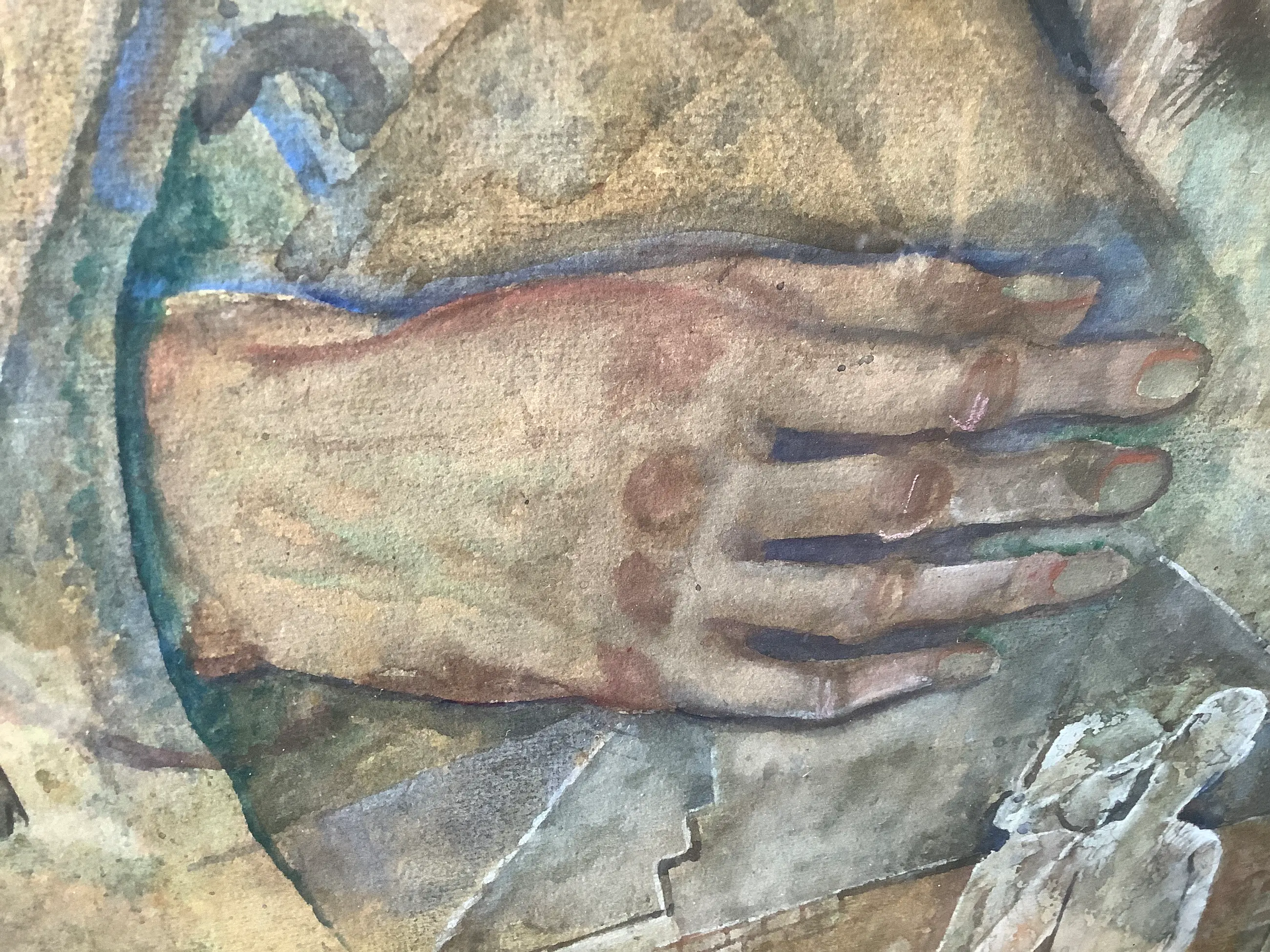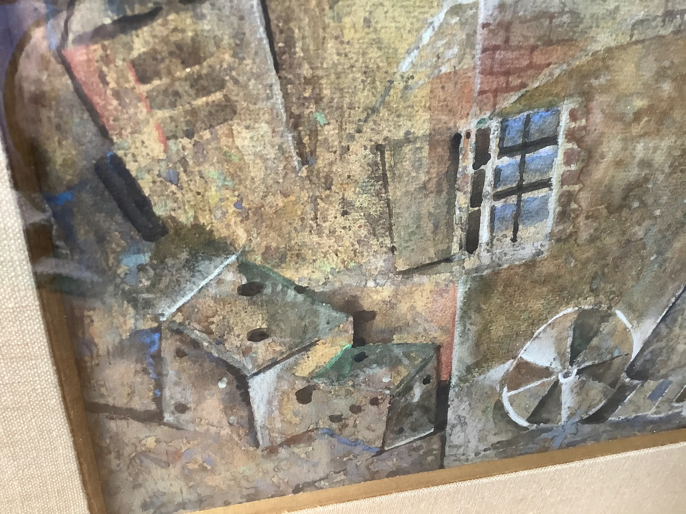 Over het exacte type gebruikte verf en/of techniek, alsook de drager ben ik onzeker. Ik vermoed eerder waterverf op dik papier. De onderliggende structuur van de drager is te zien op de detailfoto’s. Het werk is echter ingelijst en daardoor is dit moeilijk fysiek te controleren. Zie foto’s (er is wel redelijk veel reflectie op het glas).
