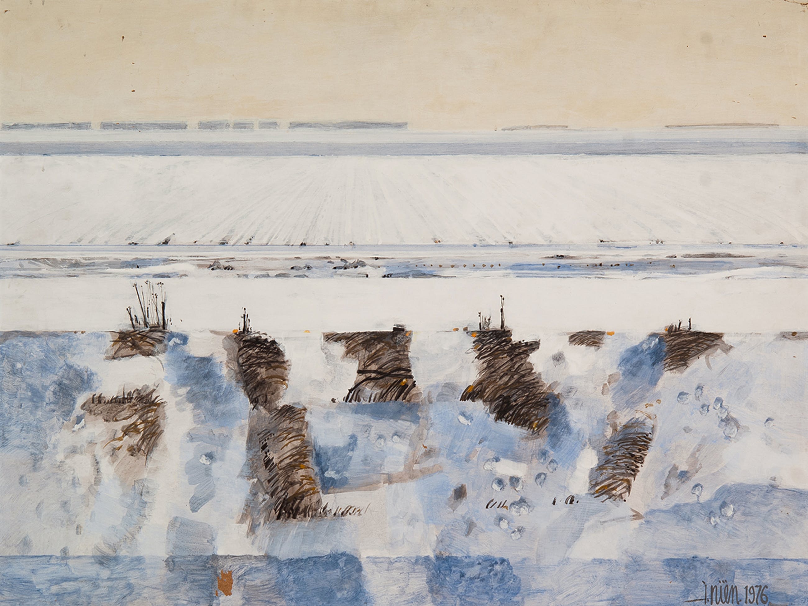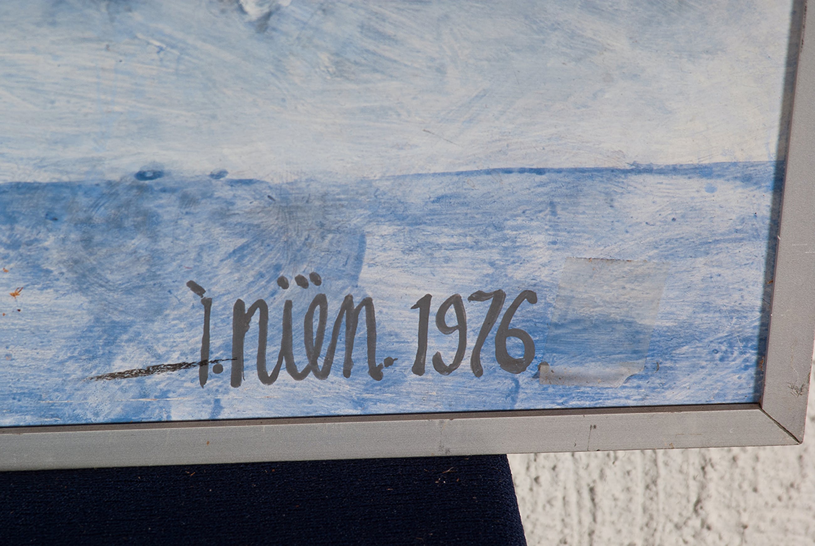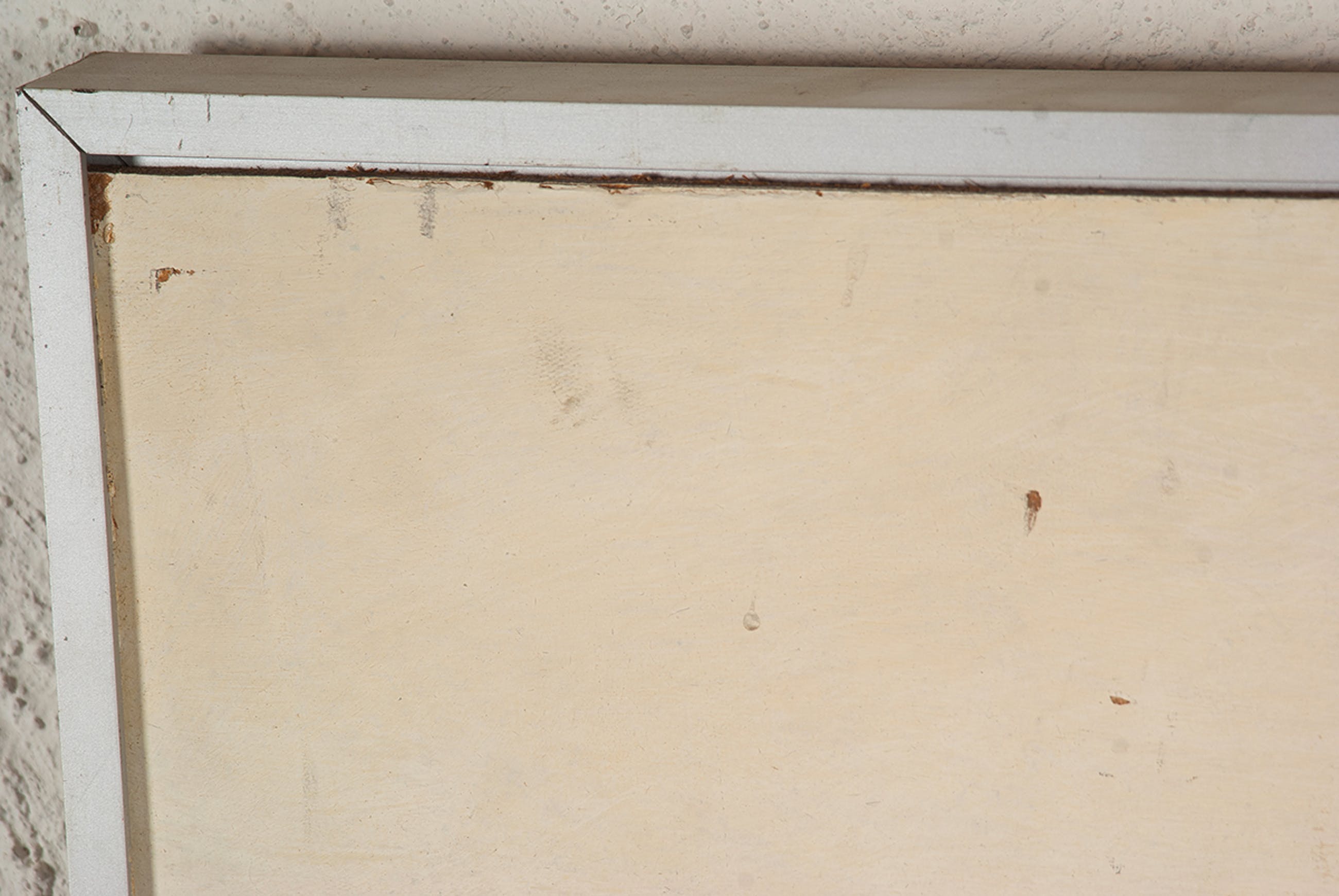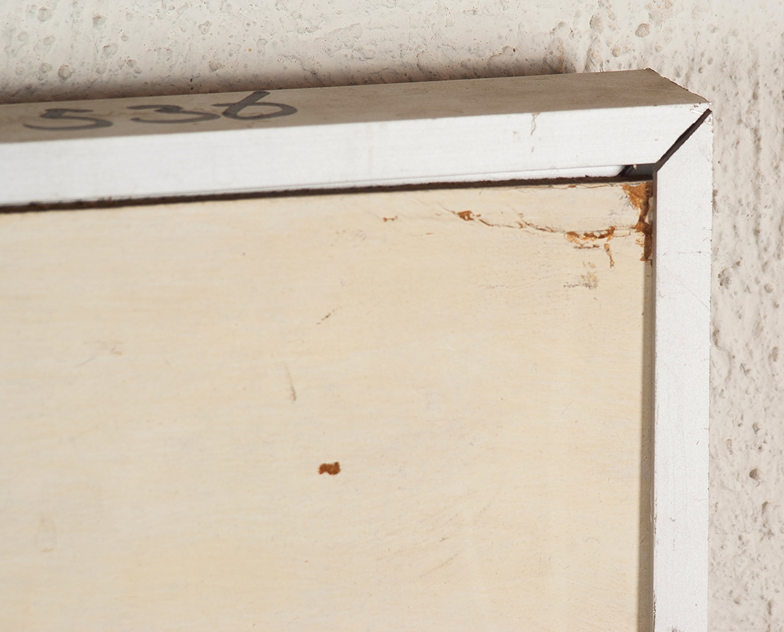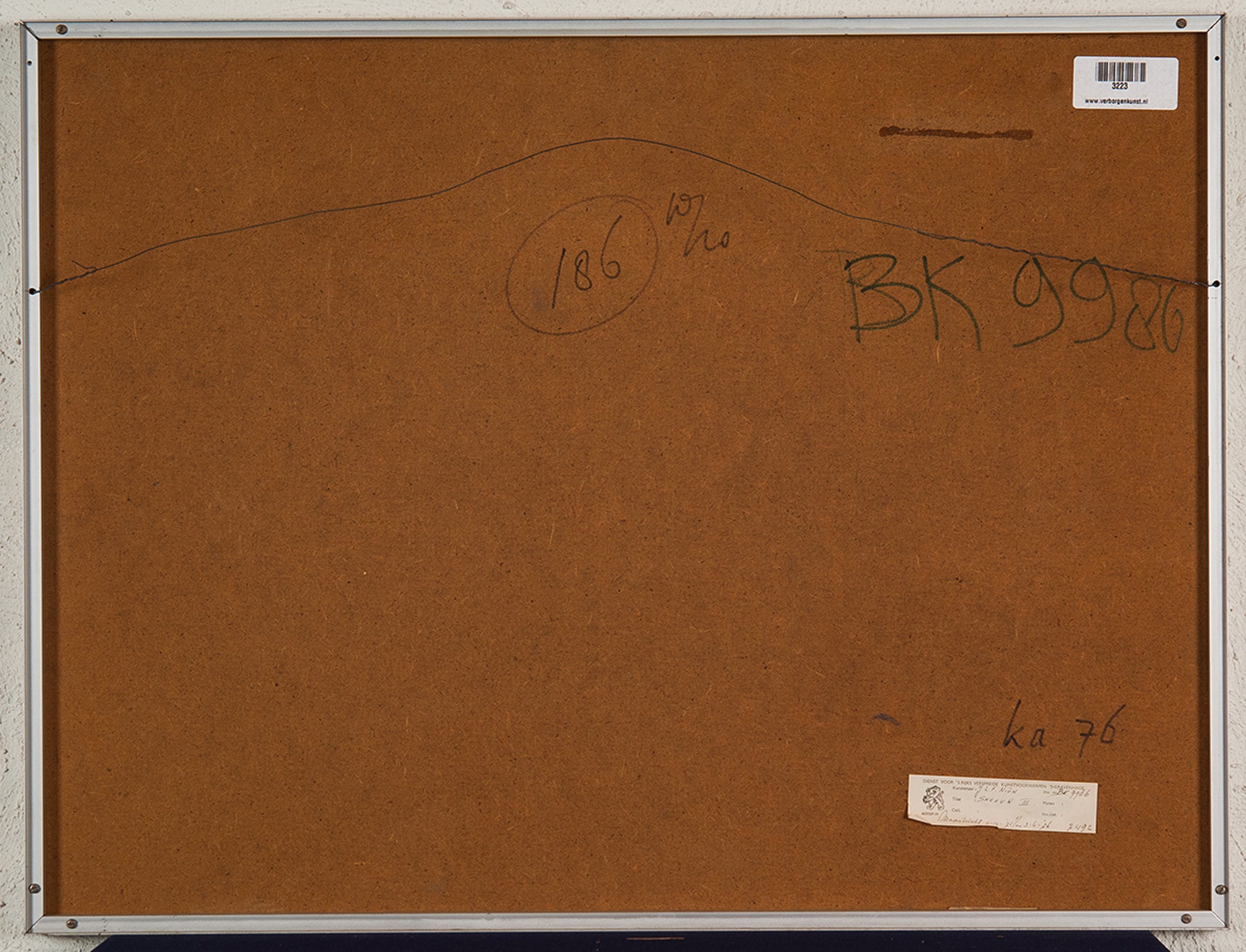 | In matige staat. Verf laat op verschillende plekken los; dit is het meest zichtbaar linksonder. De verf is aan de bovenzijde vergeeld met verschillende (vinger)vlekken. Ook zit het werk niet goed geklemd in de lijst en is beschadigd aan de bovenzijde. Tot slot heeft er een stuk plakband op het werk gezeten, rechts van het signatuur, deze is reeds verwijderd. | |