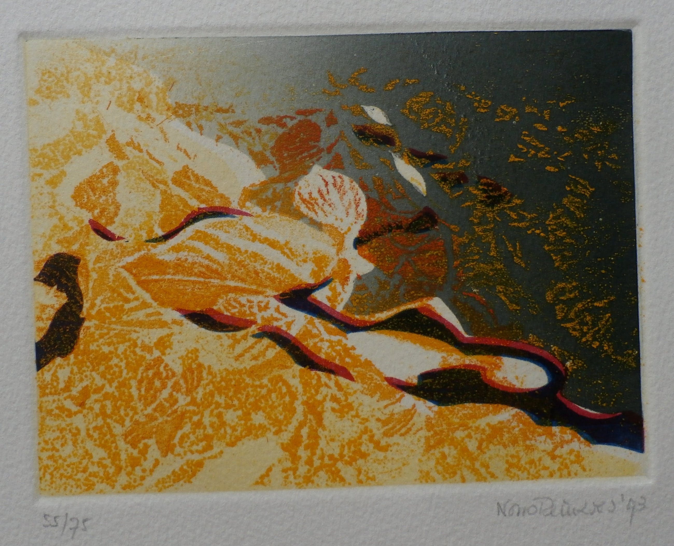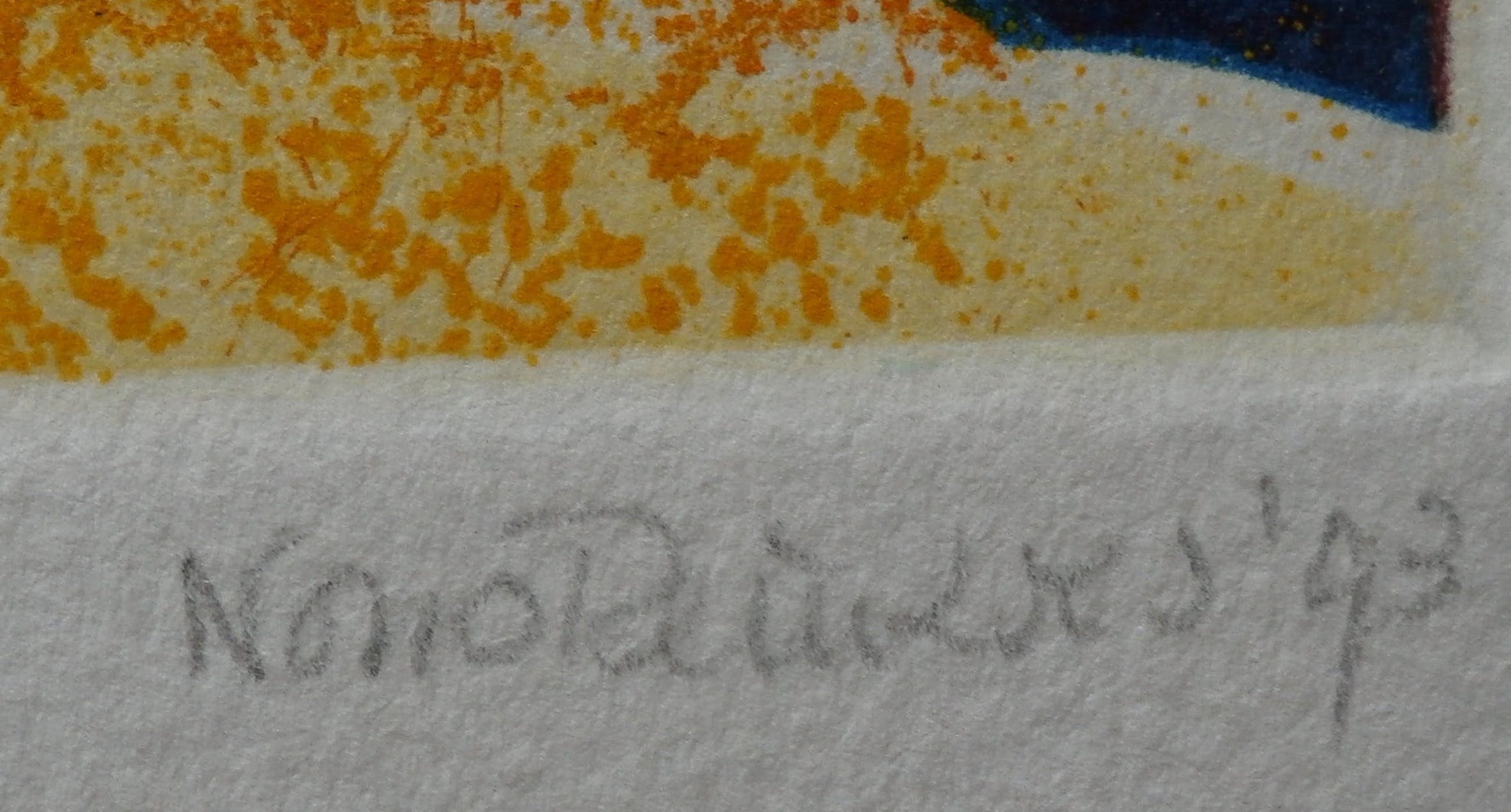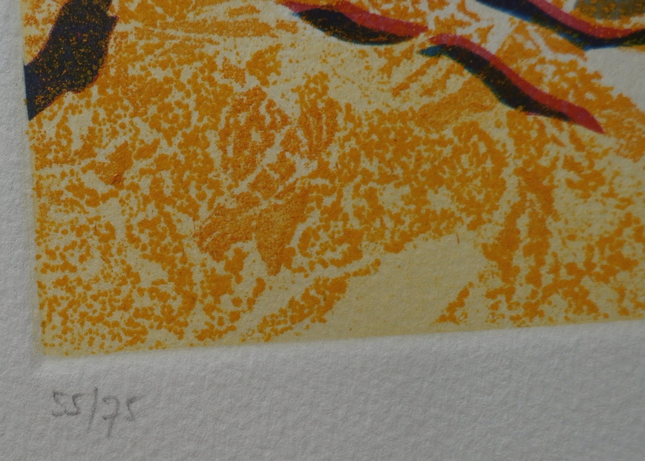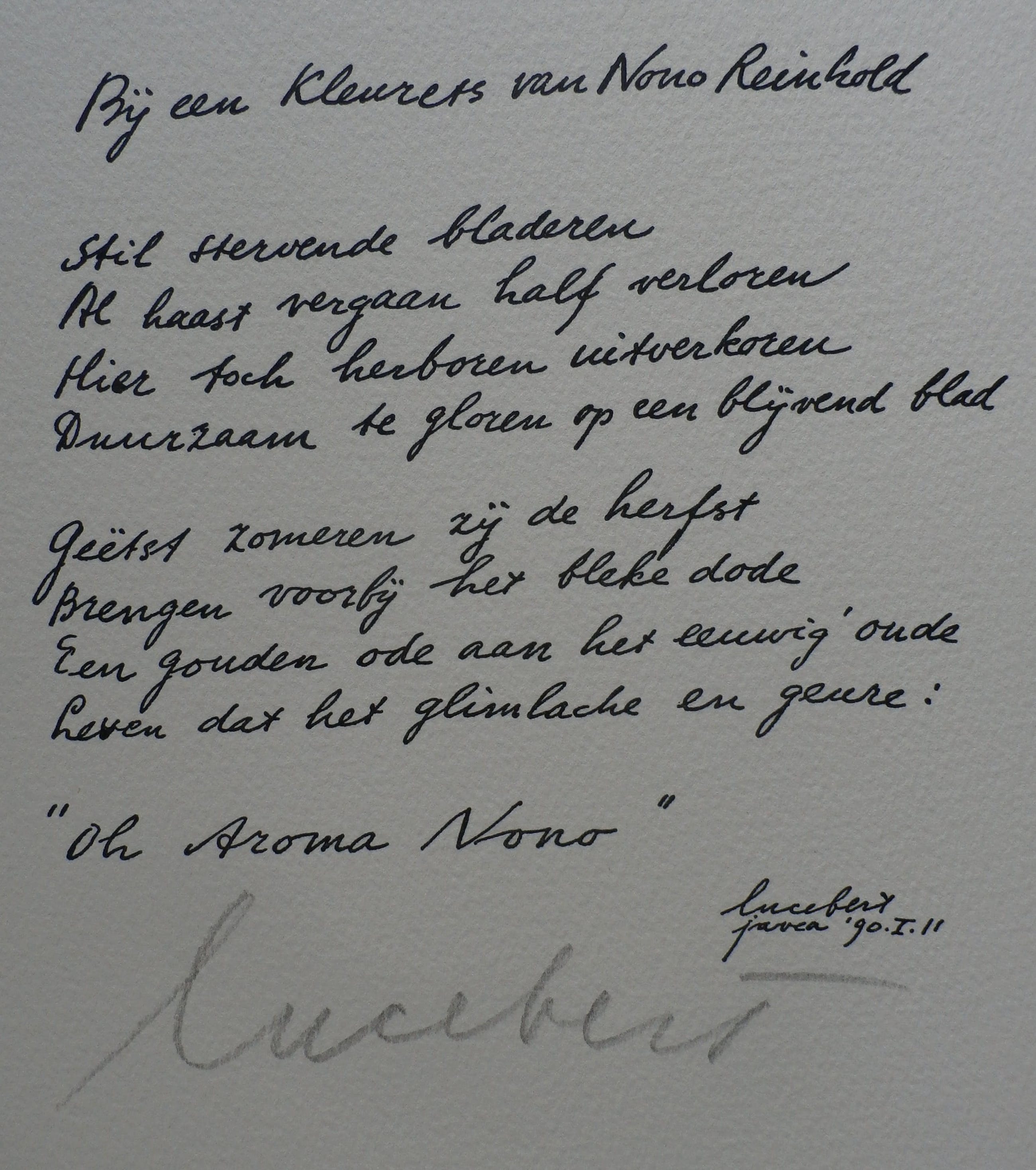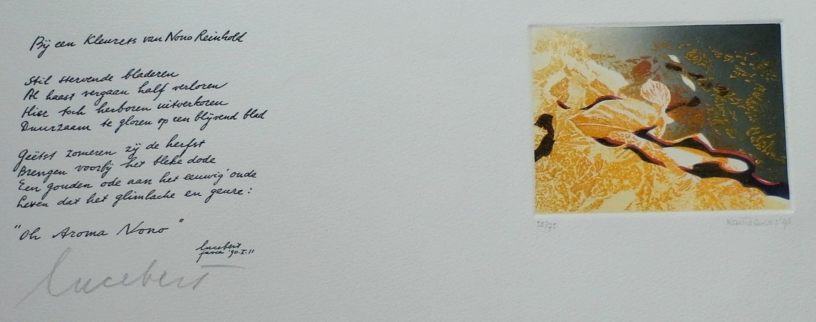 Mooie kleurenets van Nono Reinhold. Bij deze ets is een gedicht van Lucebert met de titel: "Oh aroma Nono". Gedicht en ets zijn gesigneerd. Nummer: 35/75. Afmetingen blad: h50 x b65 cm. Afmetingen ets: h11 x b14 cm.
