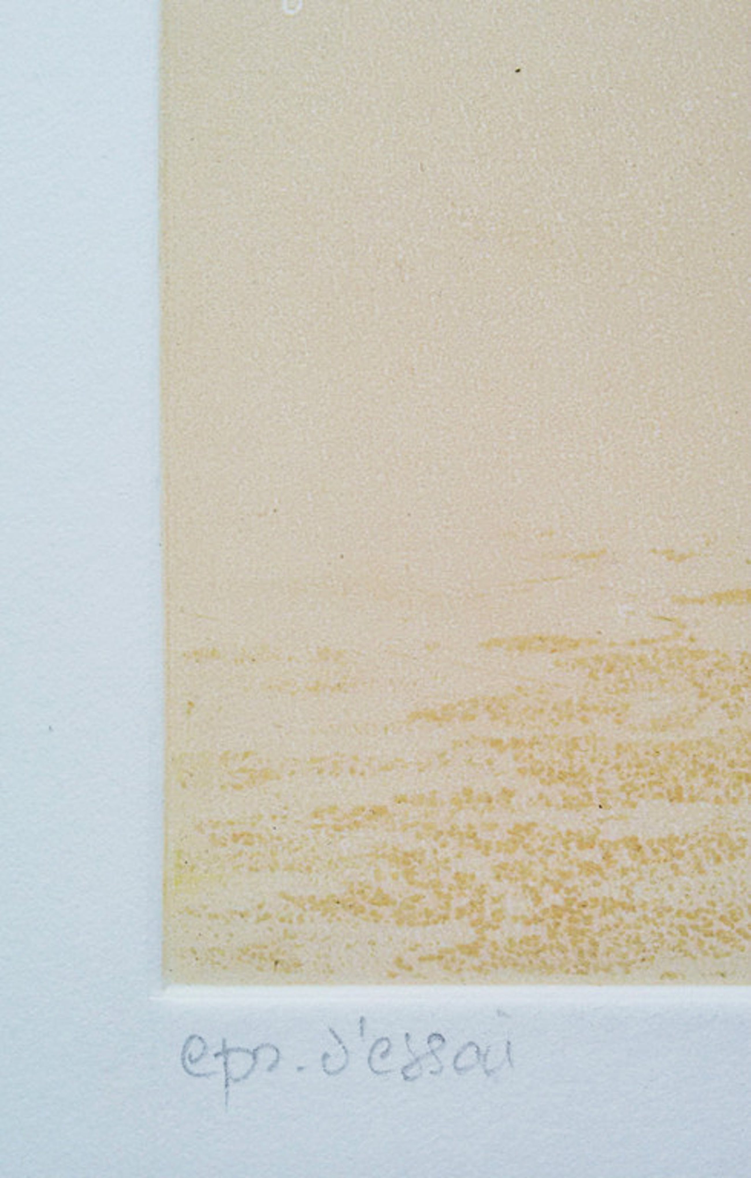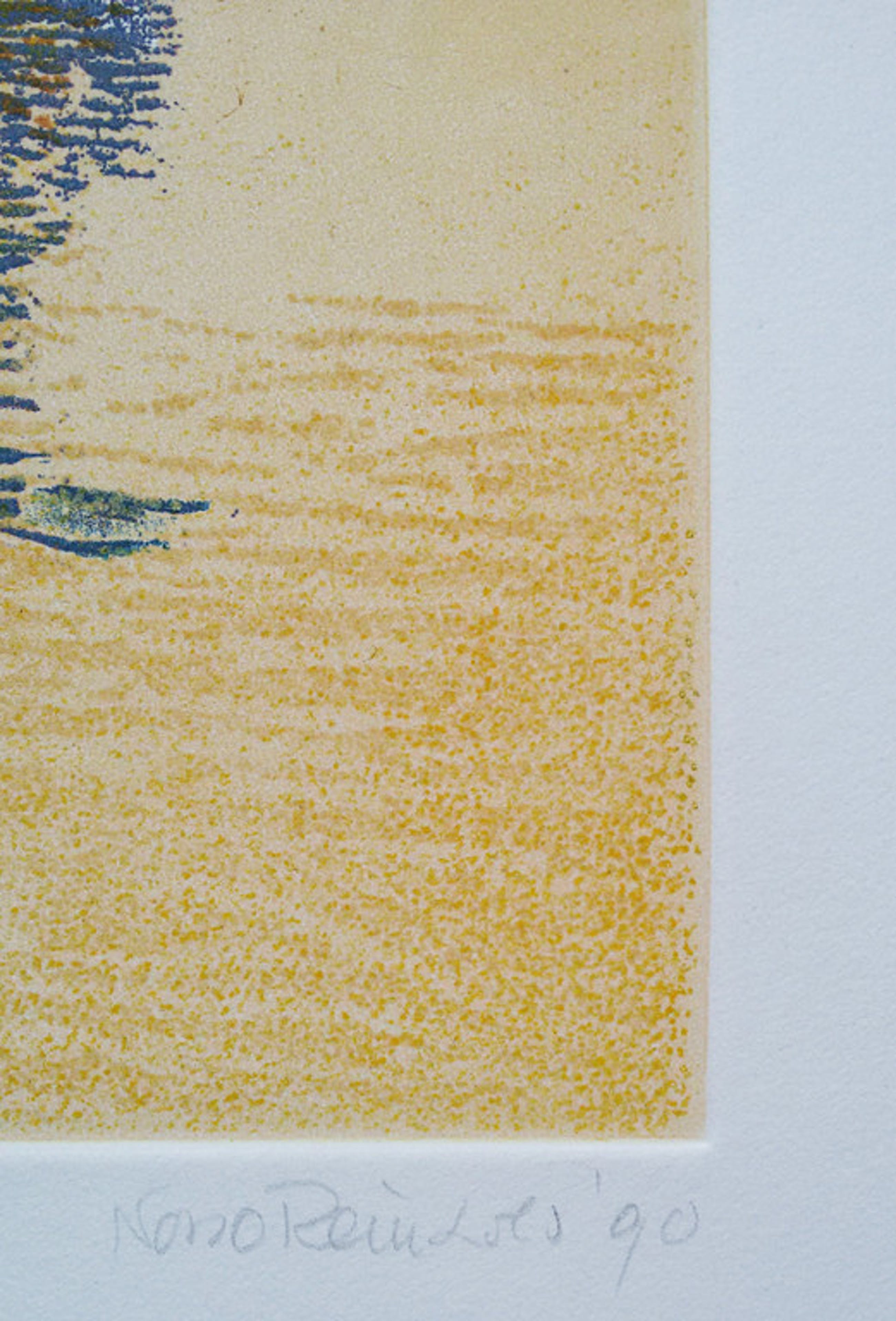 Mooi, intrigerend werk van Nono Reinhold; een soort geabstraheerd plantvormig eiland (zie ik, maar misschien ziet u wat anders). Aquatint ets op geschept papier, met potlood gesigneerd en gedateerd (‘90). Een épreuve d’essai exemplaar, in uitstekende conditie.